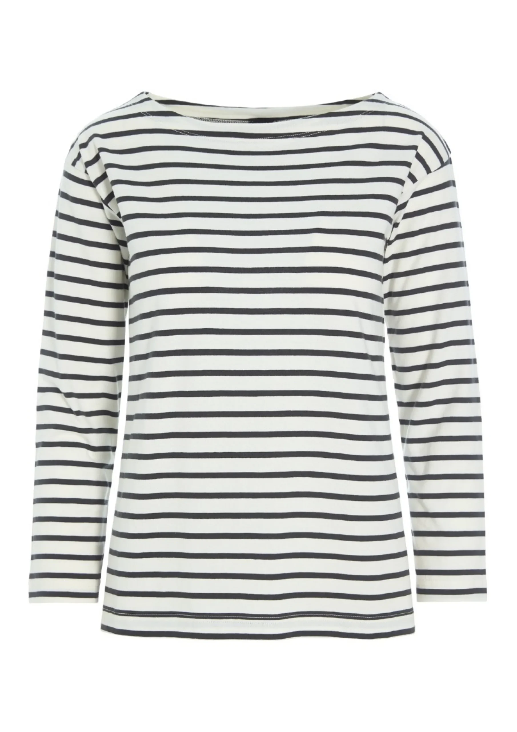 Stribet bluse i blød jerseykvalitet af ren økologisk bomuld. En ægte klassiker, som altid vil være et godt basiselement i garderoben. Blusen har et enkelt, let løstsiddende snit, og den falder klædeligt om kroppen.Modellen på billede er 178 cm og iført str. SFuld længde i str. S, ca. 59 cm.