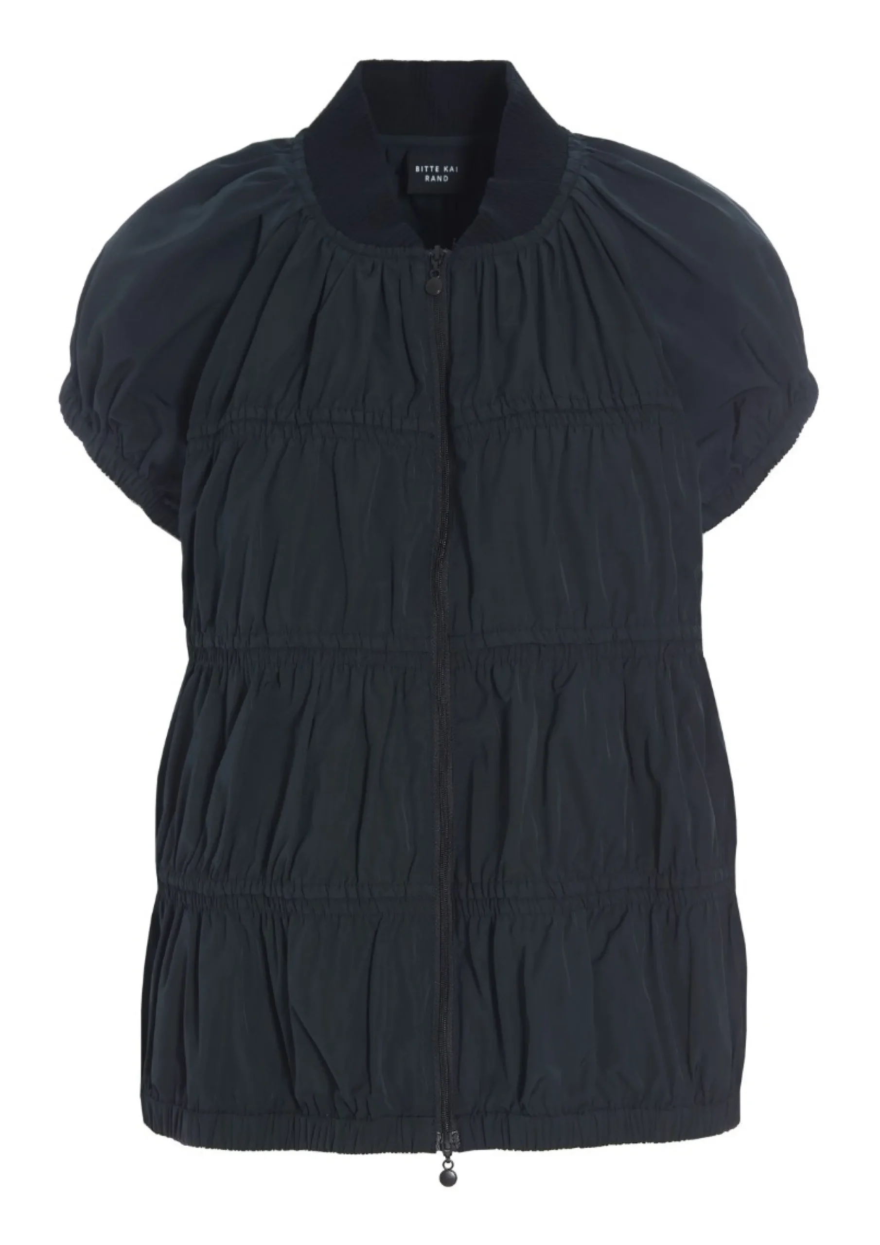 Lækker lille jakke, der både kan bruges alene som top og udenpå en langærmet bluse. De elastiske rynkeeffekter, giver jakken et anderledes og næsten skulpturelt udtryk.Modellen på billede er 178 cm og iført str. SFuld længde i str. S, ca. 61 cm.