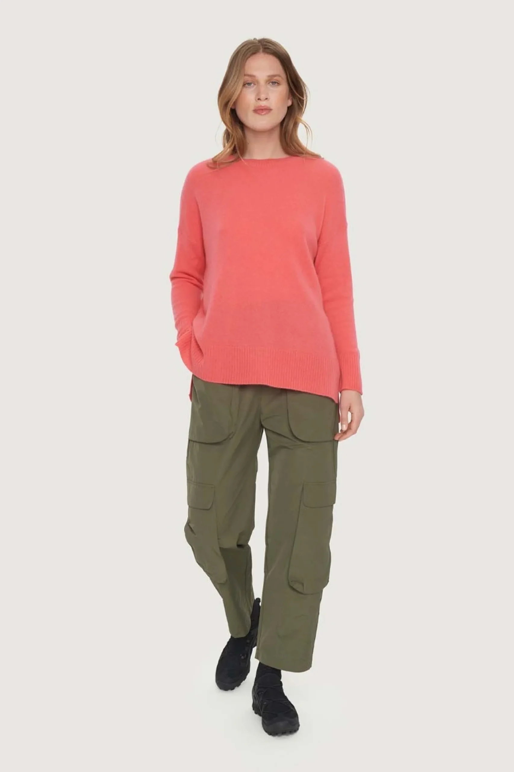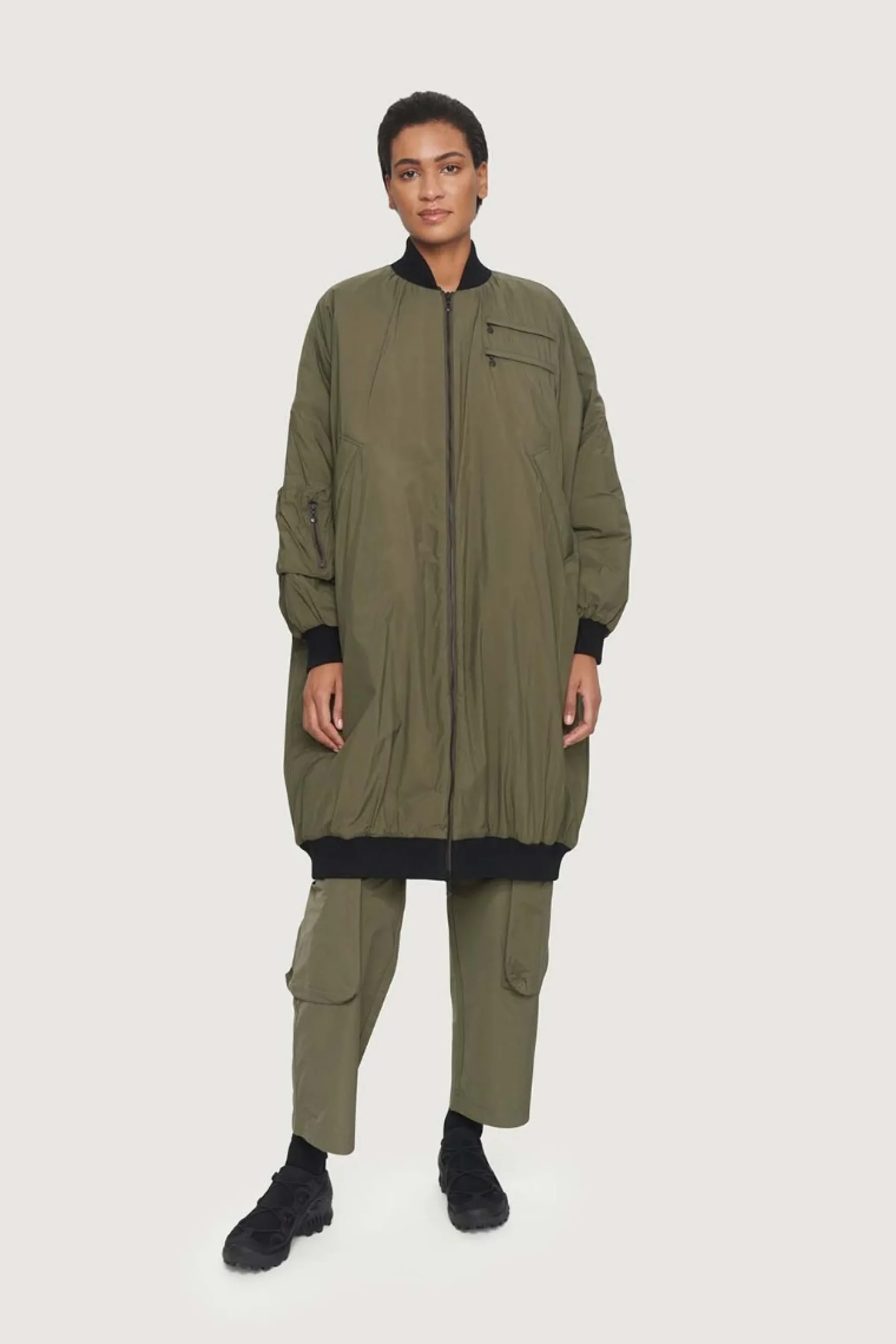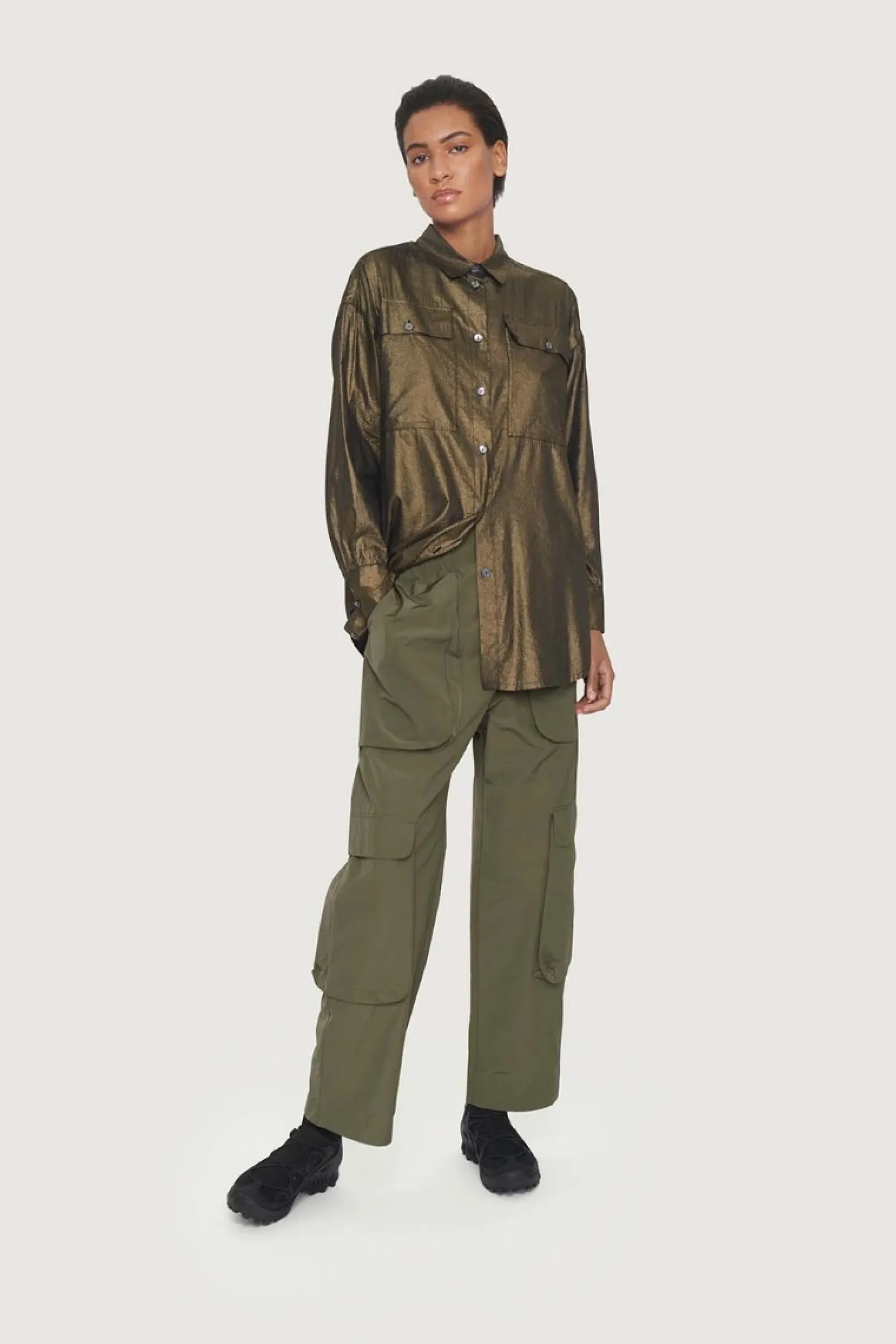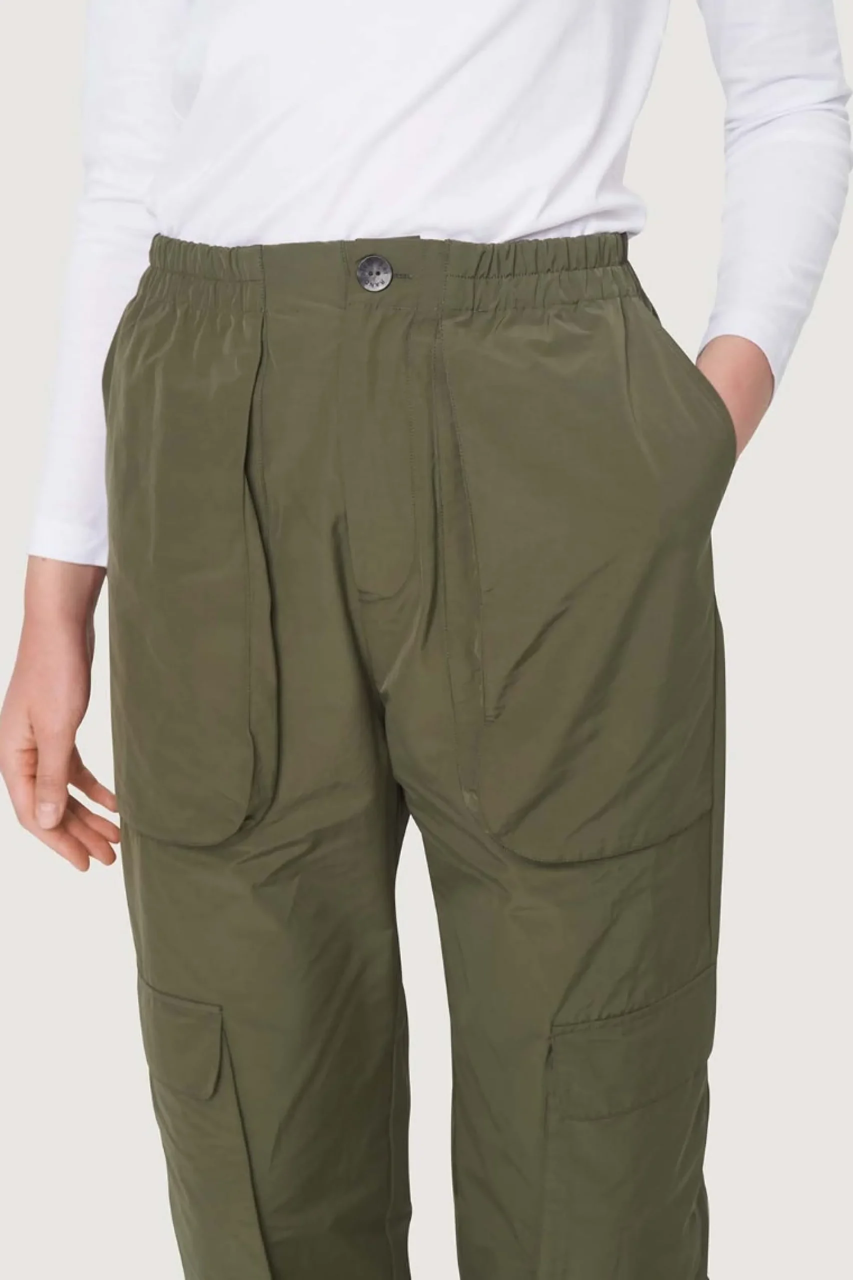 Bukser med store påsatte lommer på benene og elastik i taljen. En meget behagelig buks, der er oplagt at bruge med en enkel strikbluse eller t-shirt, eller sammen med den matchende Fukkura poplin bomber jakke.Modellen på billede er 180 cm og iført str. SLængde målt fra taljen i str. S: ca. 104 cm.