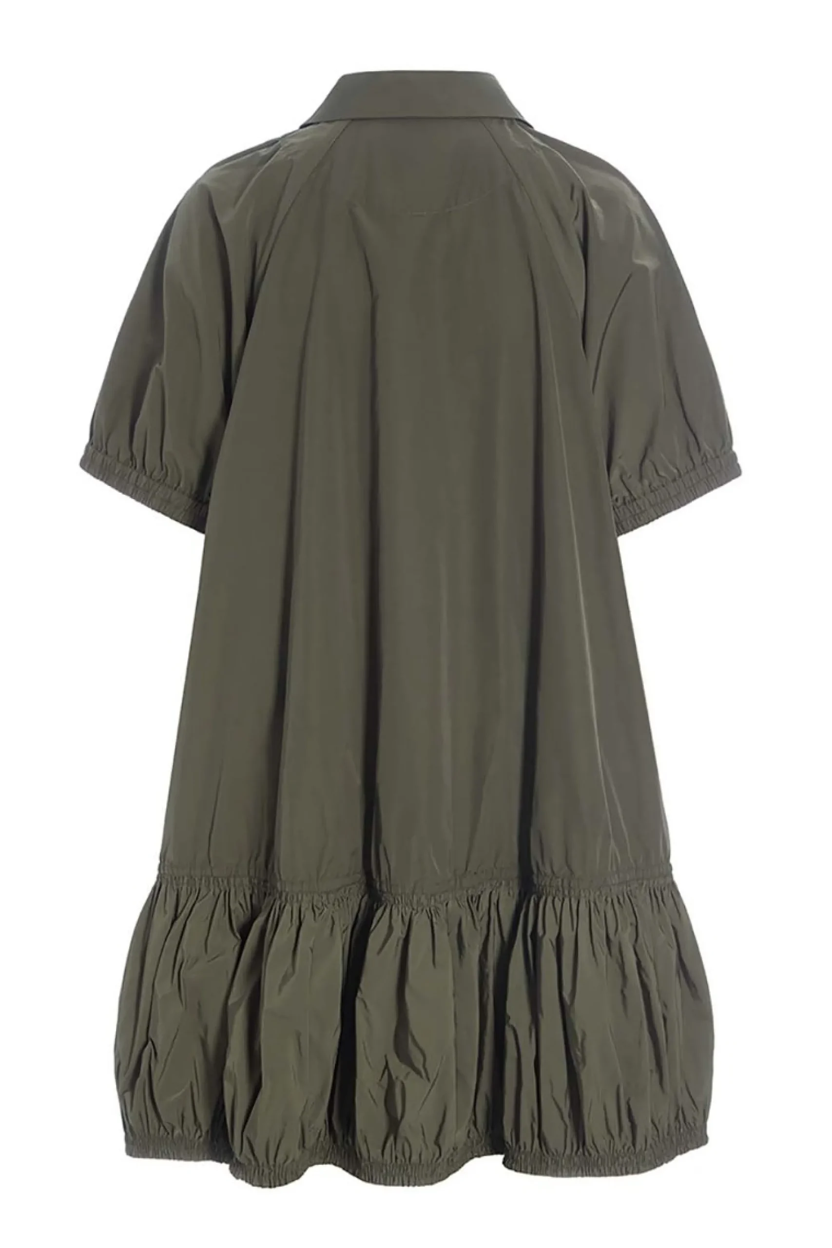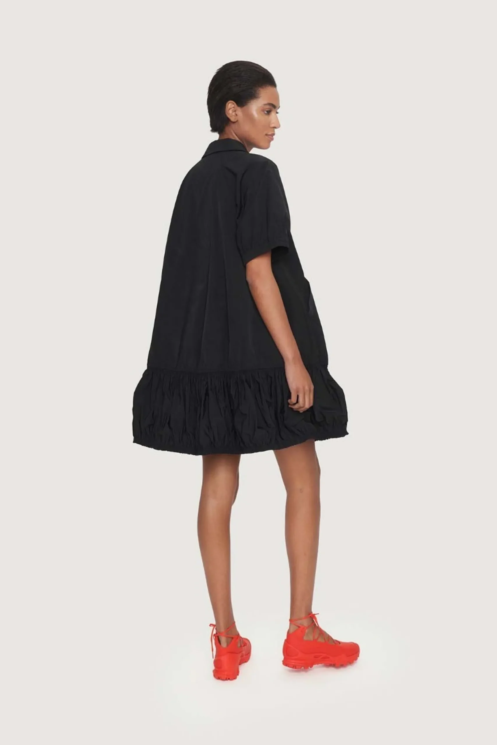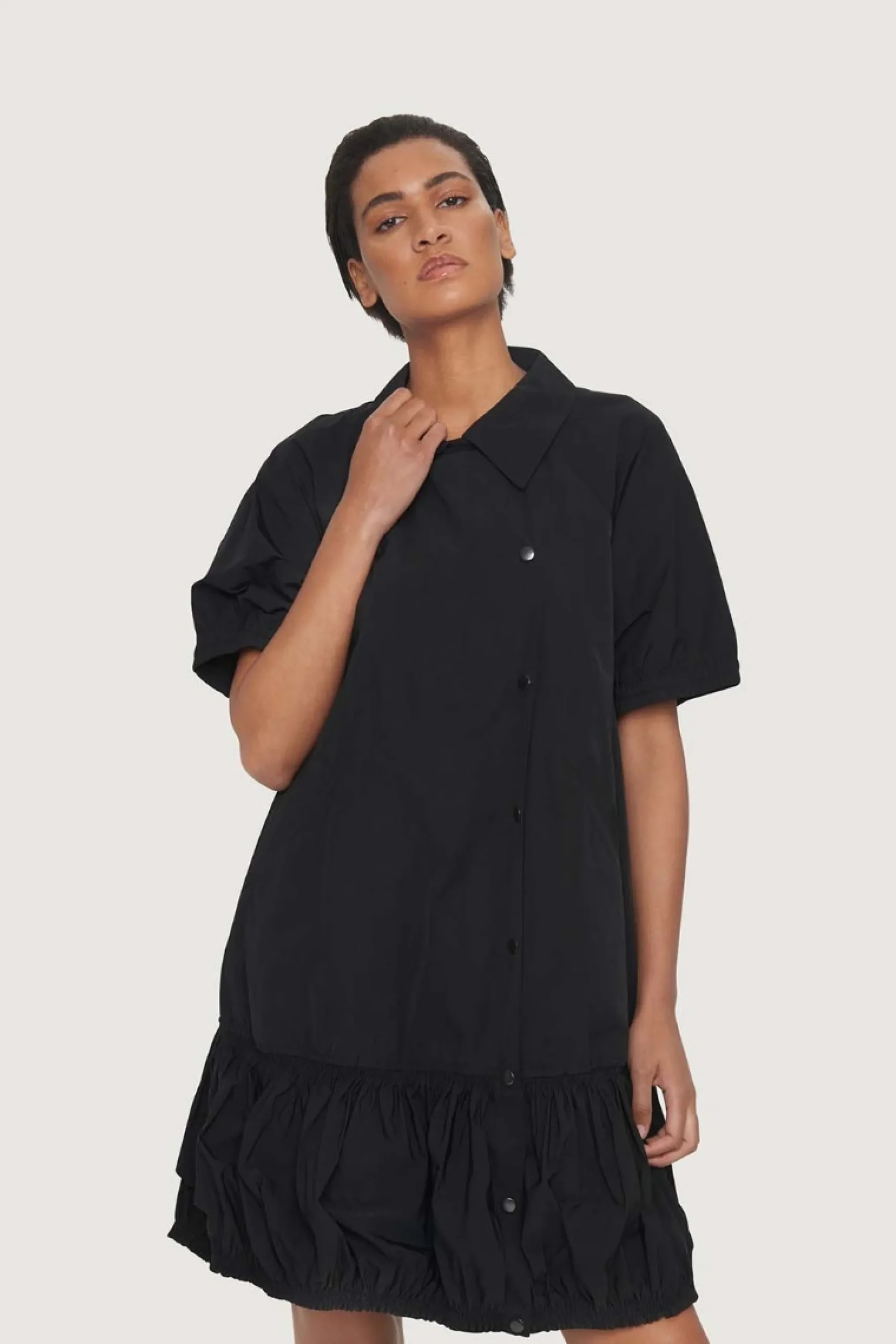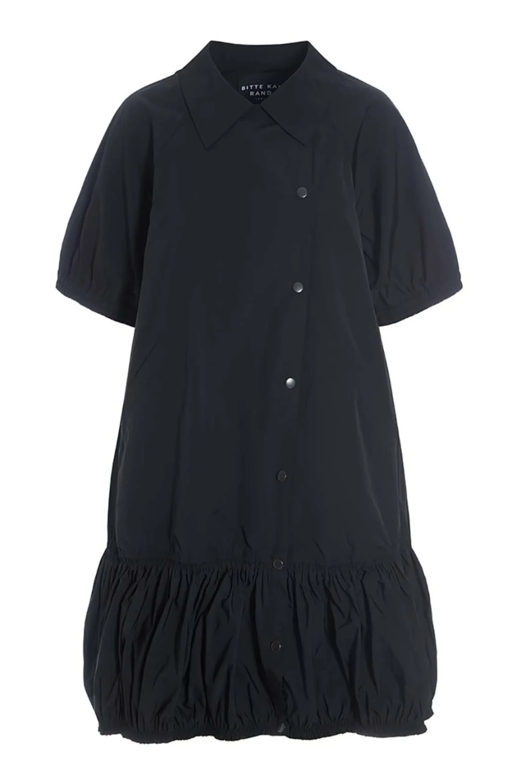 Fantastisk flot skjortekjole med rynkeeffekt forneden og korte ærmer med elastik, der er med til at give kjolen et puffy udtryk. Med denne kjole er du lækkert klædt i en fart. Alt du behøver er at tilsætte strømpebukser eller bukser og måske en langærmet t-shirt på kolde dage.Modellen på billede er 180 cm og iført str. SFuld længde i str. S, ca. 99 cm.