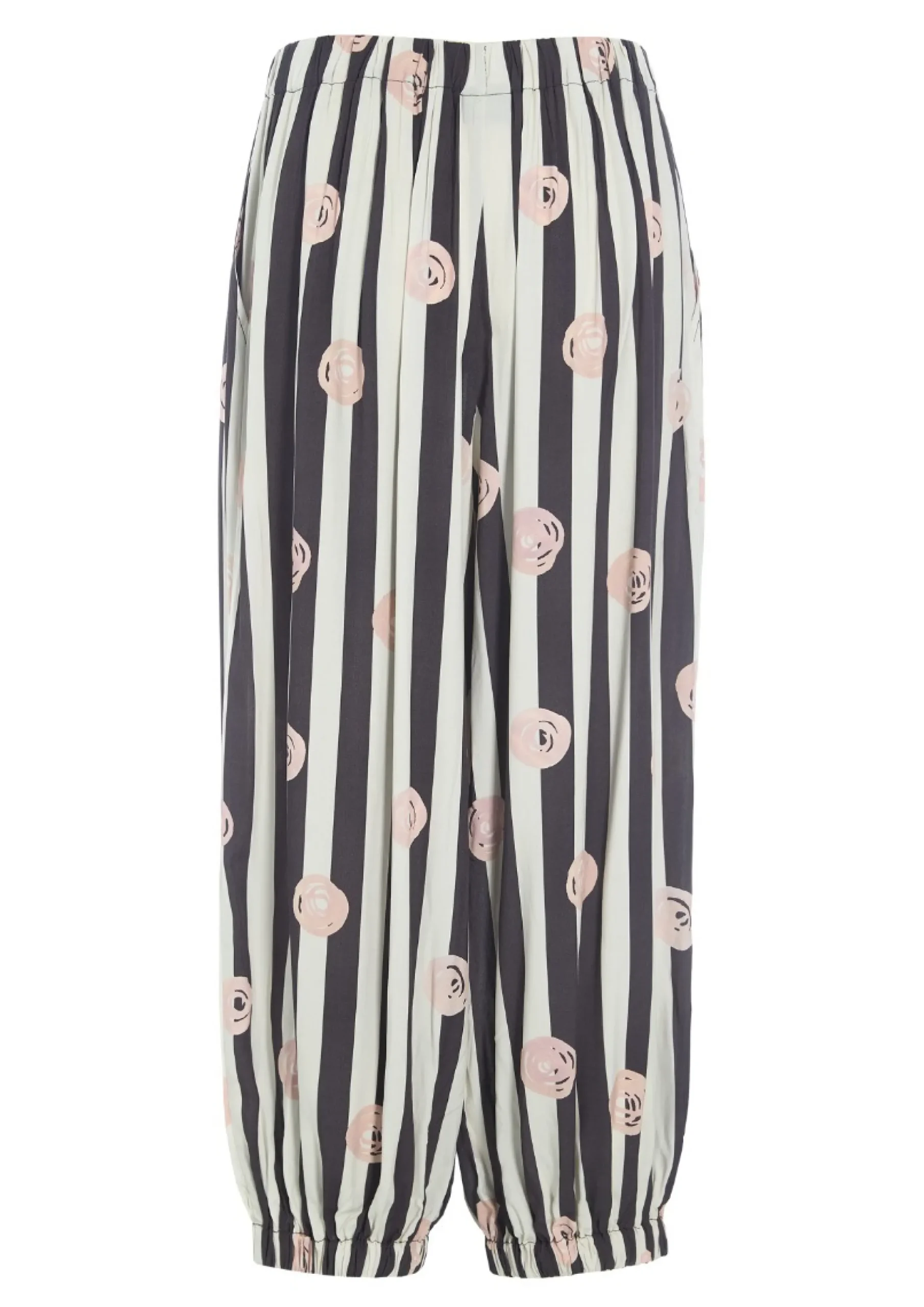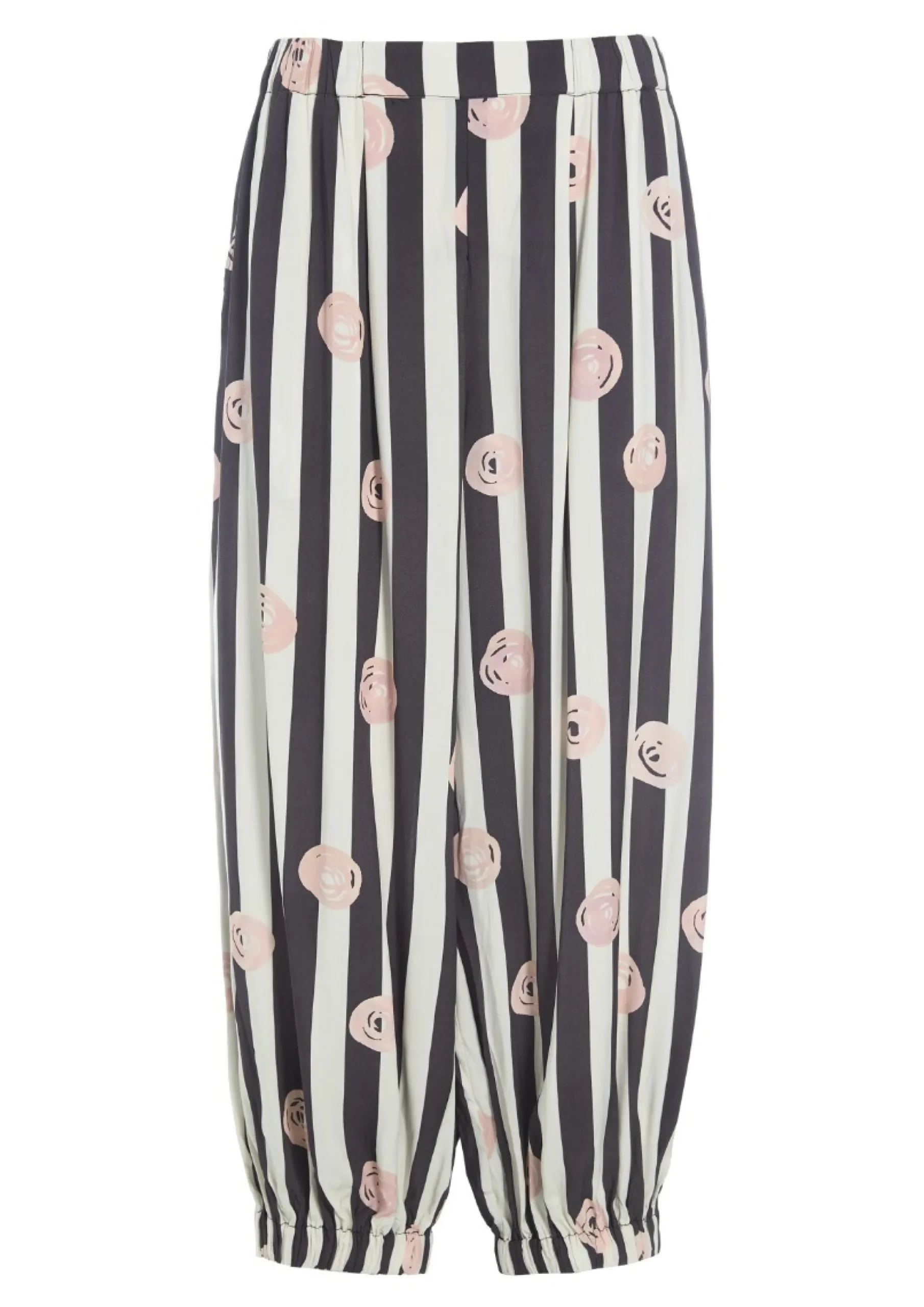 Bukser med brede ben og elastik for enden af buksebenene. Bukserne har et smukt print og kan fx bruges med en skjorte, t-shirt eller top til. Kombinerer du med den matchende Haru skjorte, får du et virkelig smukt sæt.Modellen på billede er 178 cm og iført str. SLængde målt fra taljen i str. S: ca. 94 cm.