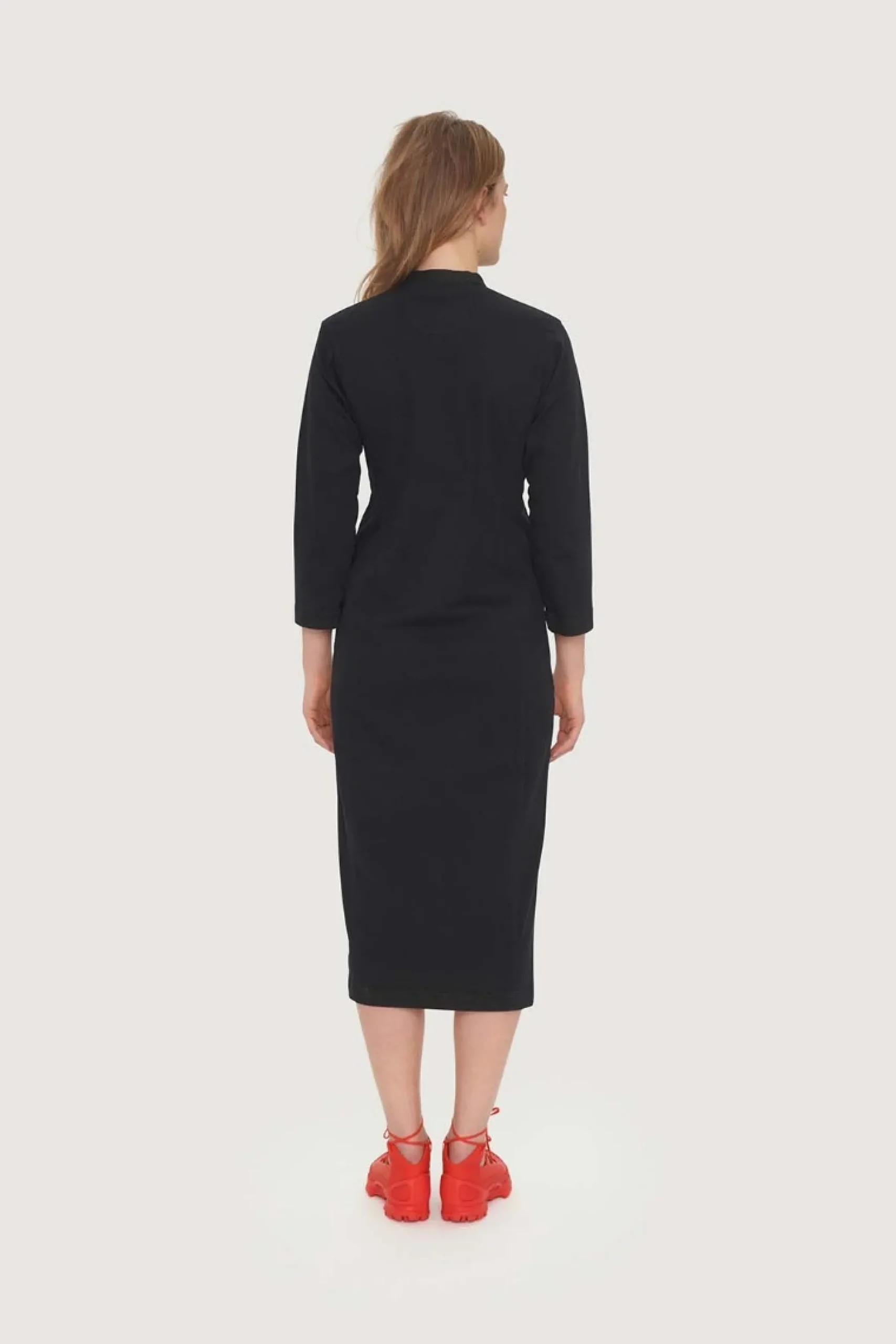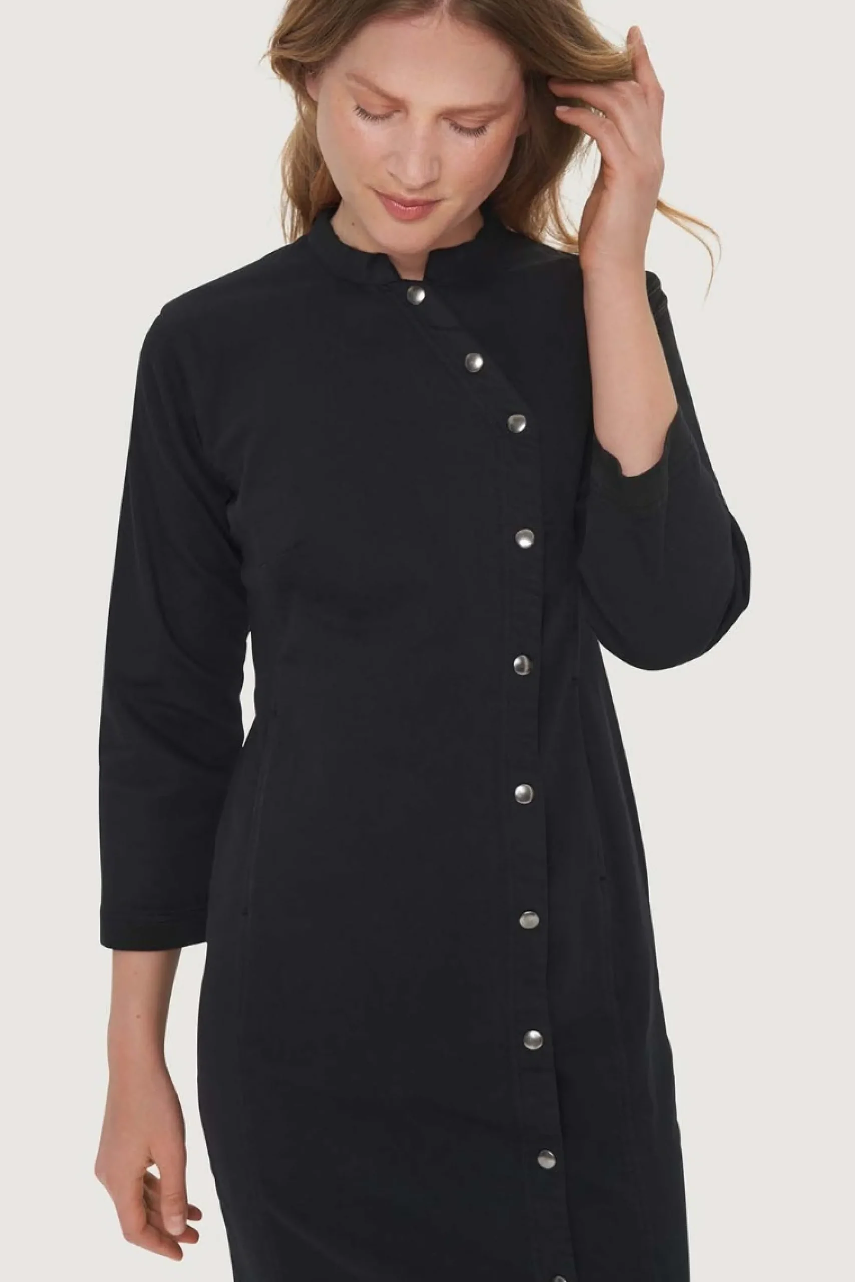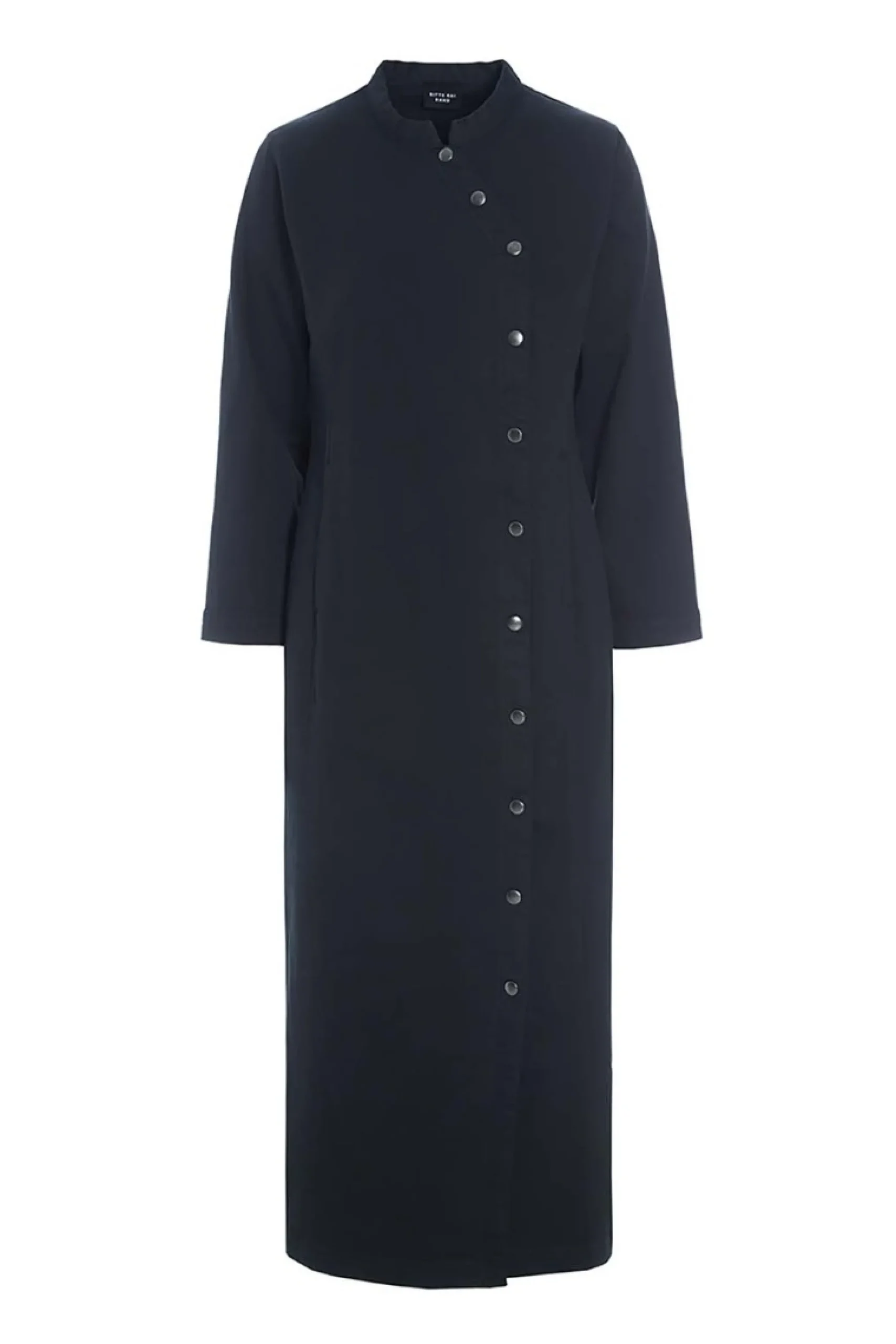 Smuk kjole med kinakrave og asymmetrisk lukning, der giver et tydeligt orientalsk præg. Kjolen har en lang, slank silhuet, og det bløde bomuldsstof er tilsat stretch for god bevægelighed. En tidløs klassiker, som kan bruges både til hverdag og fest.Modellen på billede er 180 cm og iført str. SFuld længde i str. S, ca. 130 cm.