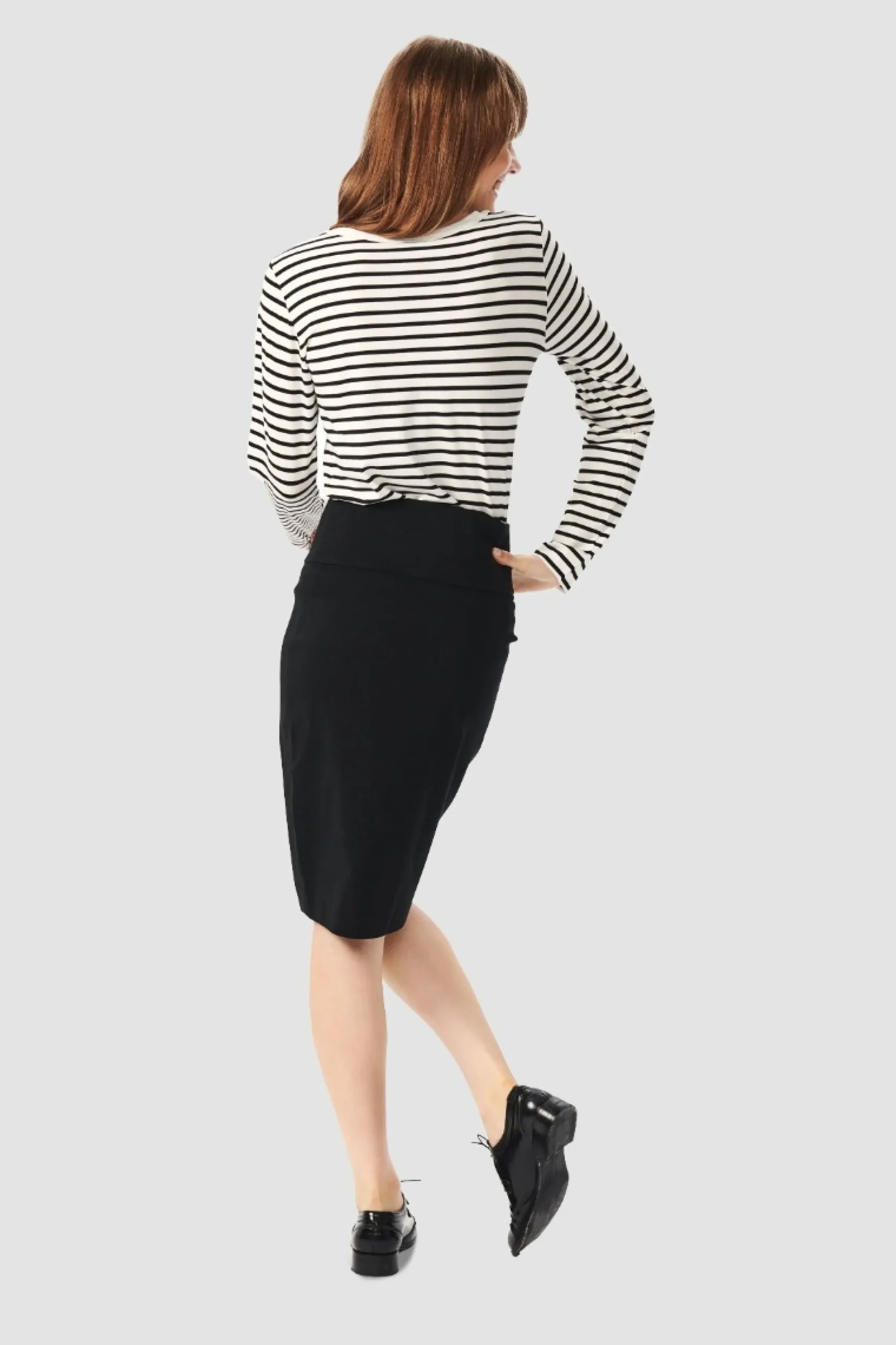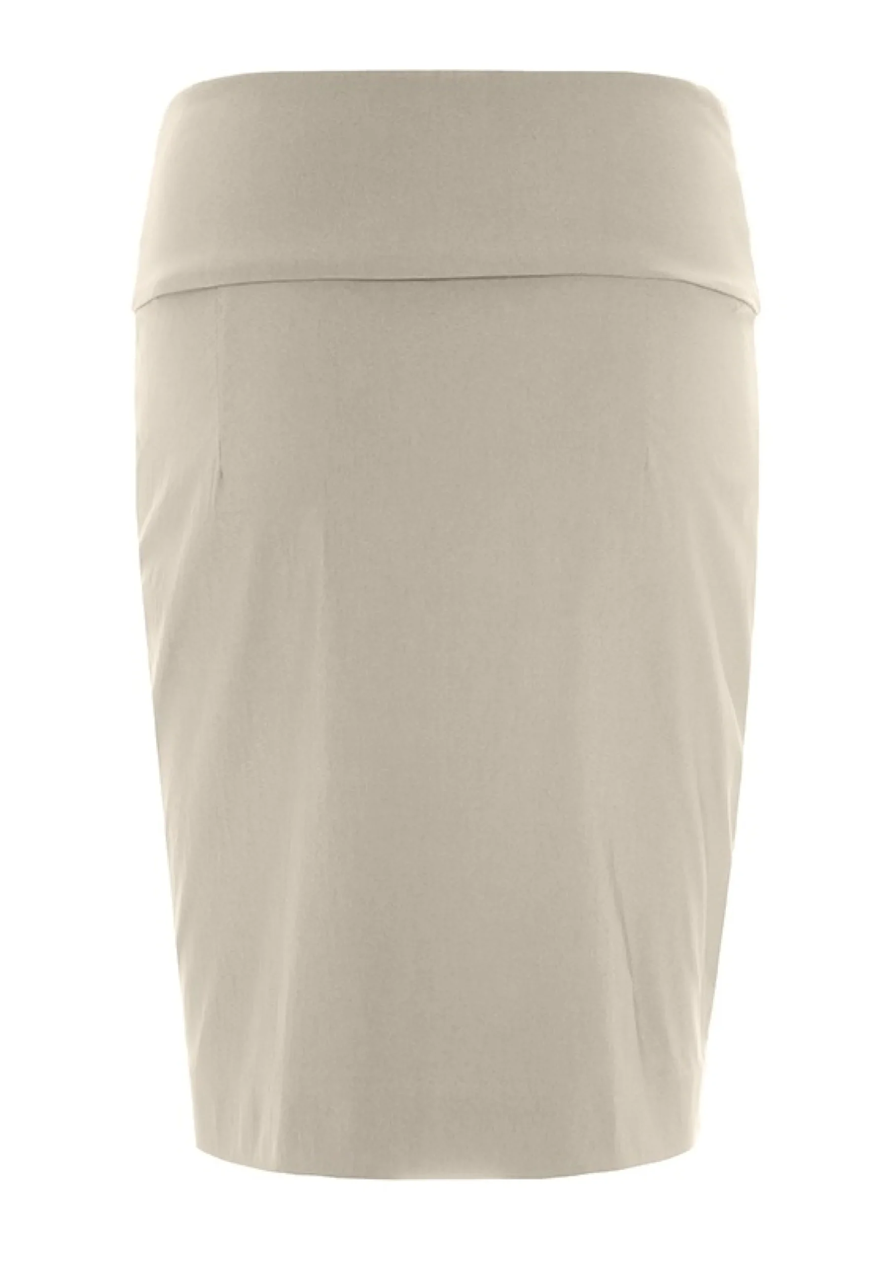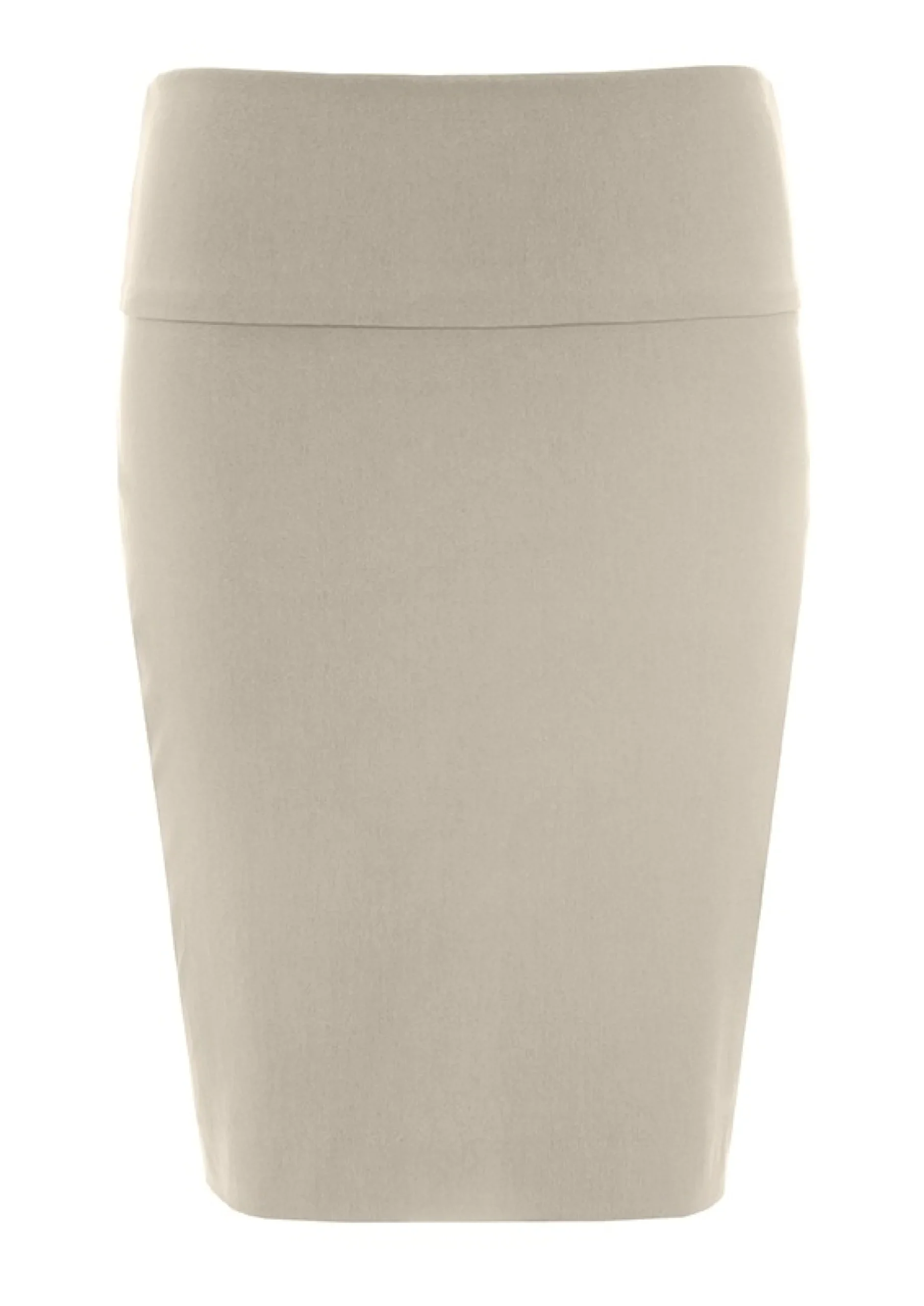 Basisnederdel med klædelig og tætsiddende pasform. Der er stretch i nederdelen, som sikrer en god bevægelighed. Nederdelens brede linning kan trækkes op over maven eller foldes ned for en almindelig taljehøjde. Denne effekt gør den meget behagelig.Modellen på billede er 176 cm og iført str. S A Længde i str. S, ca. 45 cm. B Længde i str. S, ca. 53 cm.
