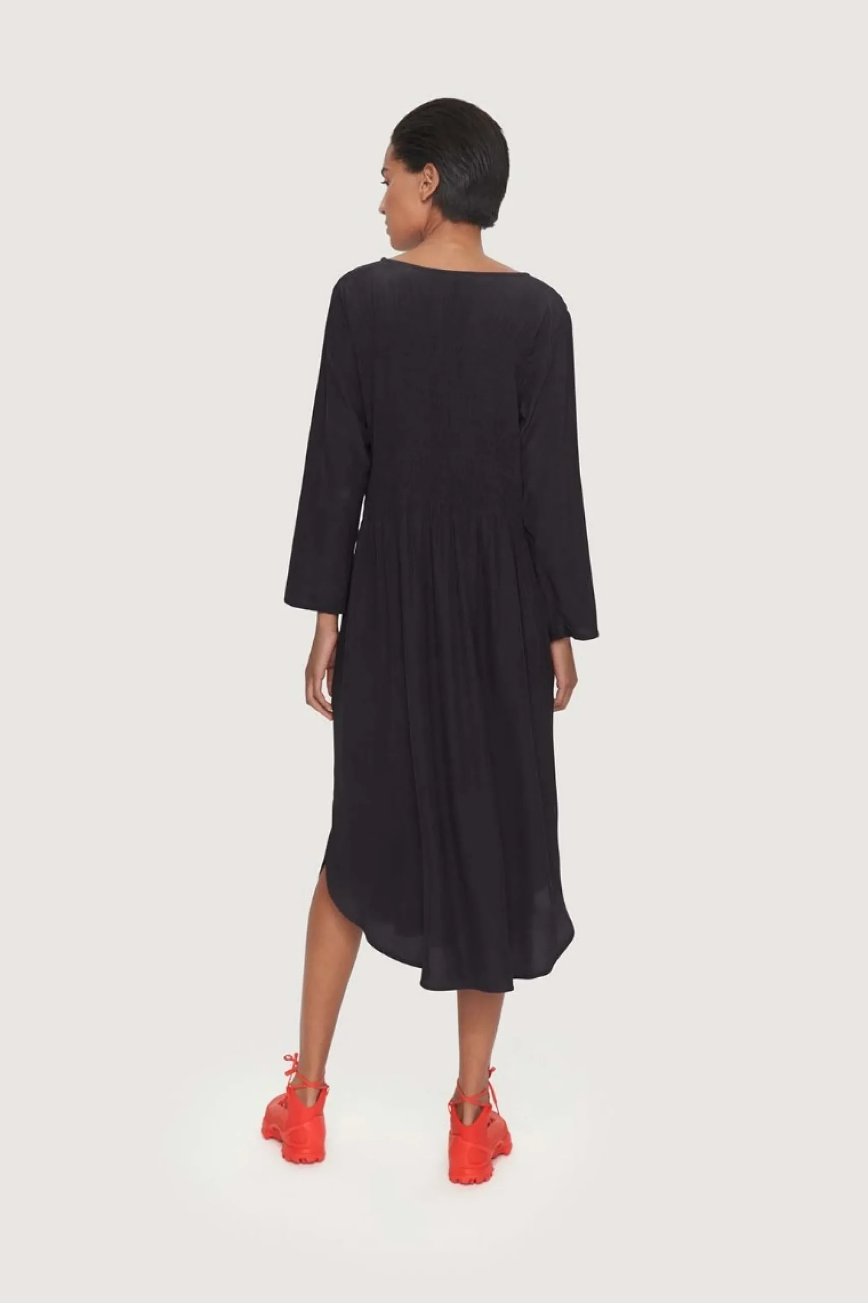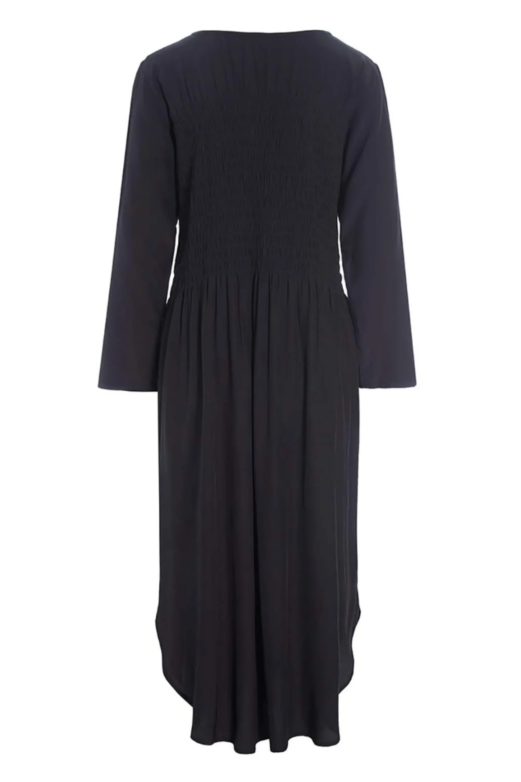 Kjole i en blød og lækker FSC-certificeret viskosekvalitet. Kjolen har smocksyning på overdelen og en mere løstsiddende underdel, hvilket skaber en smuk og feminin silhuet. ærmerne er 3/4-lange, og der er et afrundet for- og bagstykke. Det giver en lethed til designet.Modellen på billede er 180 cm og iført str. SFuld længde i str. S, ca. 120 cm.