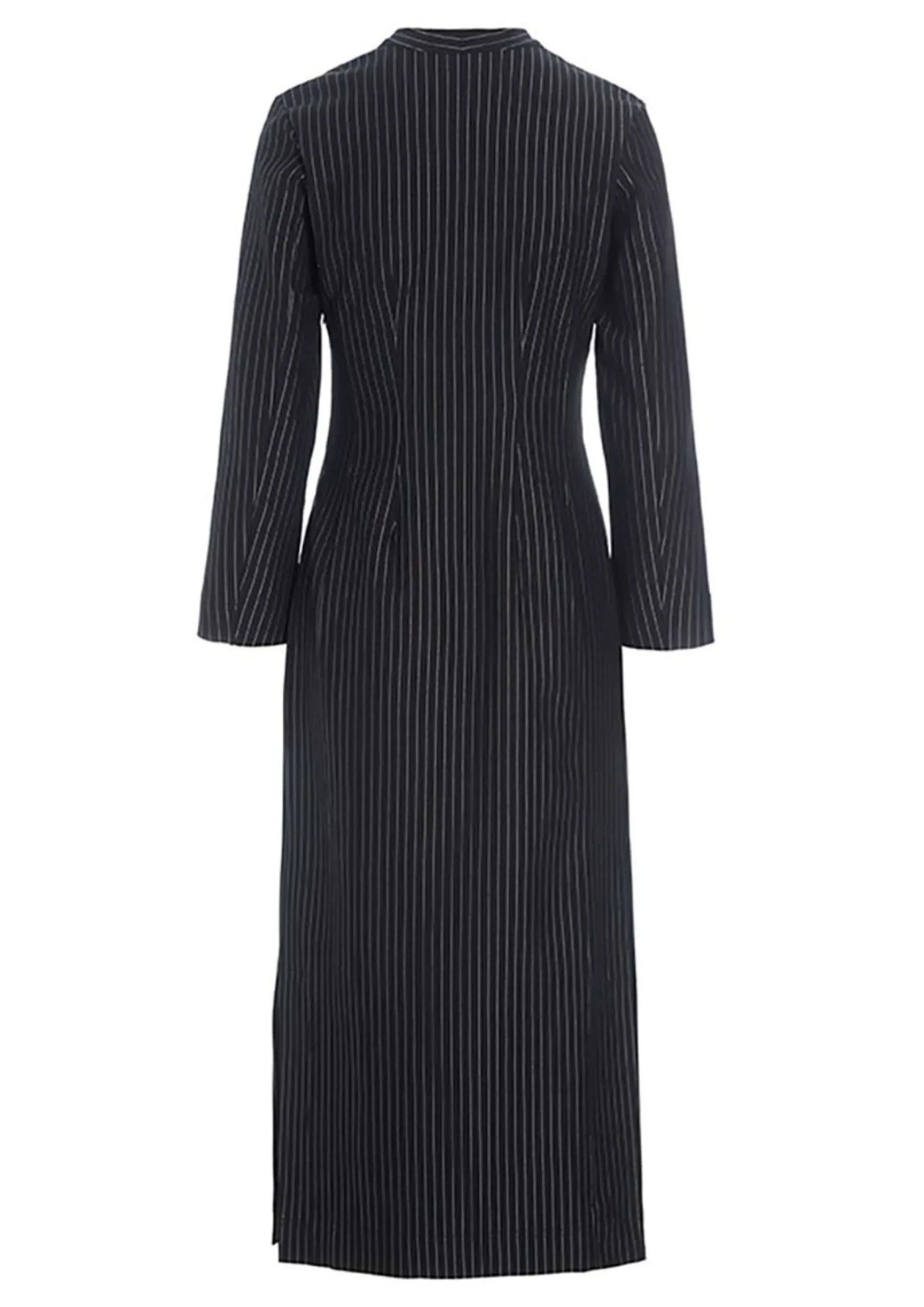 Smuk og superenkel kjole med kinakrave, asymmetrisk lukning og nålestriber, der forener det orientalske med et klassisk business look. Kjolen har en lang, slank silhuet, og stoffet er tilsat stretch for god bevægelighed. En tidløs klassiker, som kan bruges både til hverdag og fest.Modellen på billede er 180 cm og iført str. SFuld længde i str. S, ca. 130 cm.