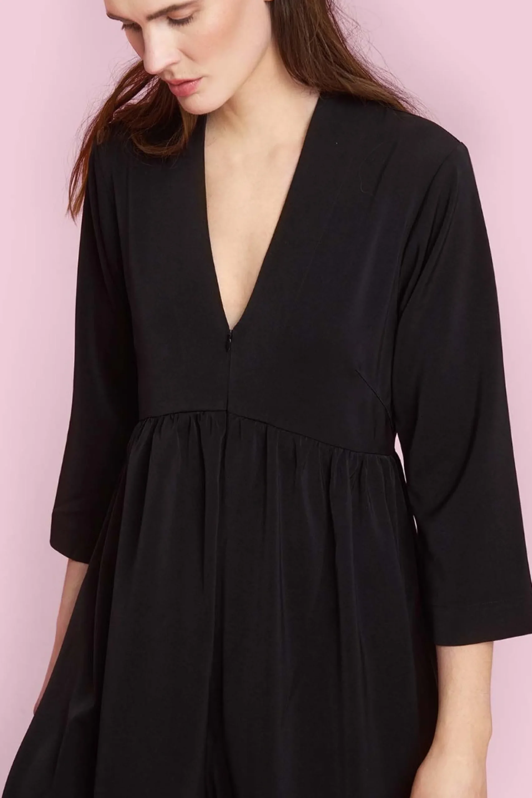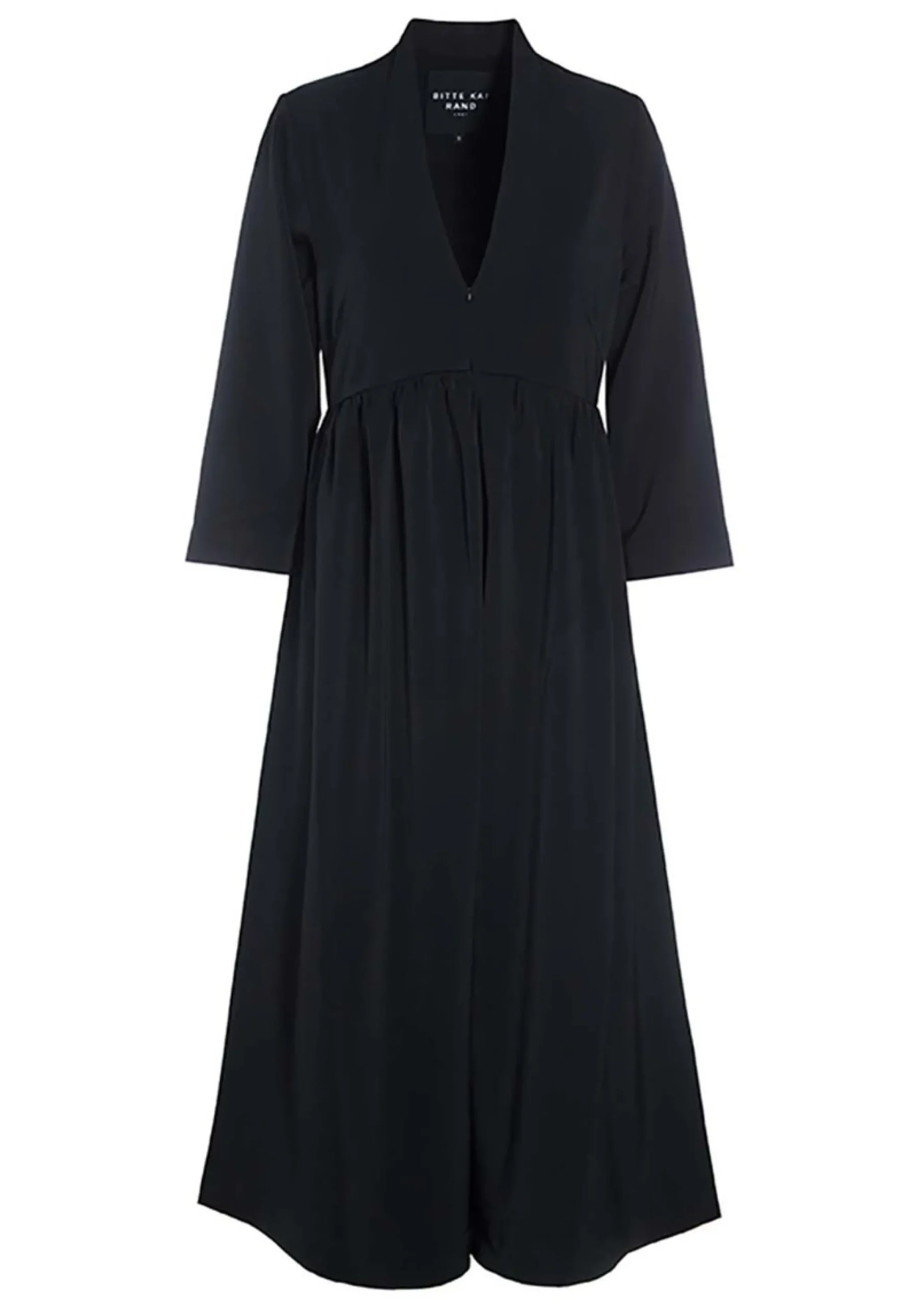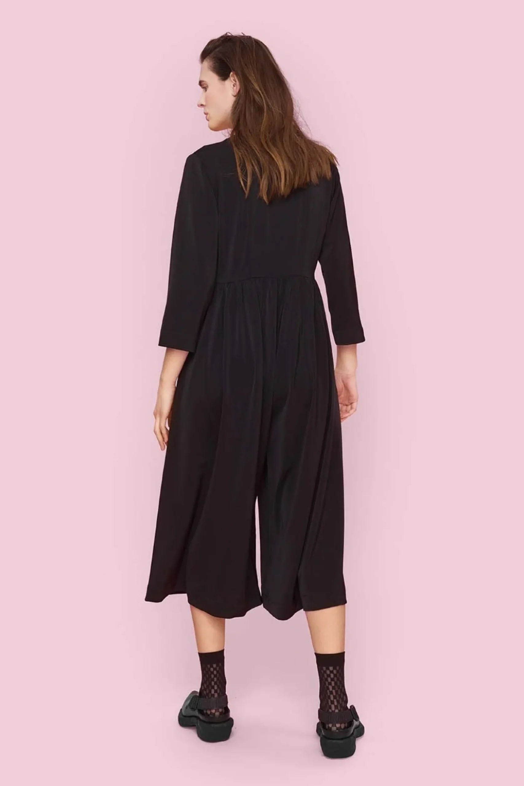 Superenkel og velsiddende buksedragt, der giver mange stylingmuligheder. Buksedragten har brede ben og kan bruges som et smukt alternativt til en kjole. Dyb V-udskæringen med skjult lynlås foran. Du kan vælge at tage en t-shirt eller rullekravebluse under. Og til aftenbrug kan du undlade at tage noget under.Modellen på billede er 180 cm og iført str. SFuld længde i str. S, ca. 130 cm.