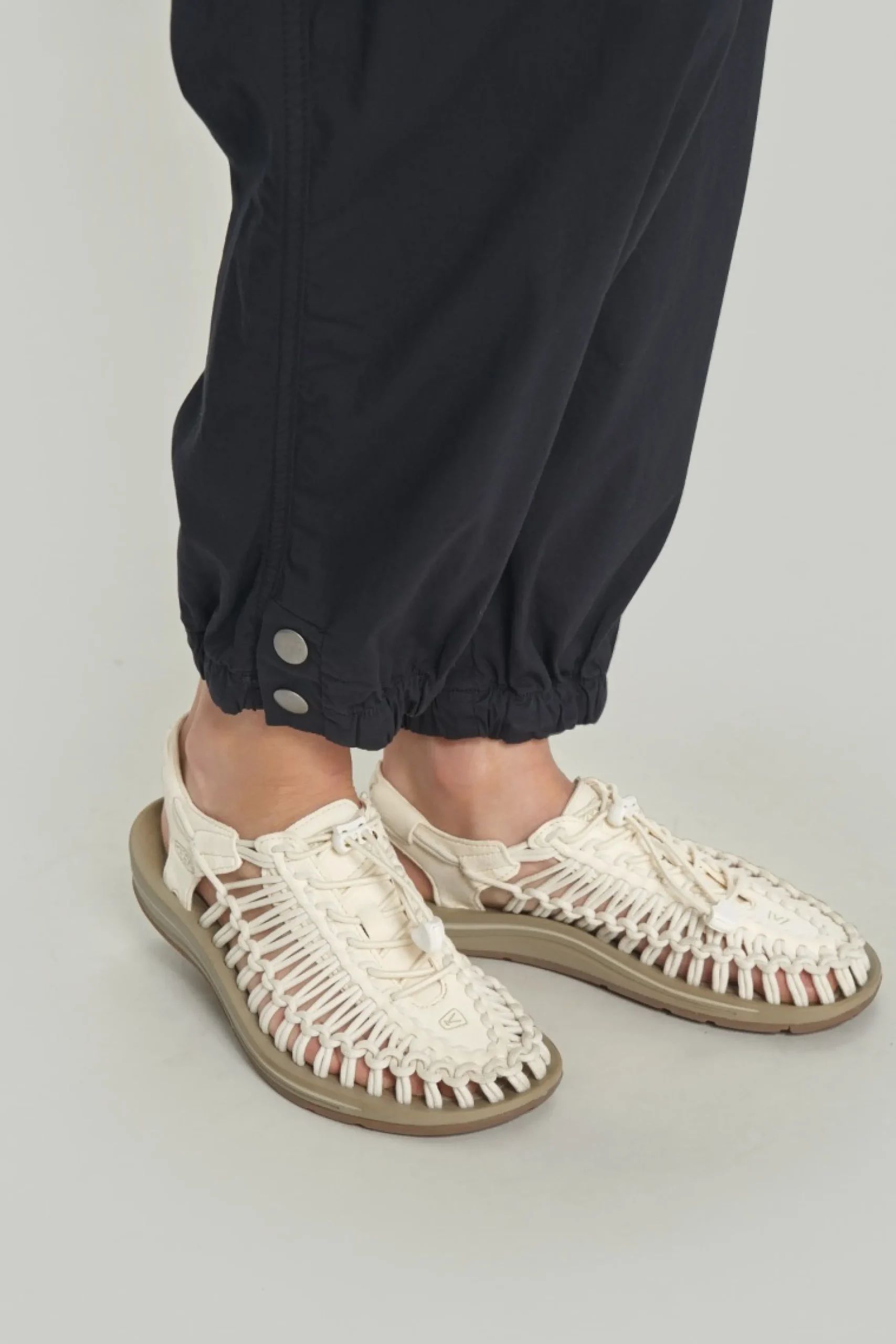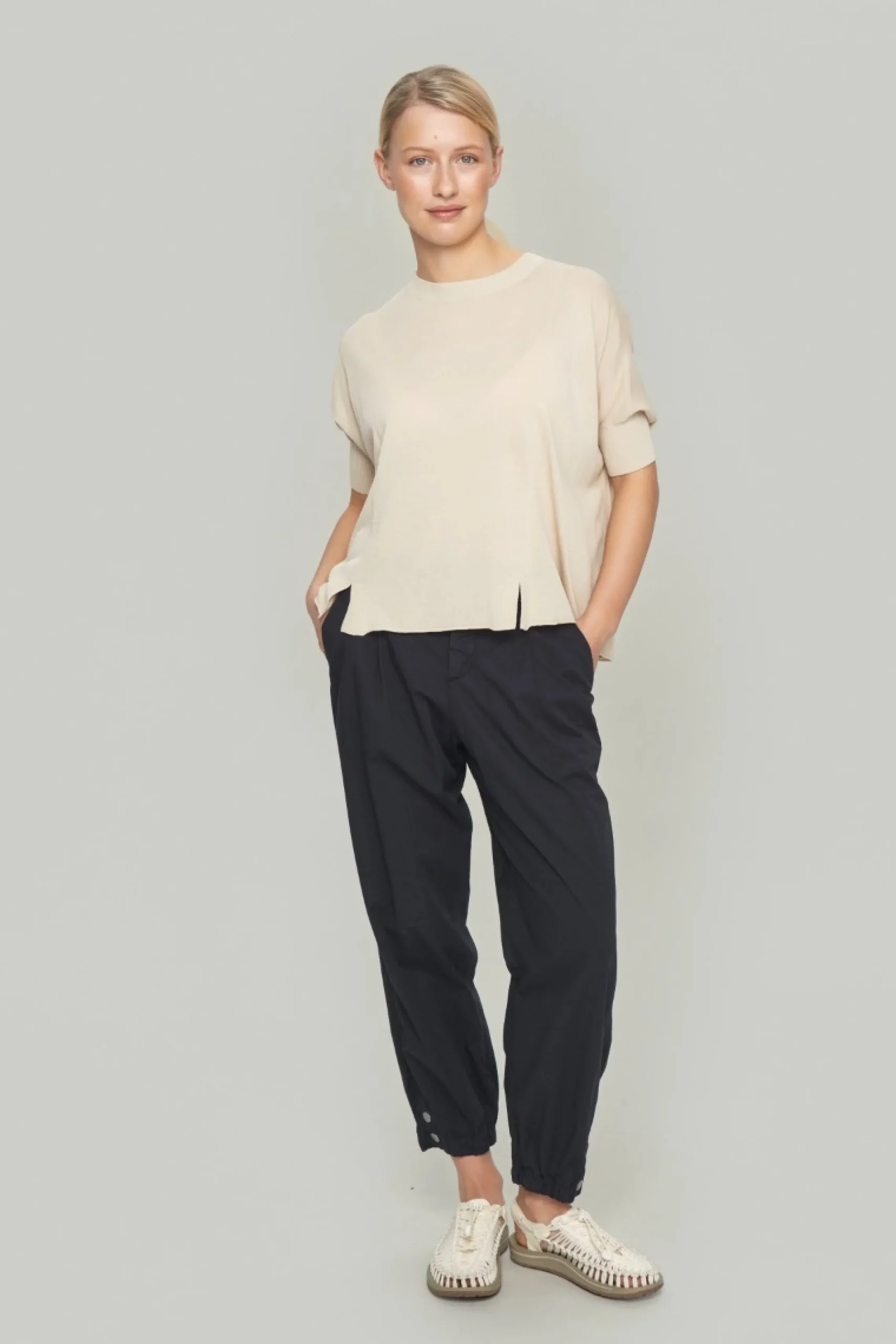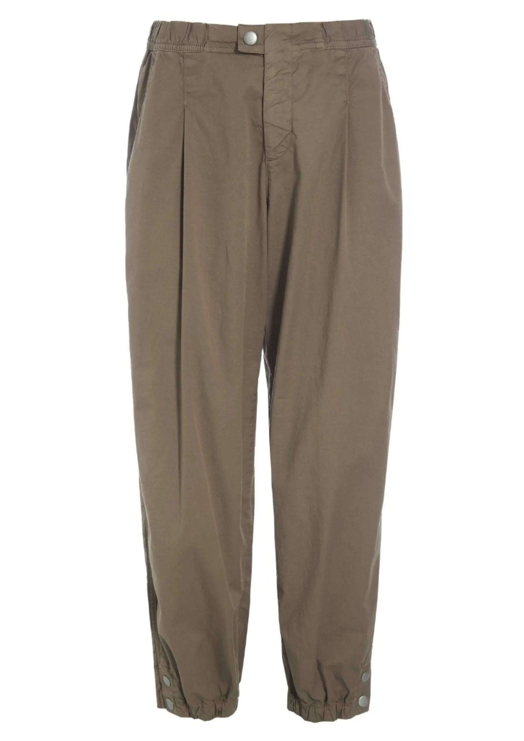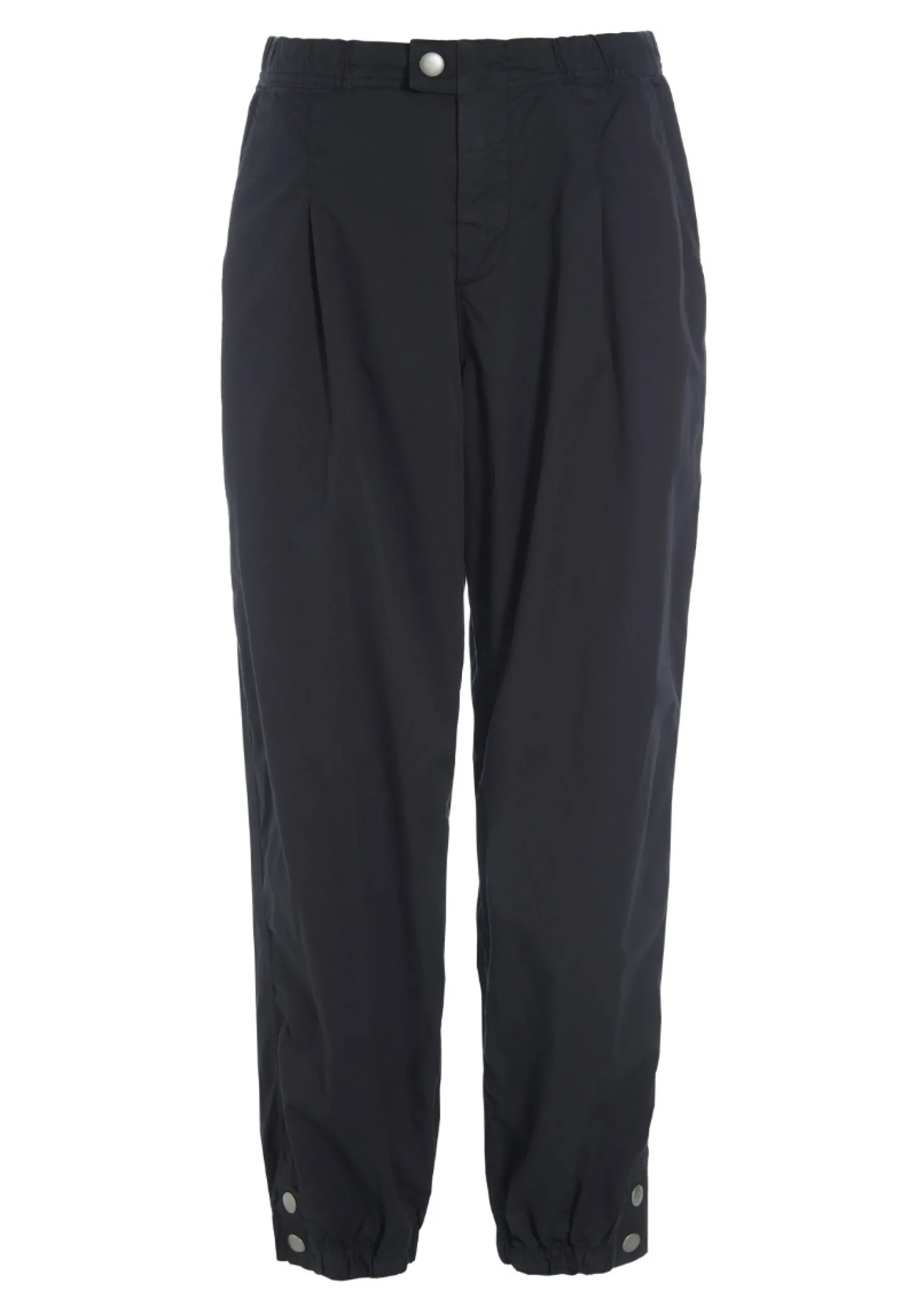 Bukser med elastisk rynkeeffekt ved anklerne, hvilket skaber en afslappet silhuet. Bukserne er i en lækker bomuldskvalitet, som gør dem yderst behagelige at have på. Sætter du en enkel t-shirt og et par ballerinasko eller sandaler til, har du et elegant og klædeligt outfit.Modellen på billede er 178 cm og iført str. SLængde målt fra taljen i str. S: ca. 99 cm.