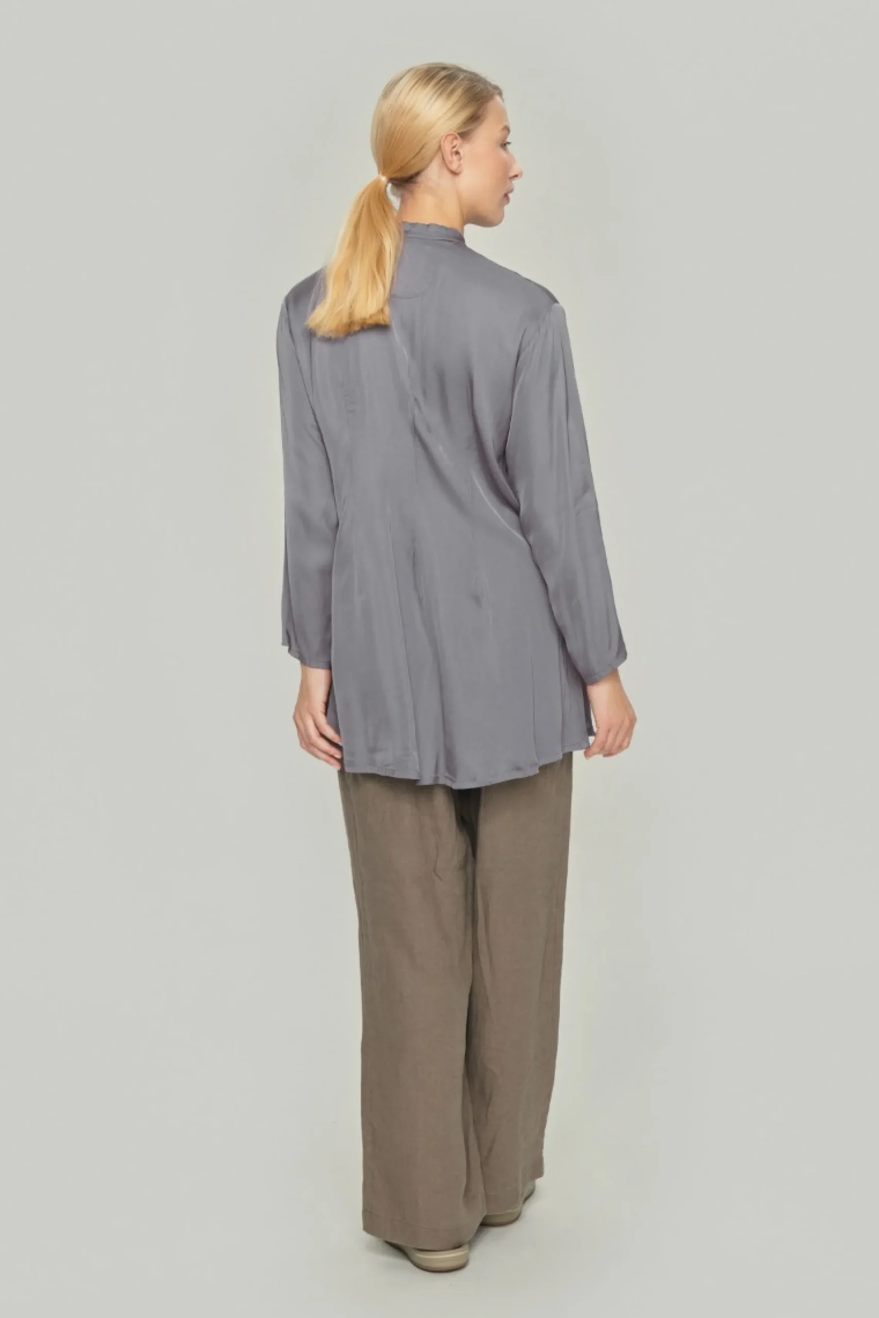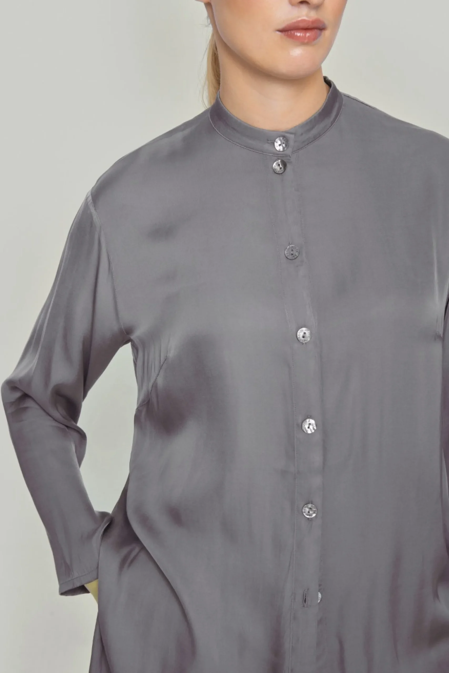 Så enkel og så smuk. Denne skjorte er minimalistisk og uden andre detaljer end den fine kinakrave. Det gør den tidløs og yderst let at kombinere med enhver underdel.Modellen på billede er 178 cm og iført str. SFuld længde i str. S, ca. 84 cm.