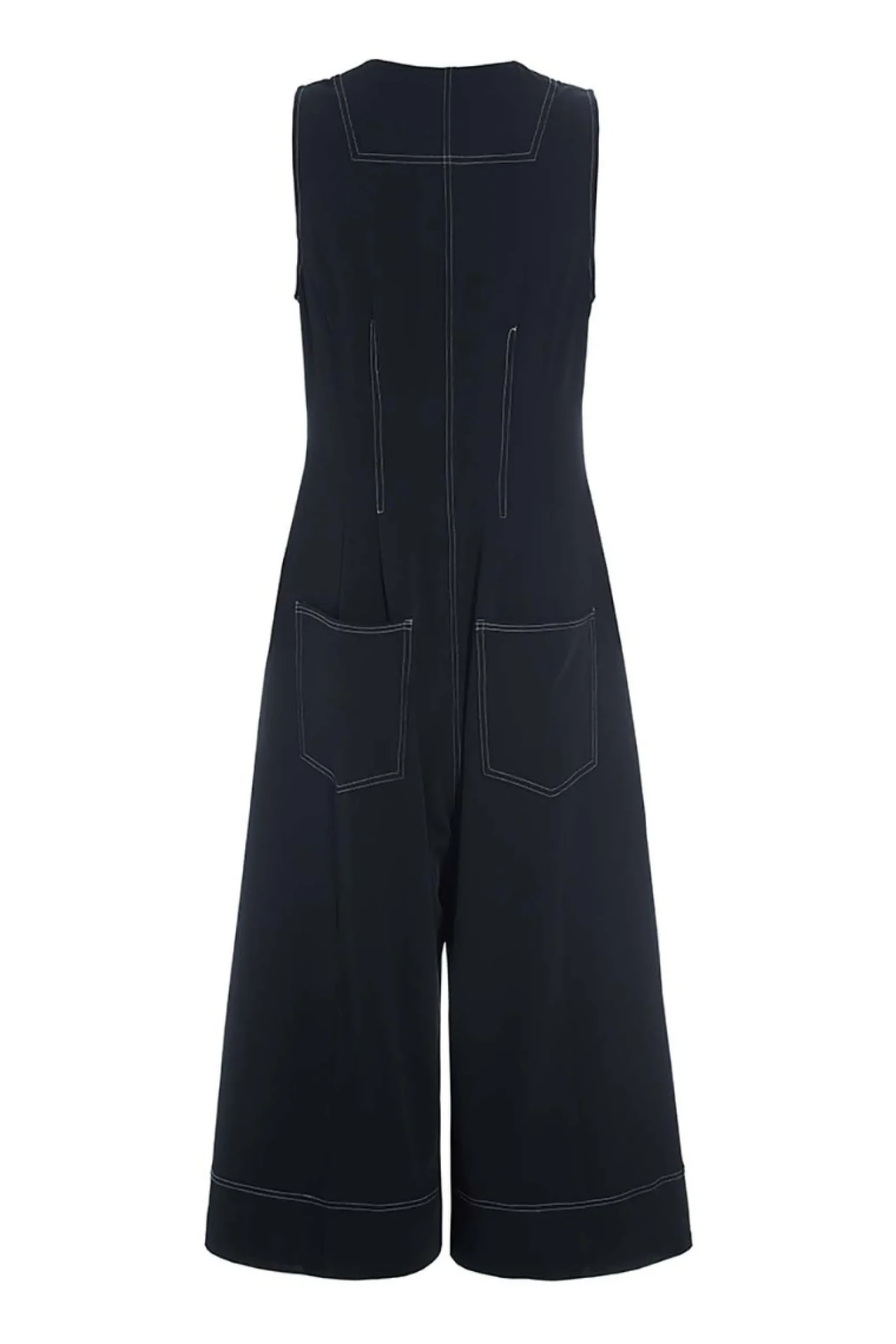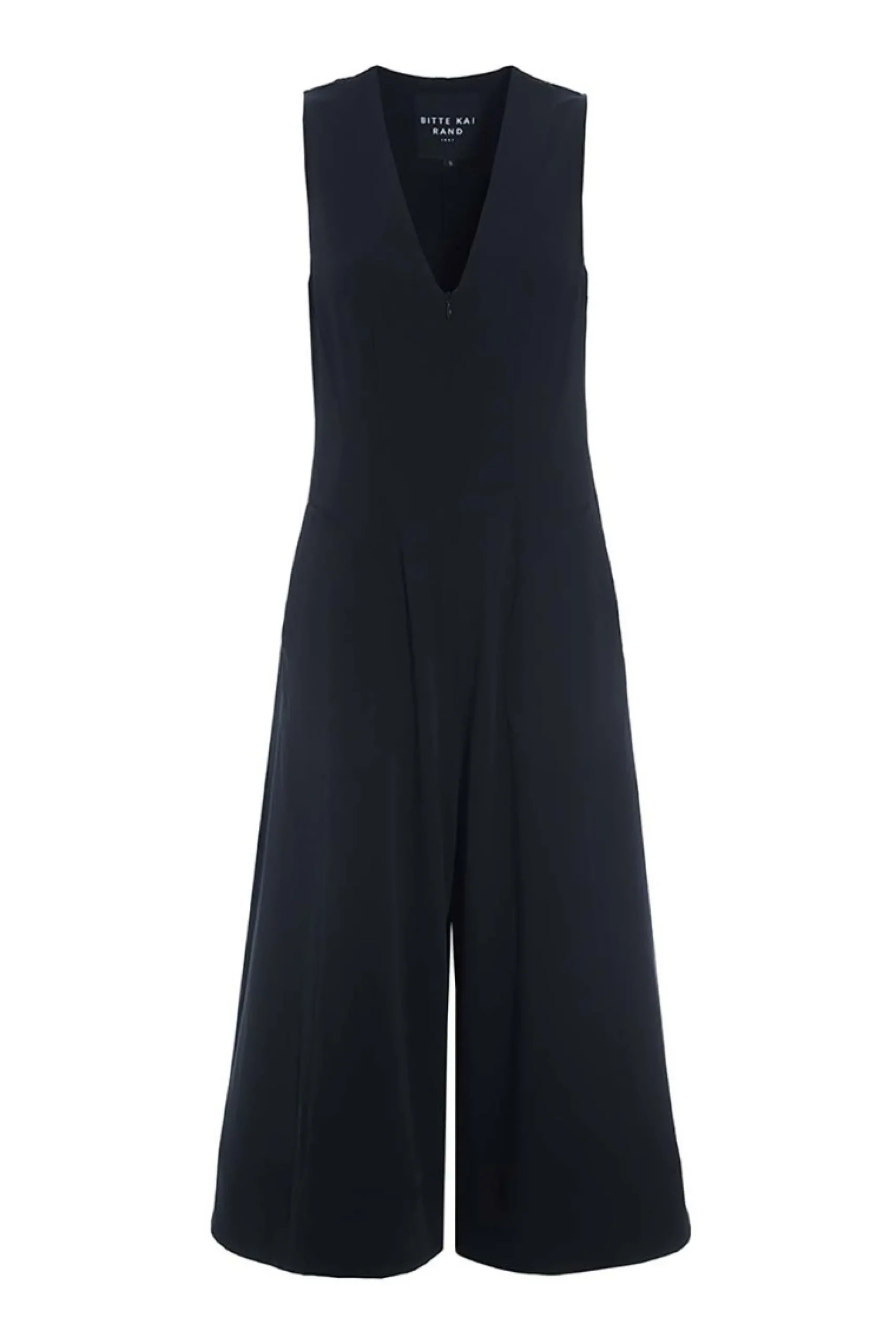 Enkel buksedragt med brede ben. Buksedragten har V-udskæring, og den er designet i en lækker polyesterkvalitet med stretch, der får den til at falde smukt om kroppen. Med denne buksedragt får du et stilsikkert outfit. Du behøver blot tilsætte bluse, t-shirt eller skjorte, og så er du klar. Til aftenbrug er buksedragten flot med bare arme.Modellen på billede er 180 cm og iført str. SFuld længde i str. S, ca. 139 cm.