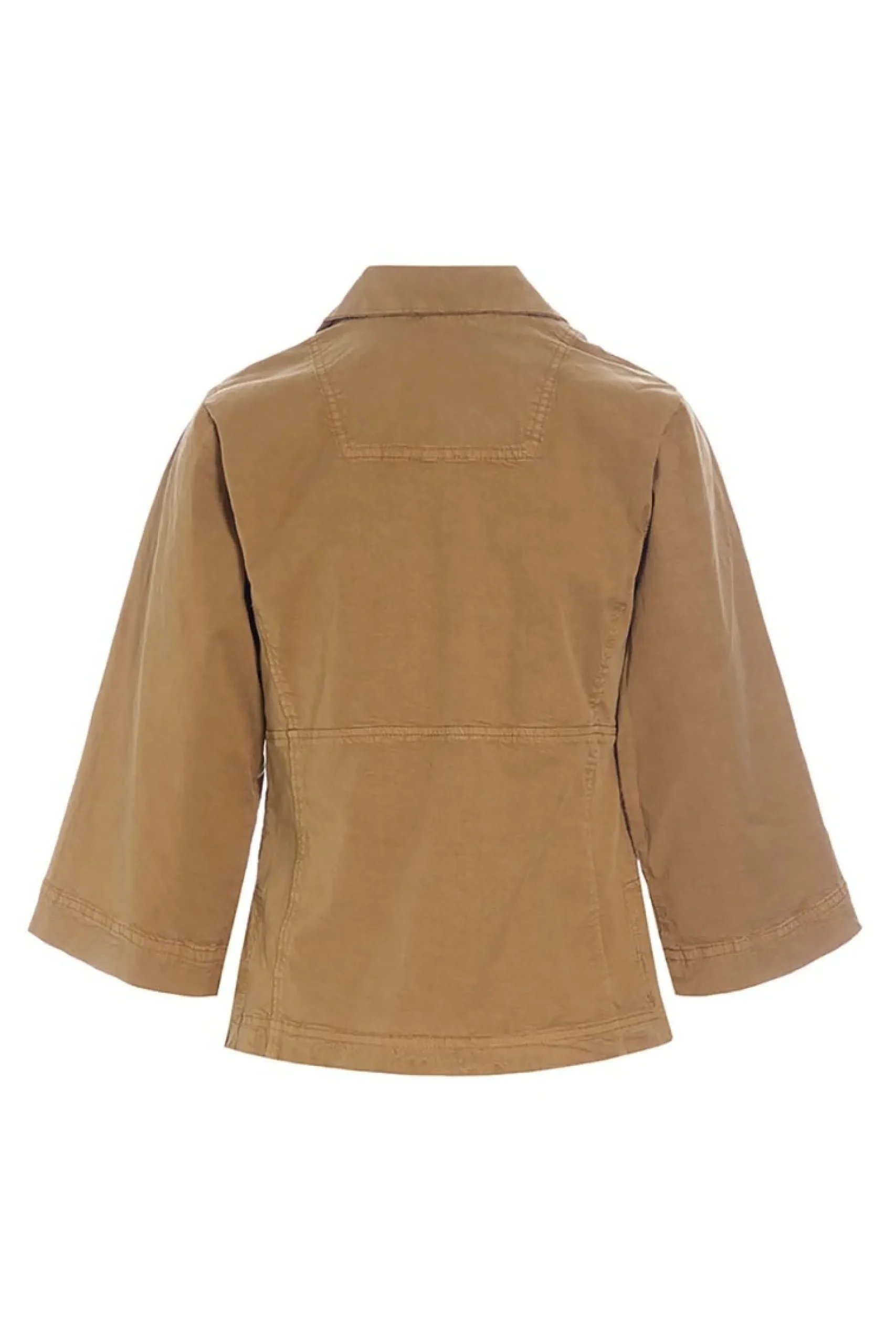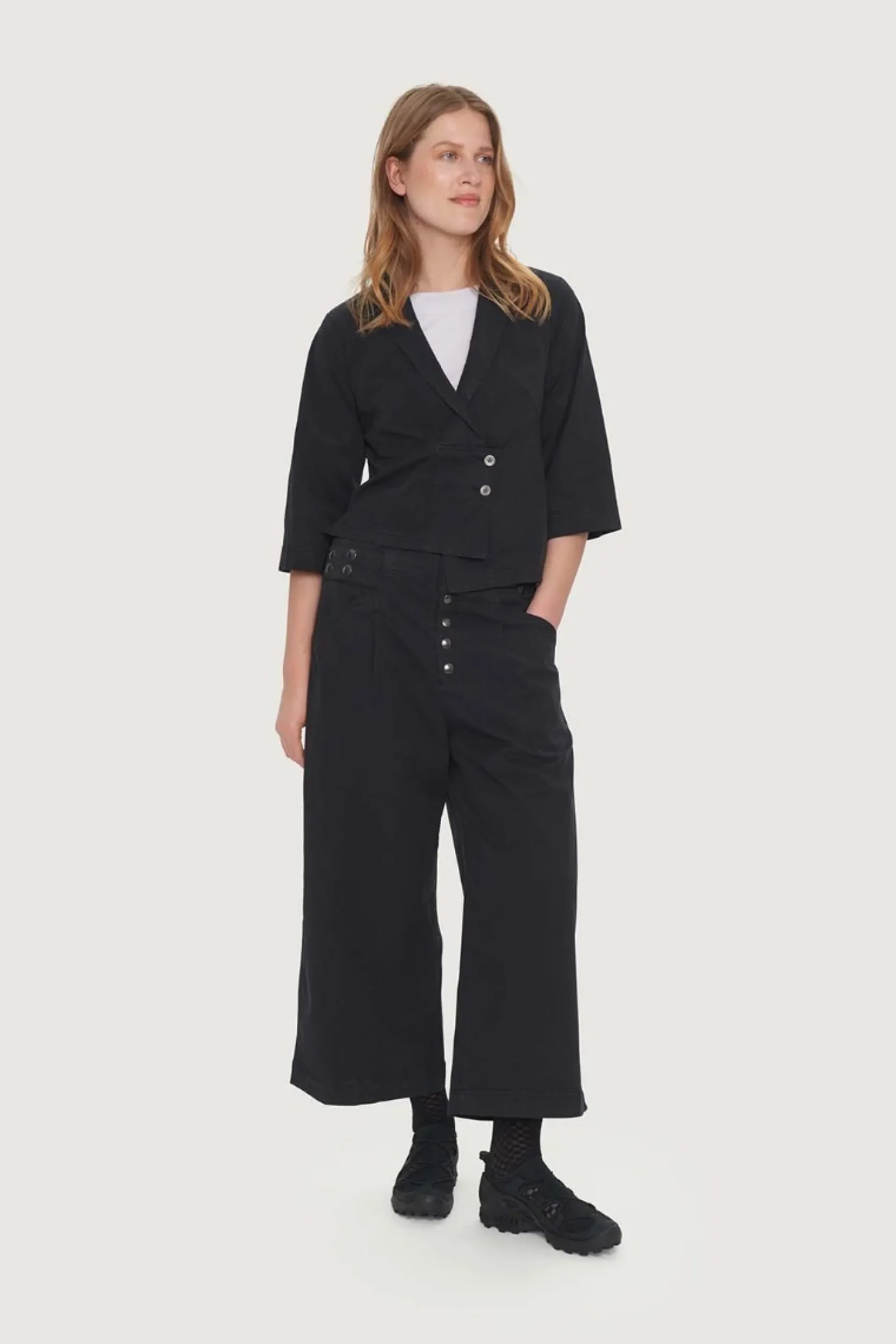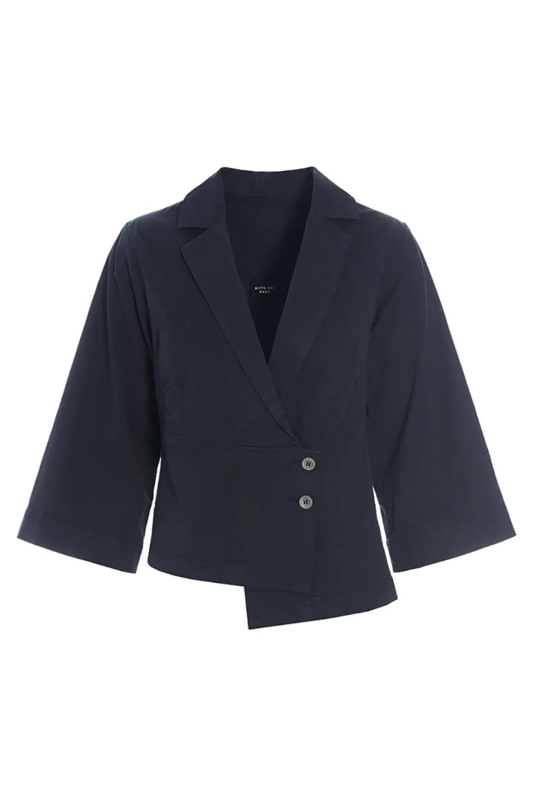 Den asymmetriske lukning giver denne jakke en næsten skulpturel facon, der sammen med det taljerede snit er meget flatterende. Jakken kan tilføre et personligt touch til enhver underdel. Og sætter du den til de matchende Wabi-bukser, får du et meget personligt og klædeligt outfit.Modellen på billede er 180 cm og iført str. SFuld længde i str. S, ca. 64 cm på det længeste sted.