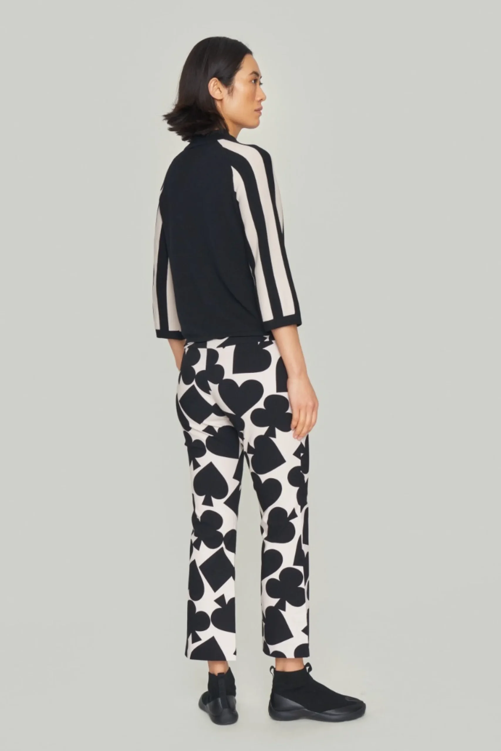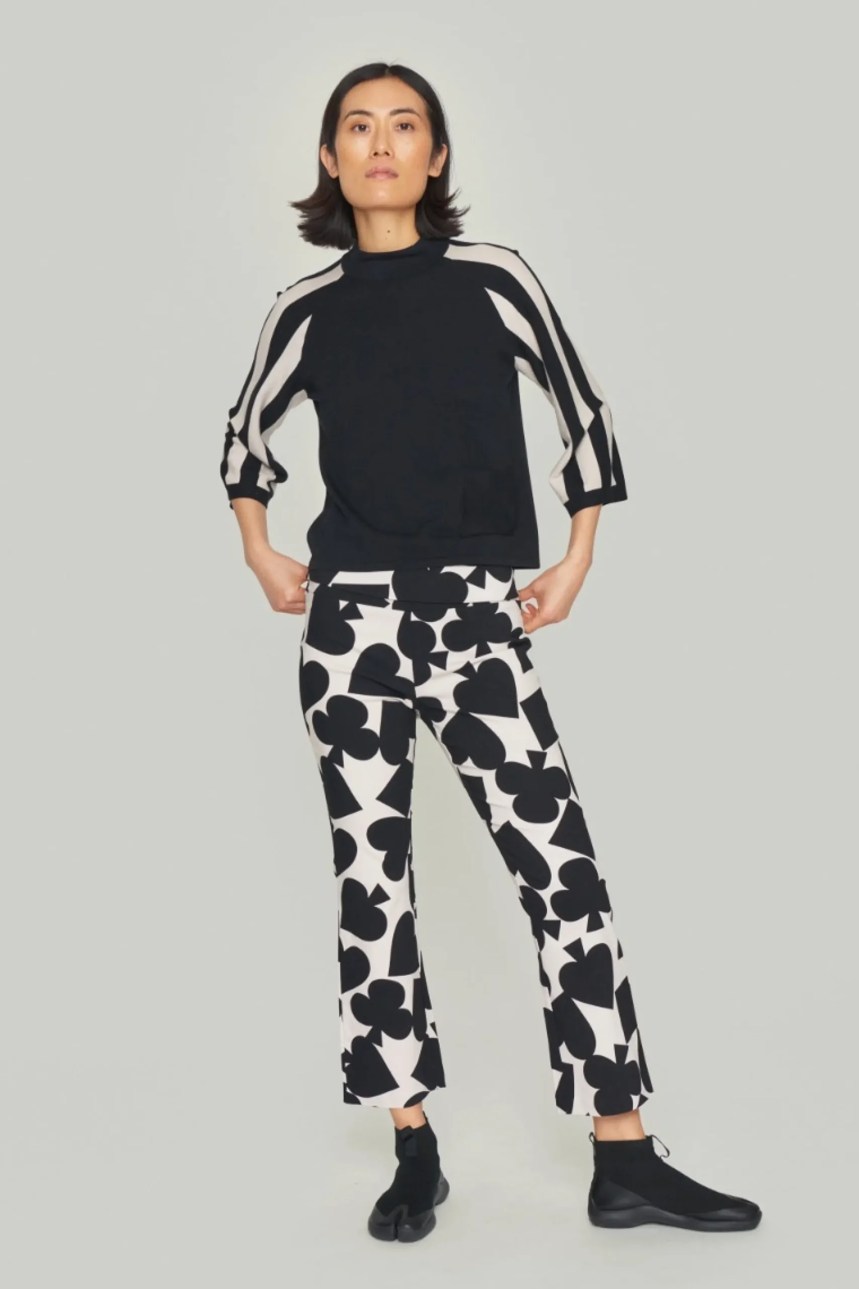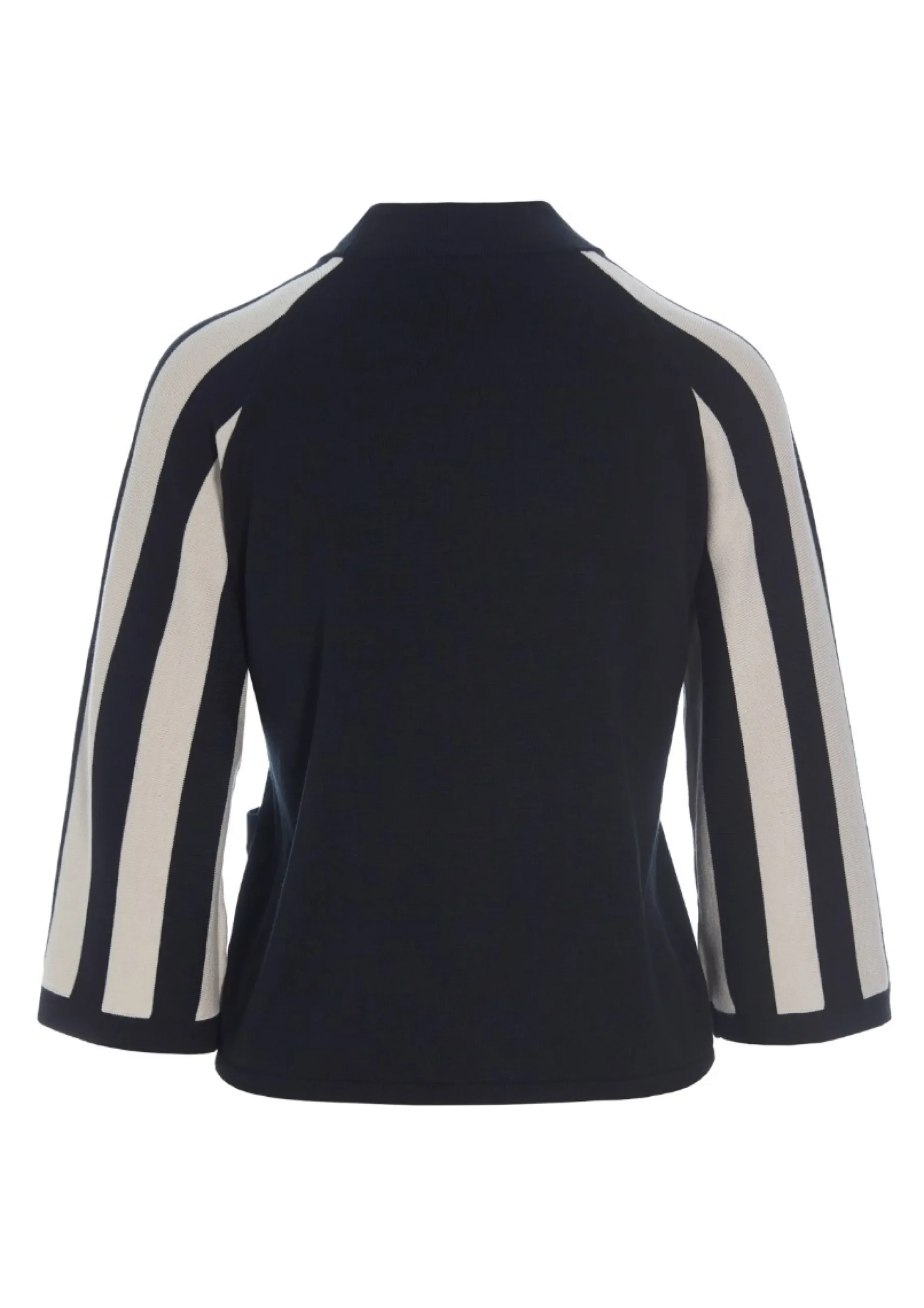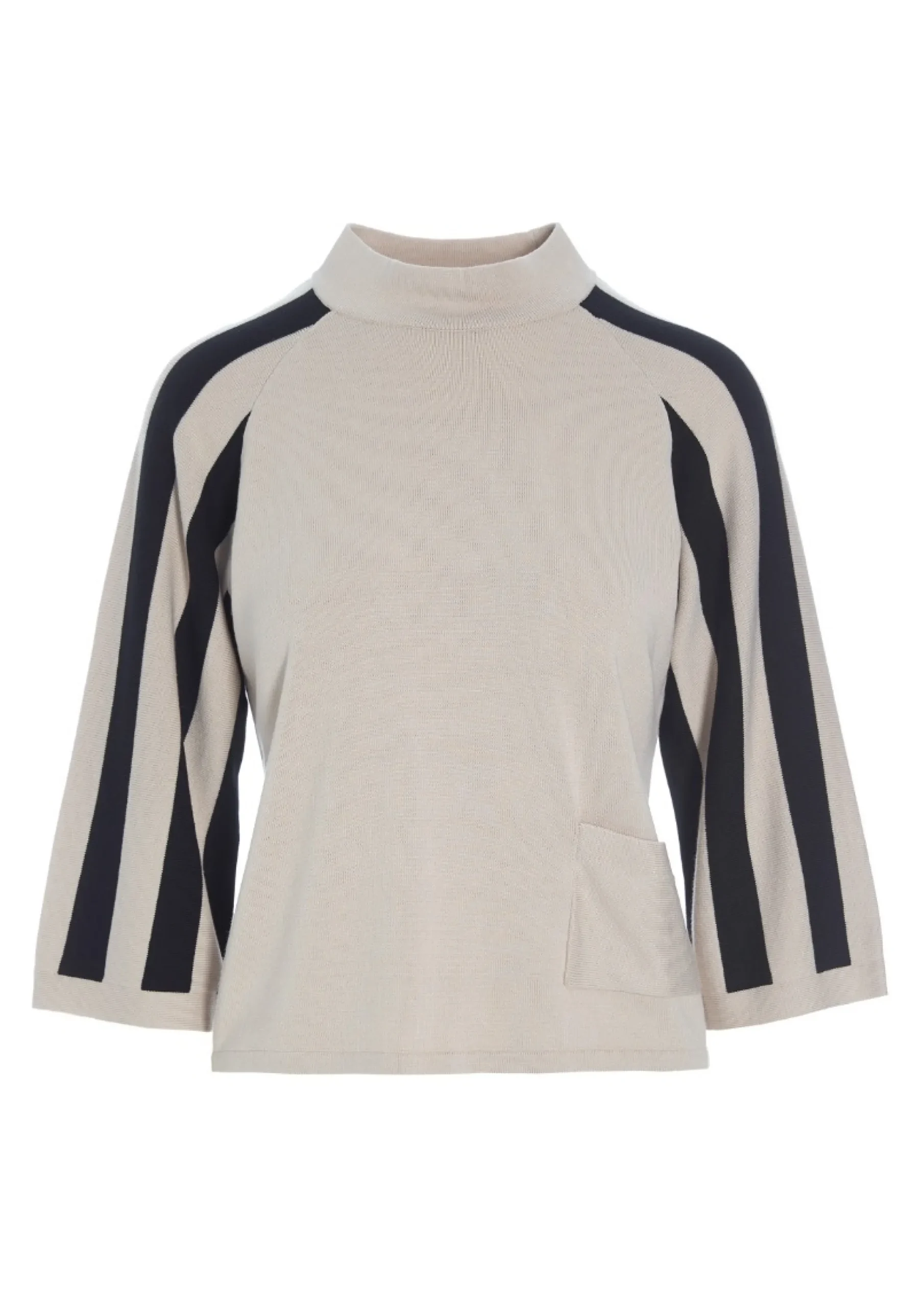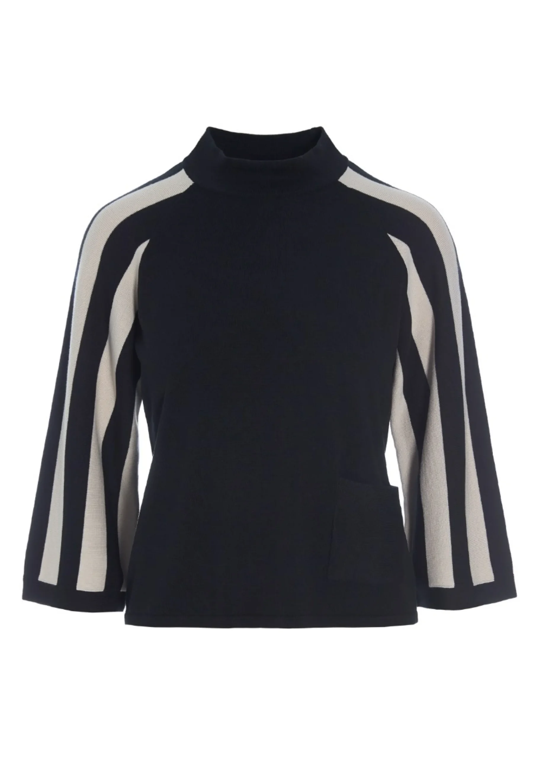 Højhalset bluse med striber på ærmerne, hvilket skaber en flot grafisk effekt. Den finstrikkede bluse er enkel i snittet og oplagt at bruge med herrebukser for et klassisk look. Eller sæt en feminin underdel til, som kan skabe kontrast til de stringente striber.Modellen på billede er 179 cm og iført str. SFuld længde i str. S, ca. 54 cm