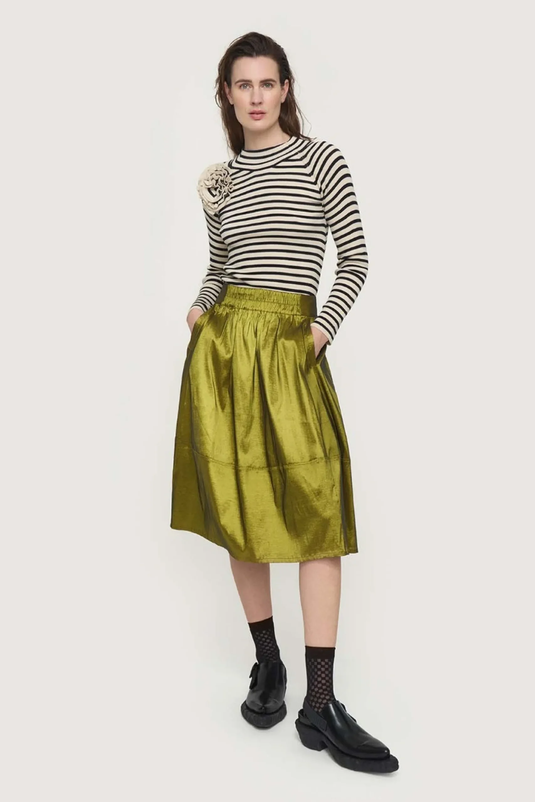 Strikbluse med rib og den fineste matchende blomst som dekoration. Blusen er relativt tætsiddende, og når ribstrikken følger kroppens kurver, skabes en smuk effekt. Lad blusen og blomsten opgradere ethvert hverdags-look, og brug dem tilsat festlige bukser eller nederdel til en middag i byen.Modellen på billede er 180 cm og iført str. SFuld længde i str. S, ca. 59 cm.