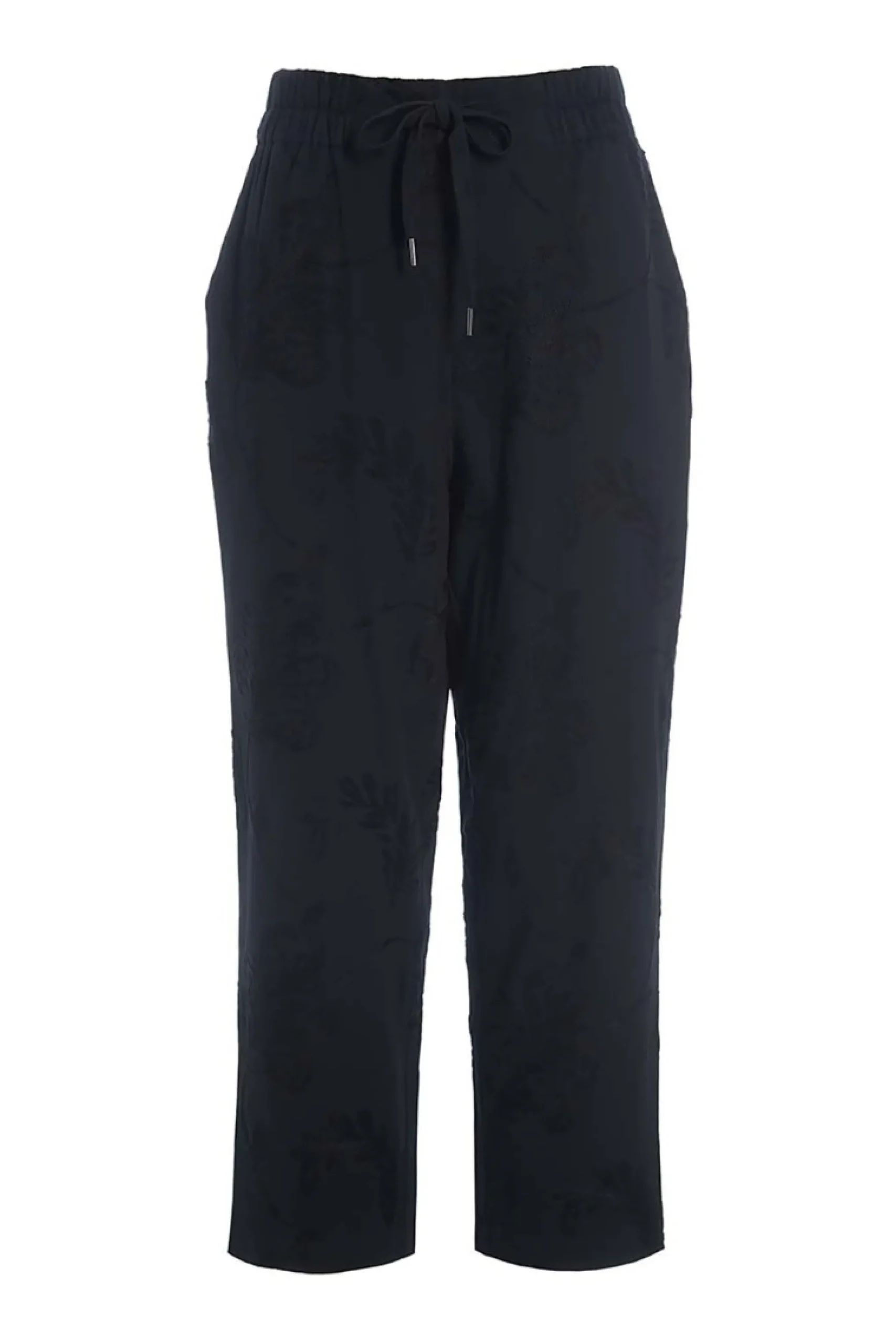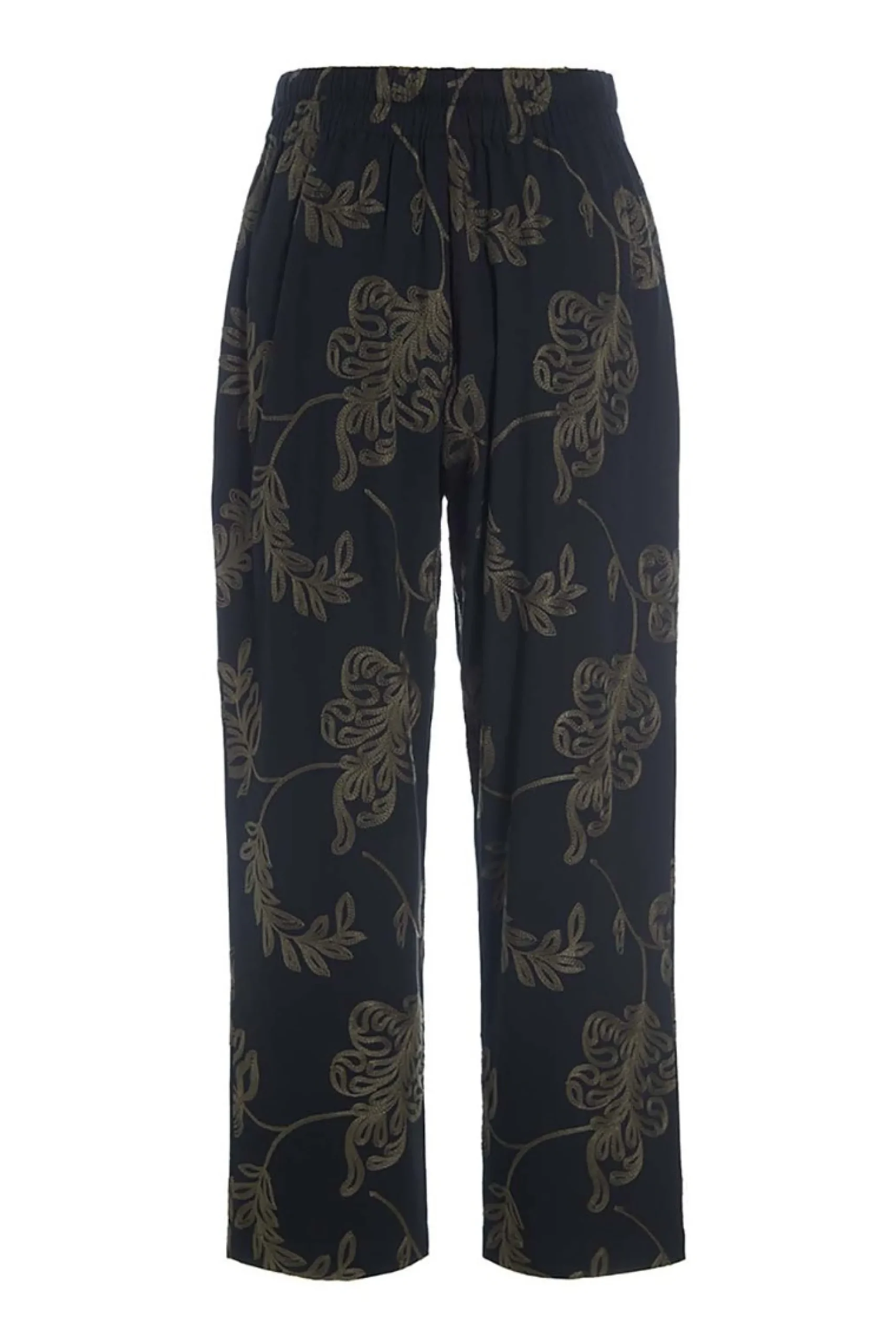 Velsiddende bukser udsmykket med det fineste broderede bladmotiv, der smyger sig op og ned ad benene. Bukserne sidder flot til i taljen takket være linningen med elastik og bindebånd. De kan bruges til at opgradere enhver overdel, og kombinerer du bukserne med den matchende Embroidered Leaf jakke, får du et smart sæt.Modellen på billede er 180 cm og iført str. SLængde målt fra taljen i str. S: ca. 99 cm.