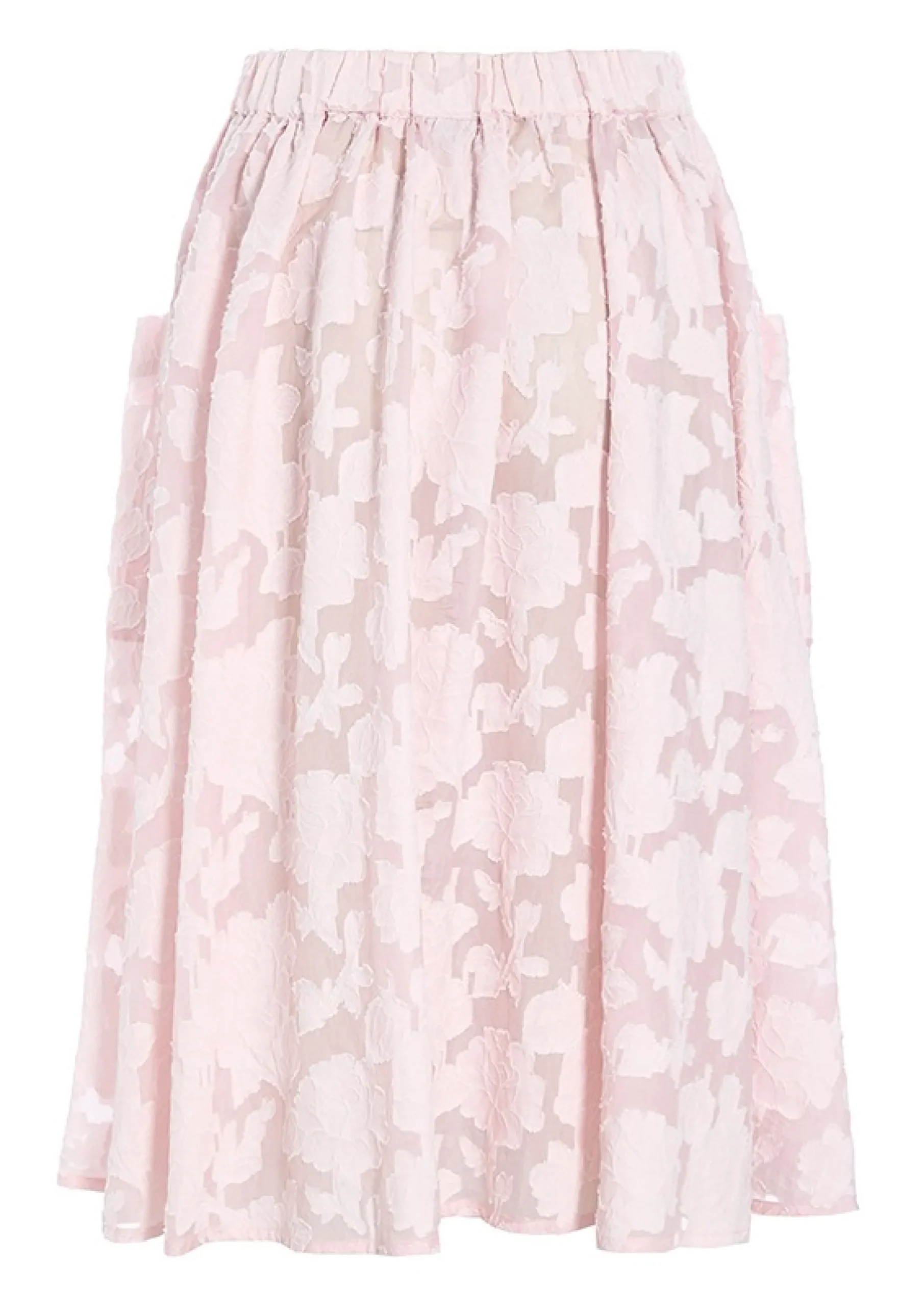 Smuk nederdel med blomstermønster i det lækreste stof, der er transparent, hvilket gør nederdelen både sensuel og eventyrlig. Der er masser af vidde i skørtet, og sammen med den elastiske linning skaber det en fantastisk flot silhuet. Brug nederdelen over fx tætsiddende bukser, korte shorts eller et underskørt. Du kan også bære den alene, så dine ben anes gennem stoffet.Modellen på billedet er 180 cm og iført str. SFuld længde i størrelse S, ca. 74 cm.