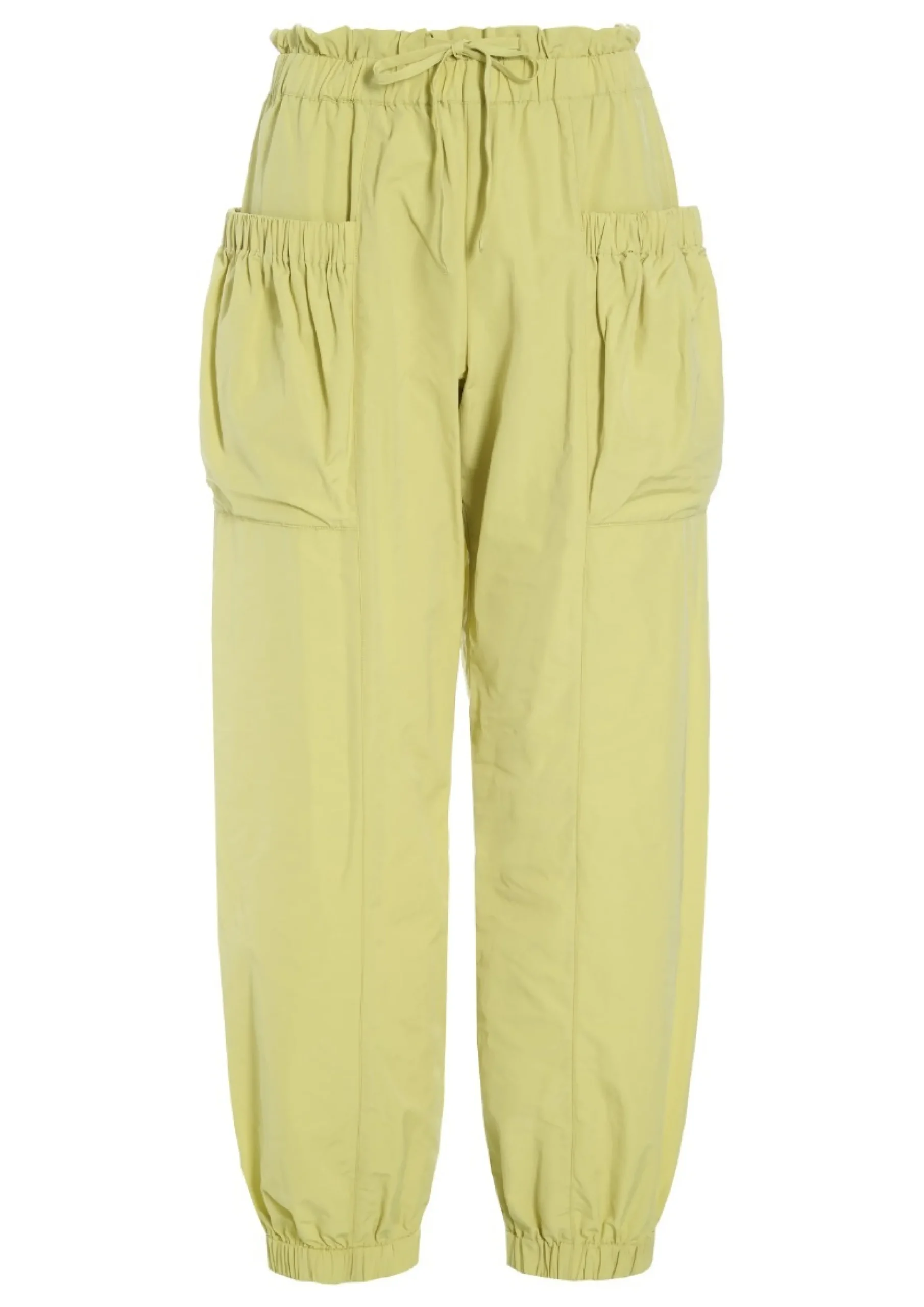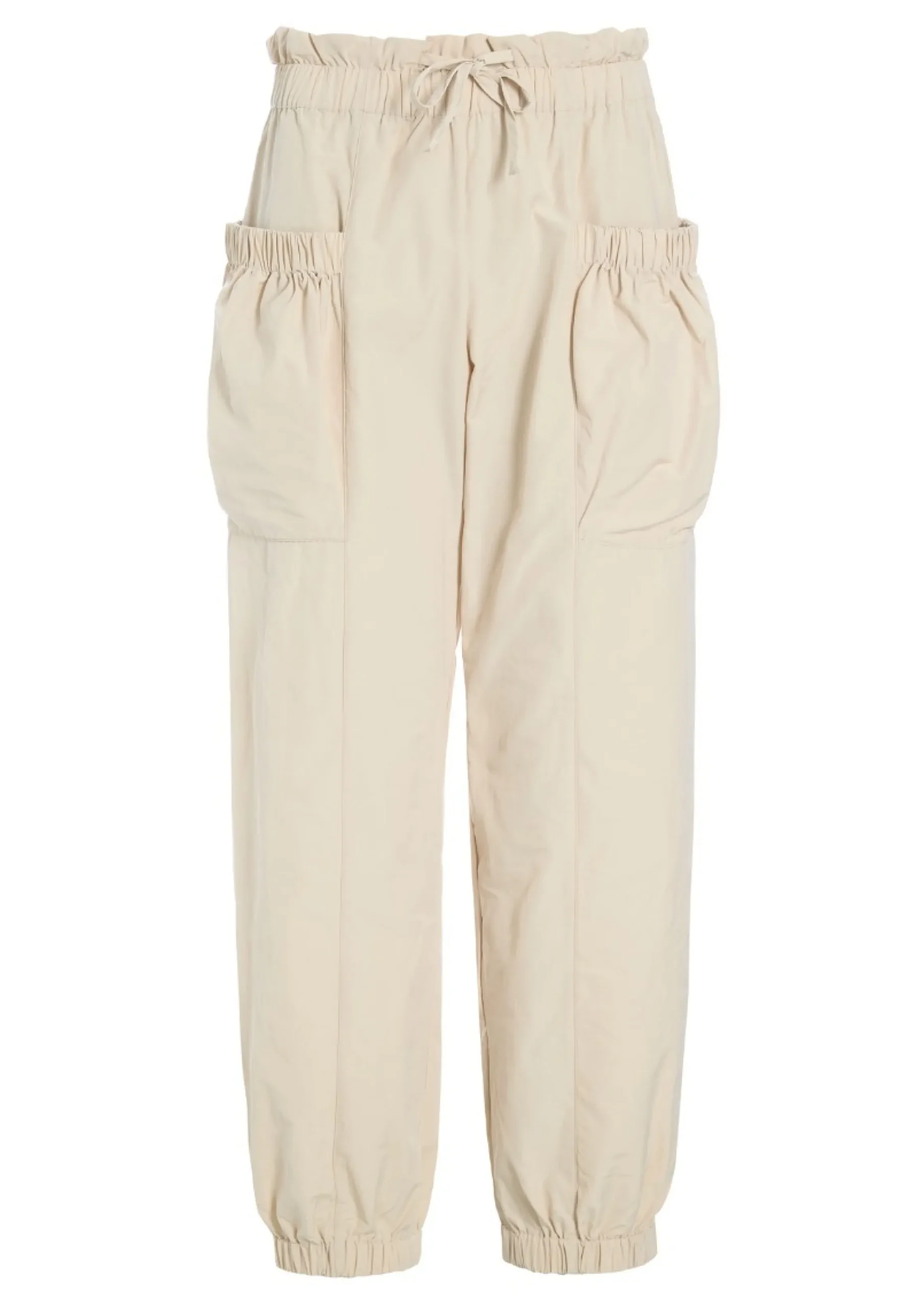 Rummelige bukser i en lækker bomuldskvalitet. De sidder flot til i taljen og har elastik ved anklerne, hvilket giver en flot effekt, der sammen med de store lommer på benene, gør bukserne meget klædelige.Modellen på billede er 178 cm og iført str. SLængde målt fra taljen i str. S: ca. 102 cm.