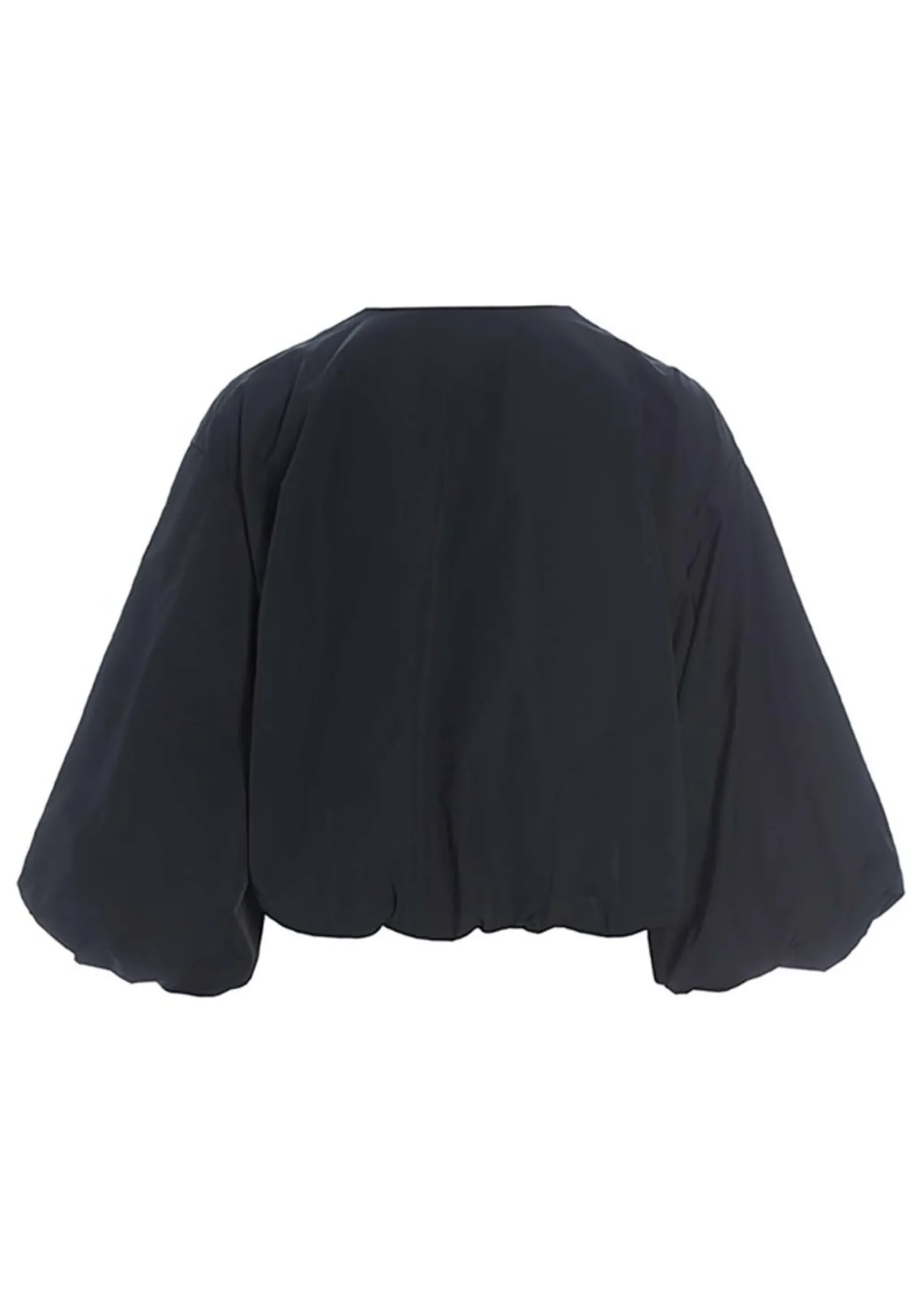 Fantastisk smuk jakke med masser af volumen. Den har brede, puffy ærmer og er kort i livet. Jakken har skjult magnetisk knaplukning. Du kan bære den lukket åbentstående med en tætsiddende bluse eller kjole under. En elegant jakke, der kan dreje dit outfit i en festlig retning.Modellen på billede er 180 cm og iført str. SFuld længde i str. S, ca. 50 cm.