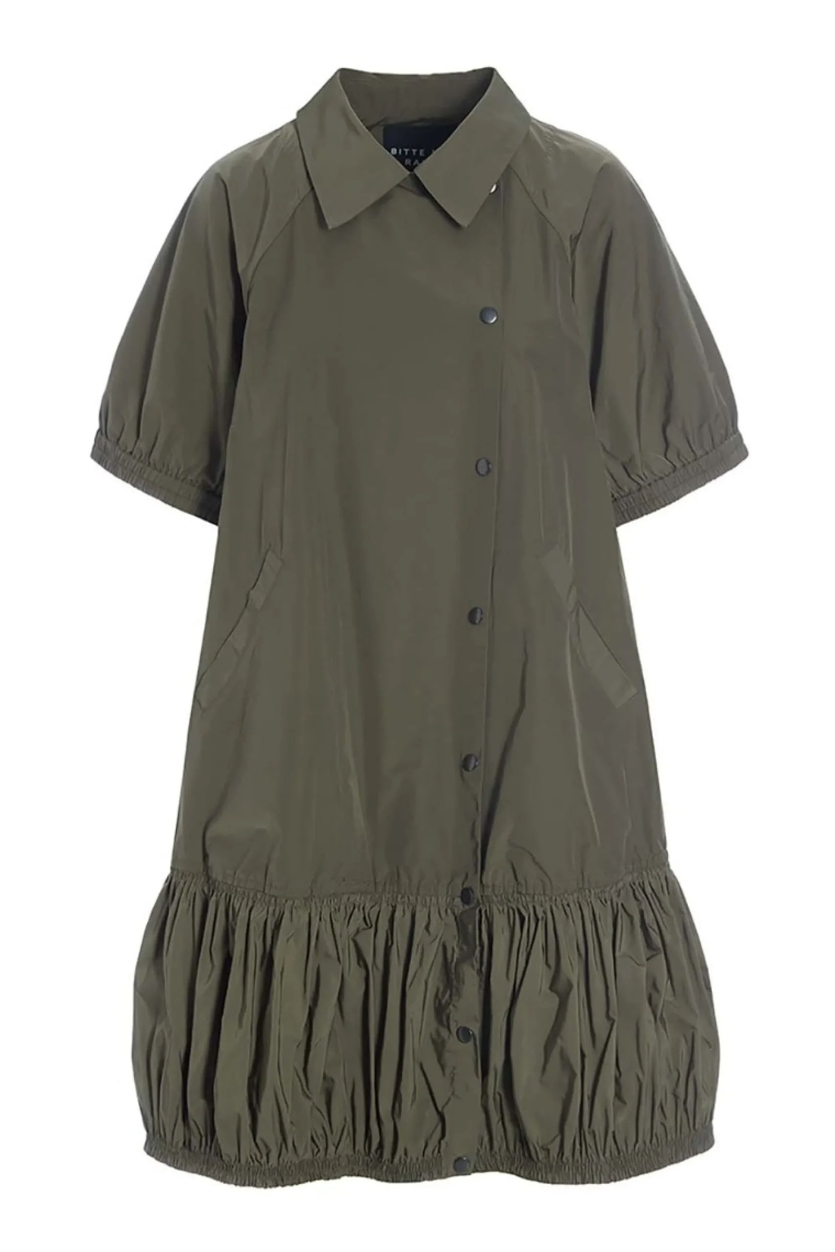 Fantastisk flot skjortekjole med rynkeeffekt forneden og korte ærmer med elastik, der er med til at give kjolen et puffy udtryk. Med denne kjole er du lækkert klædt i en fart. Alt du behøver er at tilsætte strømpebukser eller bukser og måske en langærmet t-shirt på kolde dage.Modellen på billede er 180 cm og iført str. SFuld længde i str. S, ca. 99 cm.