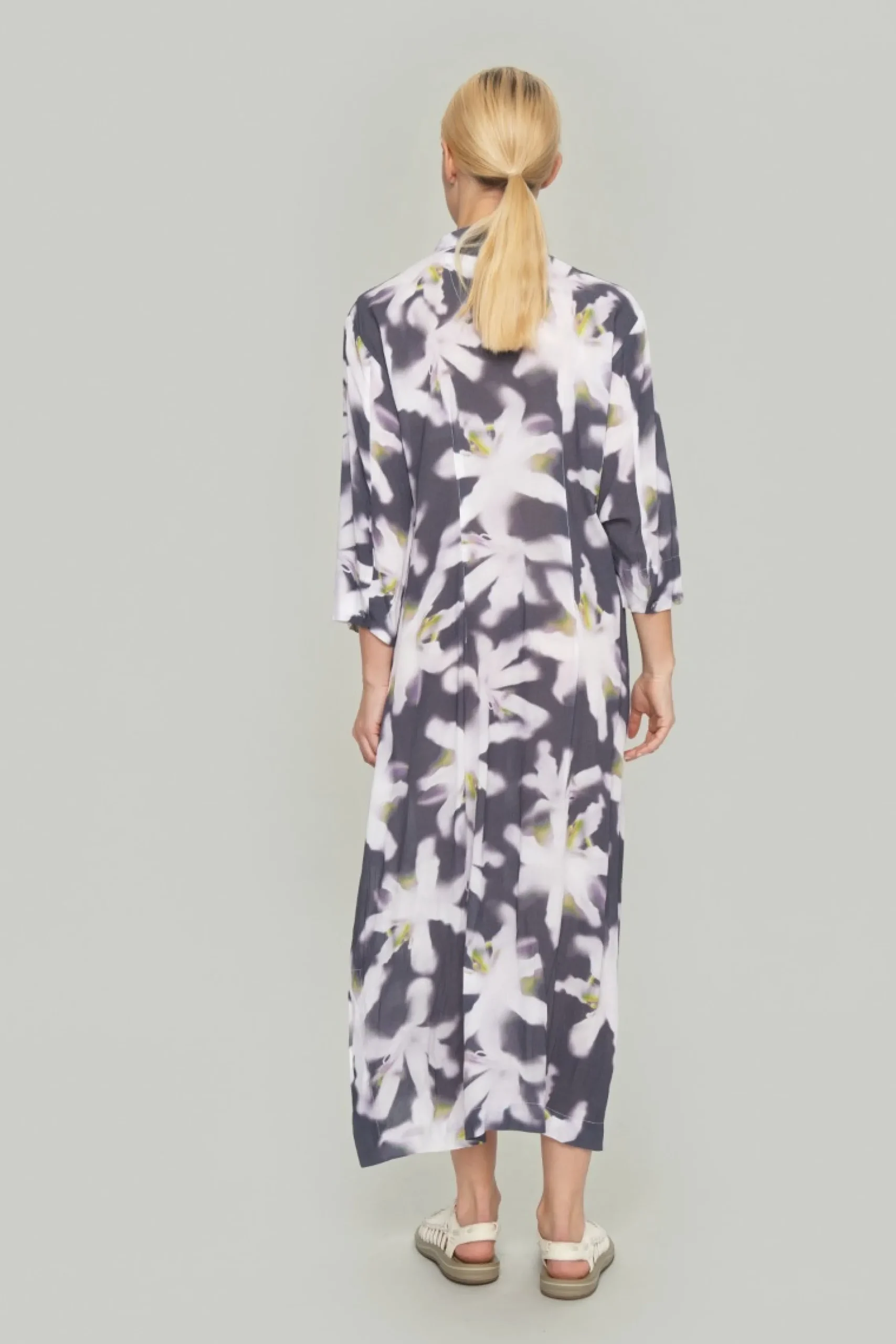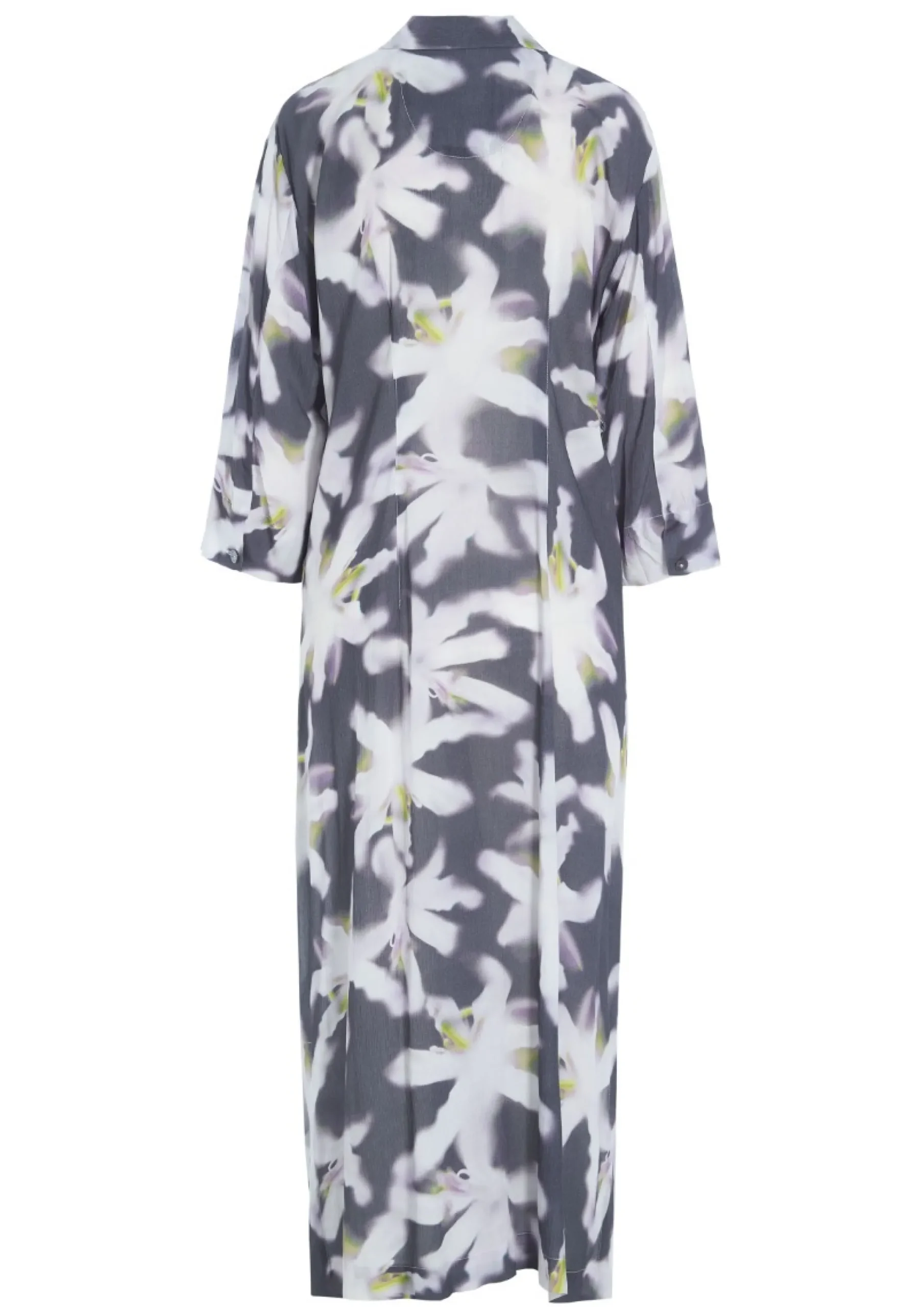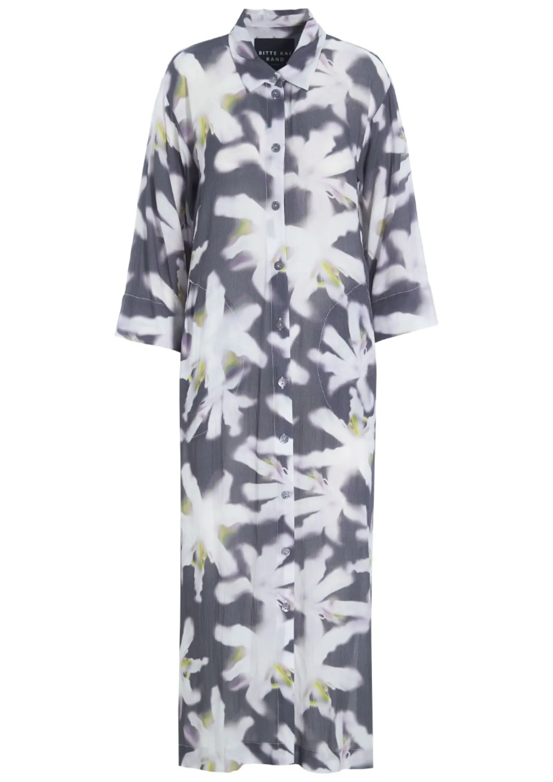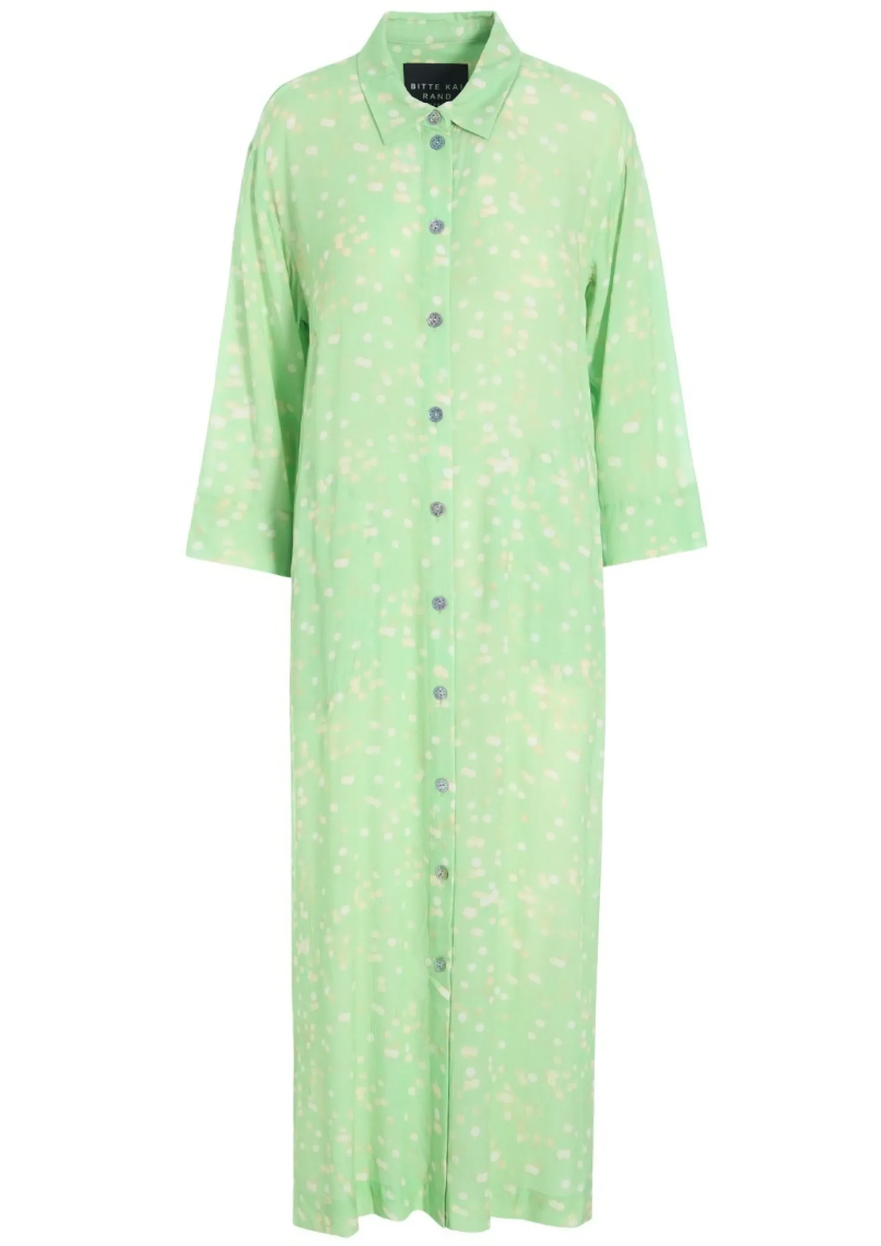 Lang, elegant skjortekjole med et kunstfærdigt print. Kjolen er smuk i sig selv og behøver ikke andre accessories. Lad blot skoene bestemme, hvor festligt looket skal være.Modellen på billede er 178 cm og iført str. SFuld længde i str. S, ca. 124 cm.