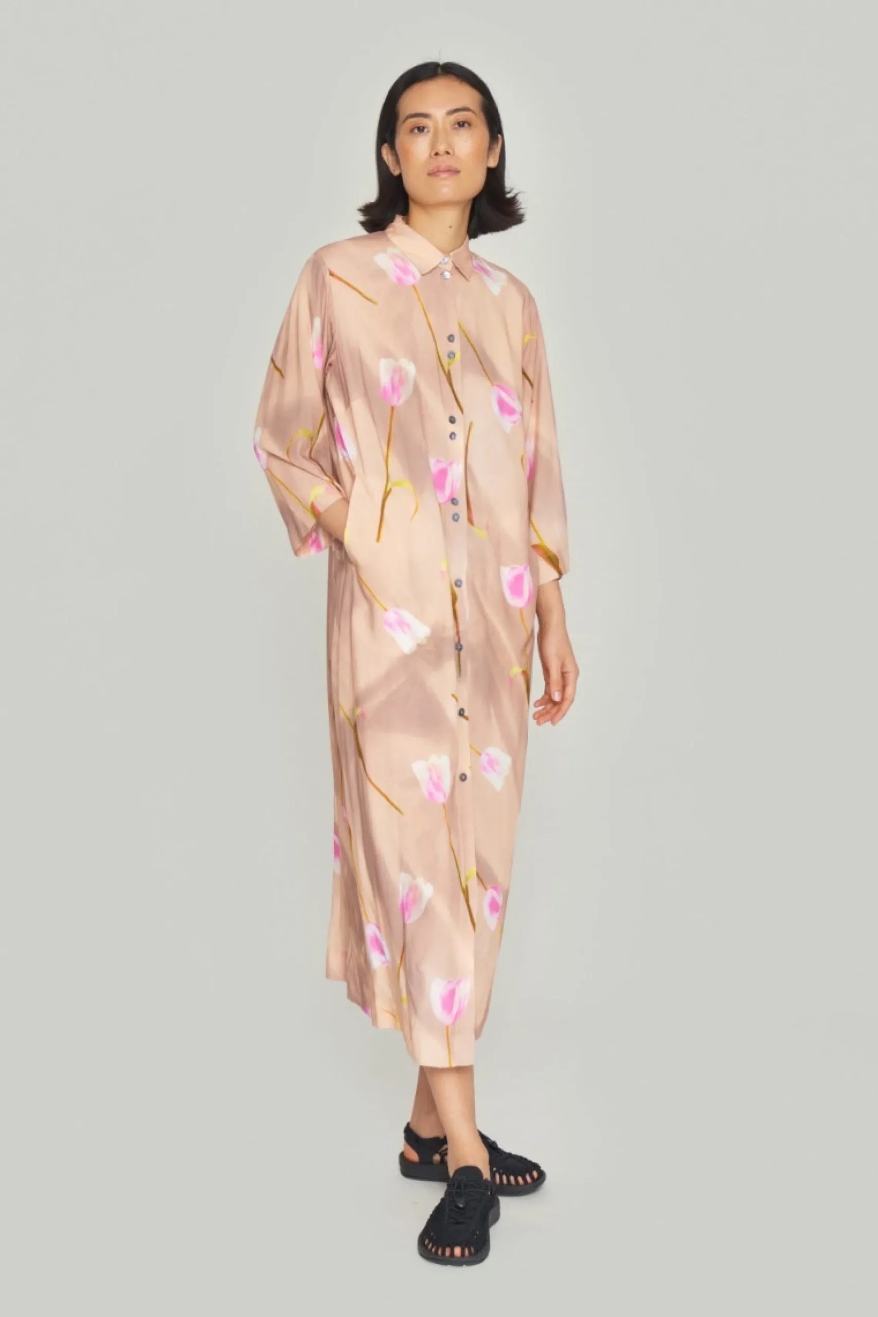 Det smukke print gør skjortekjolen her til noget ganske særligt. Kjolen er flot båret i al sin enkelhed, blot tilsat ballerinaer, sandaler eller herresko. Den kan også drejes i en mere festlig retning med høje hæle og et par iøjnefaldende øreringe.Modellen på billede er 178 cm og iført str. SFuld længde i str. S, ca. 129 cm.