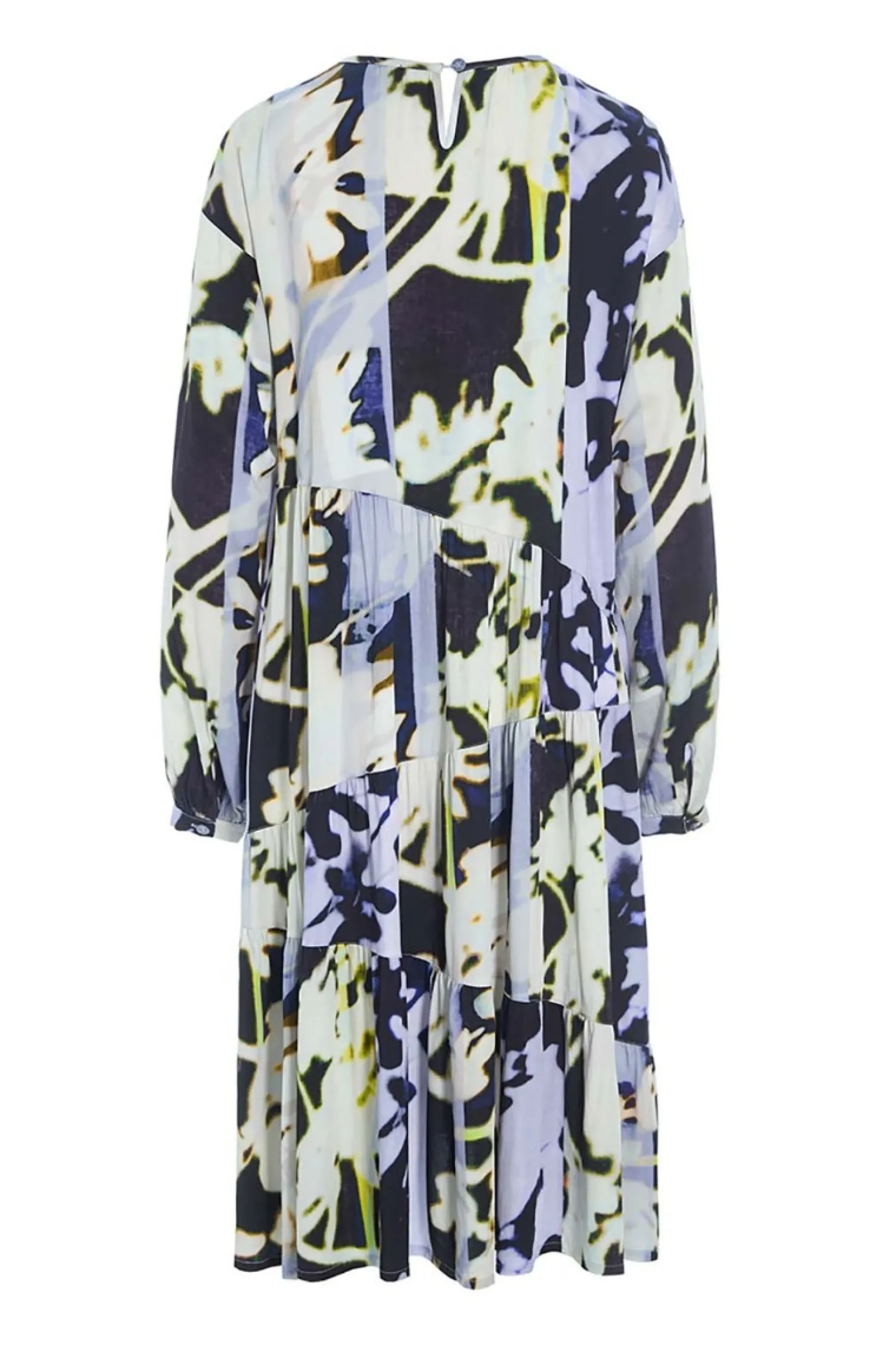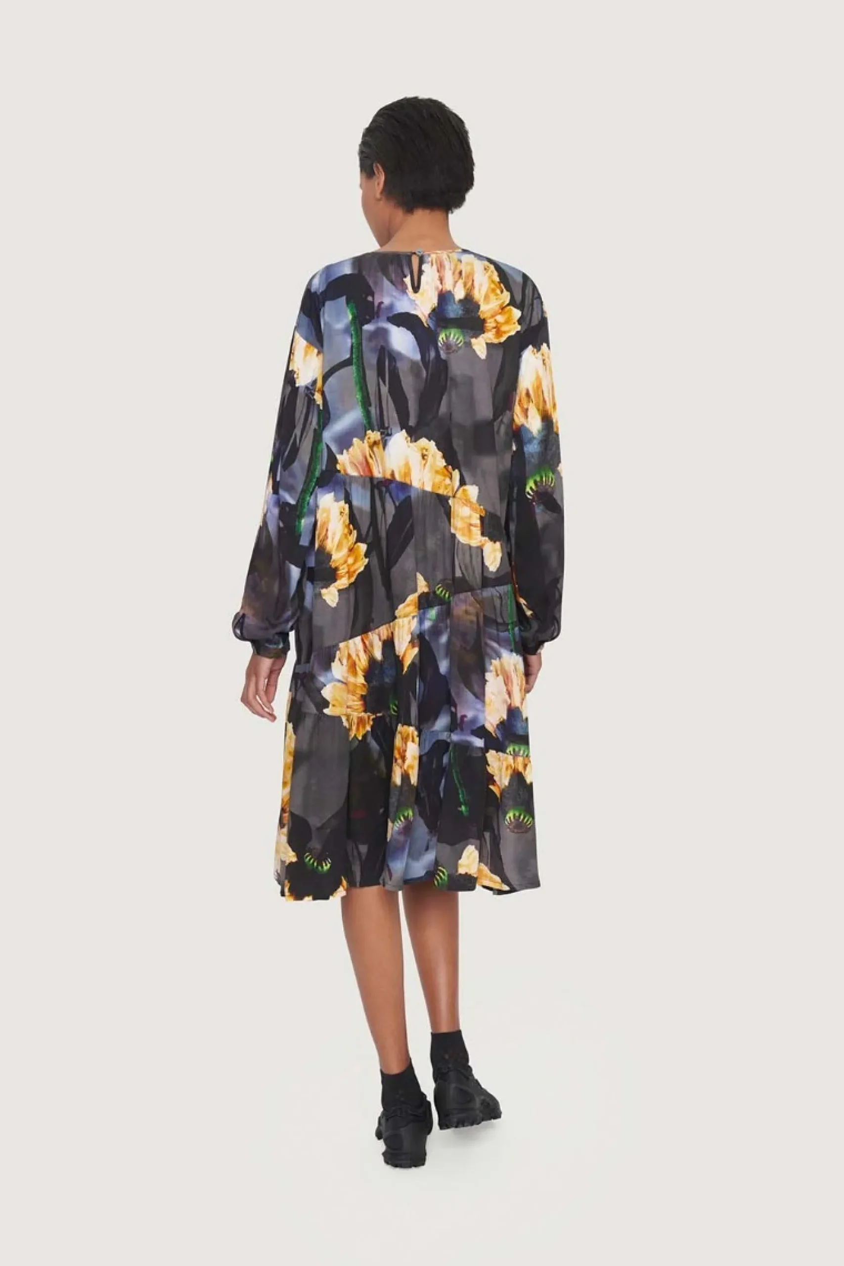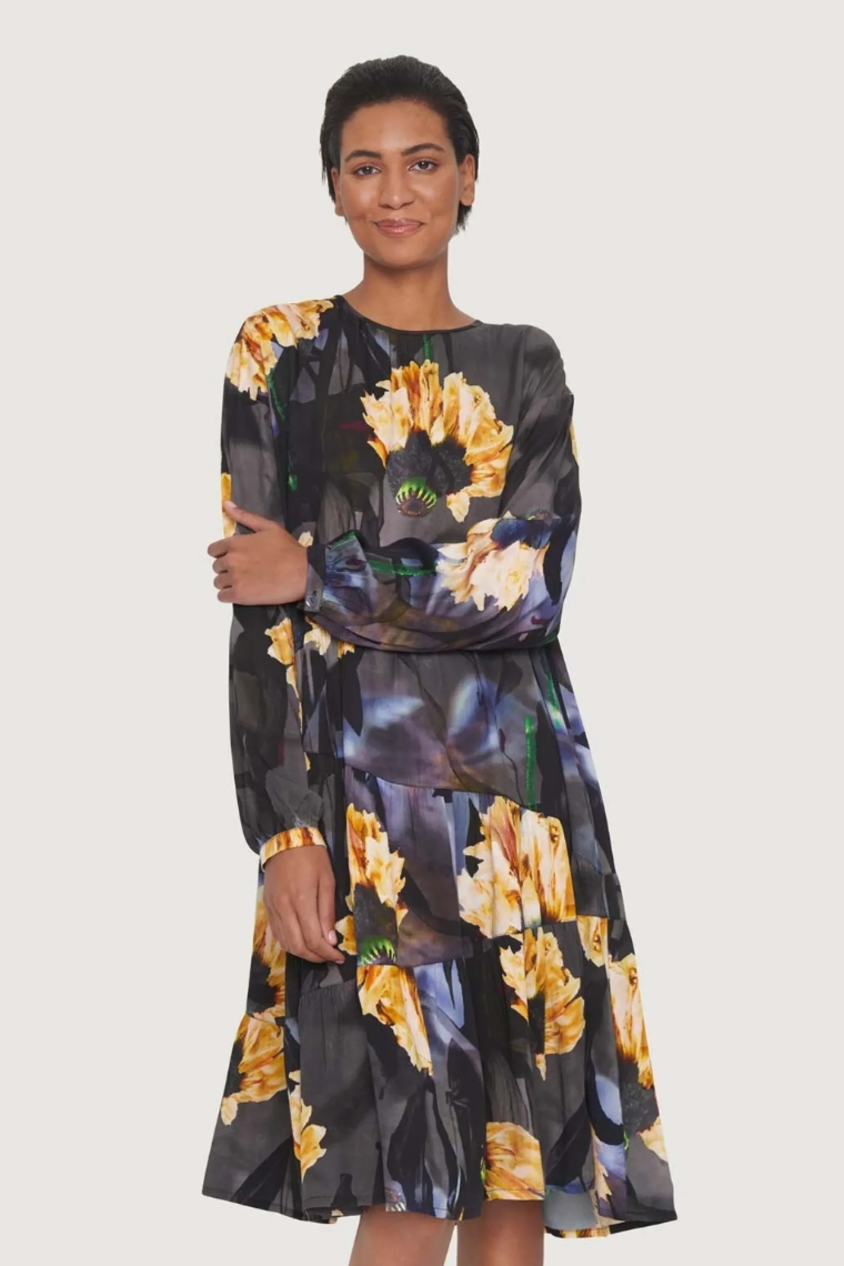 Kjole i FSC-certificeret viskose og med et enkelt snit og et blomstermønster i de smukkeste nuancer. Der er assymmetriske skæringer nedad kjolen, hvilket bryder det store print på en iøjnefaldende måde. Virkelig behagelig at have på.Modellen på billede er 180 cm og iført str. SFuld længde i str. S, ca. 109 cm.
