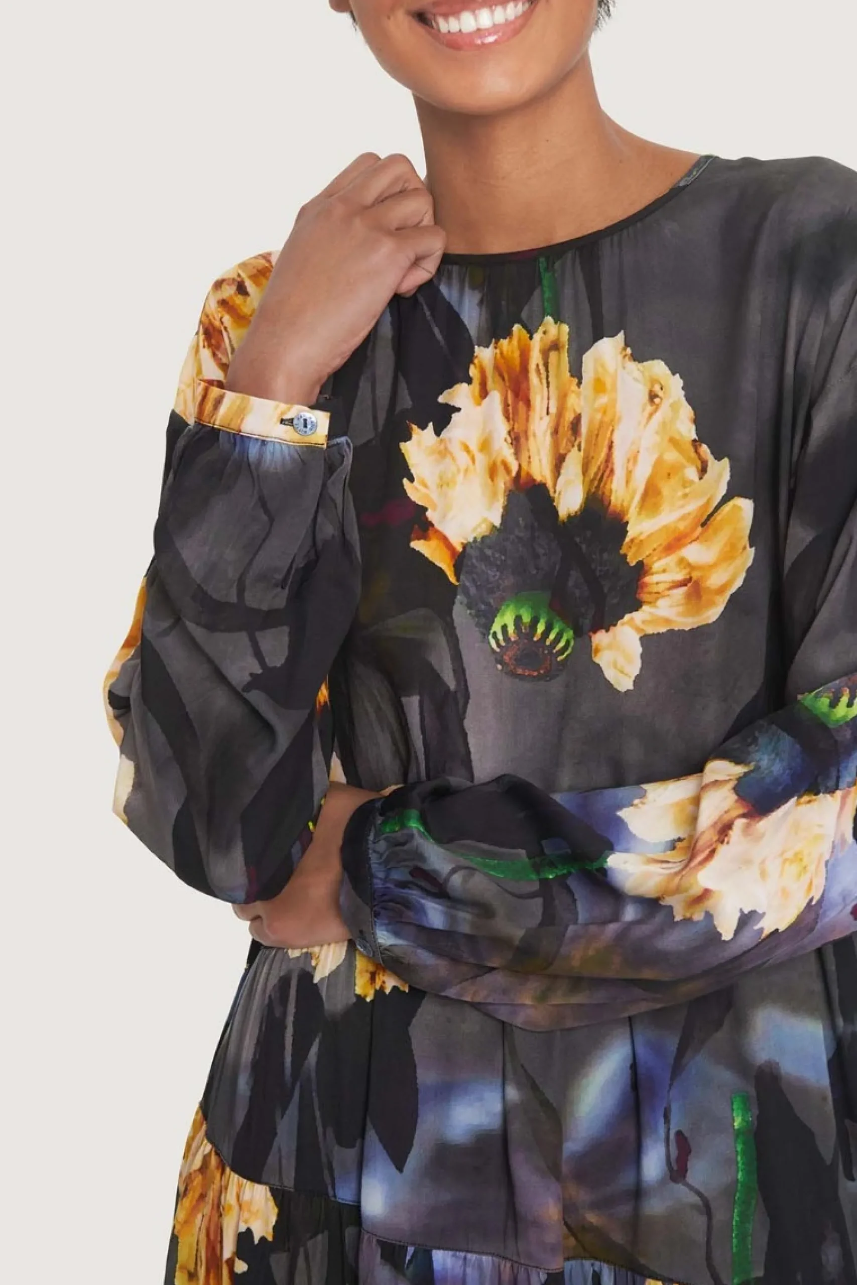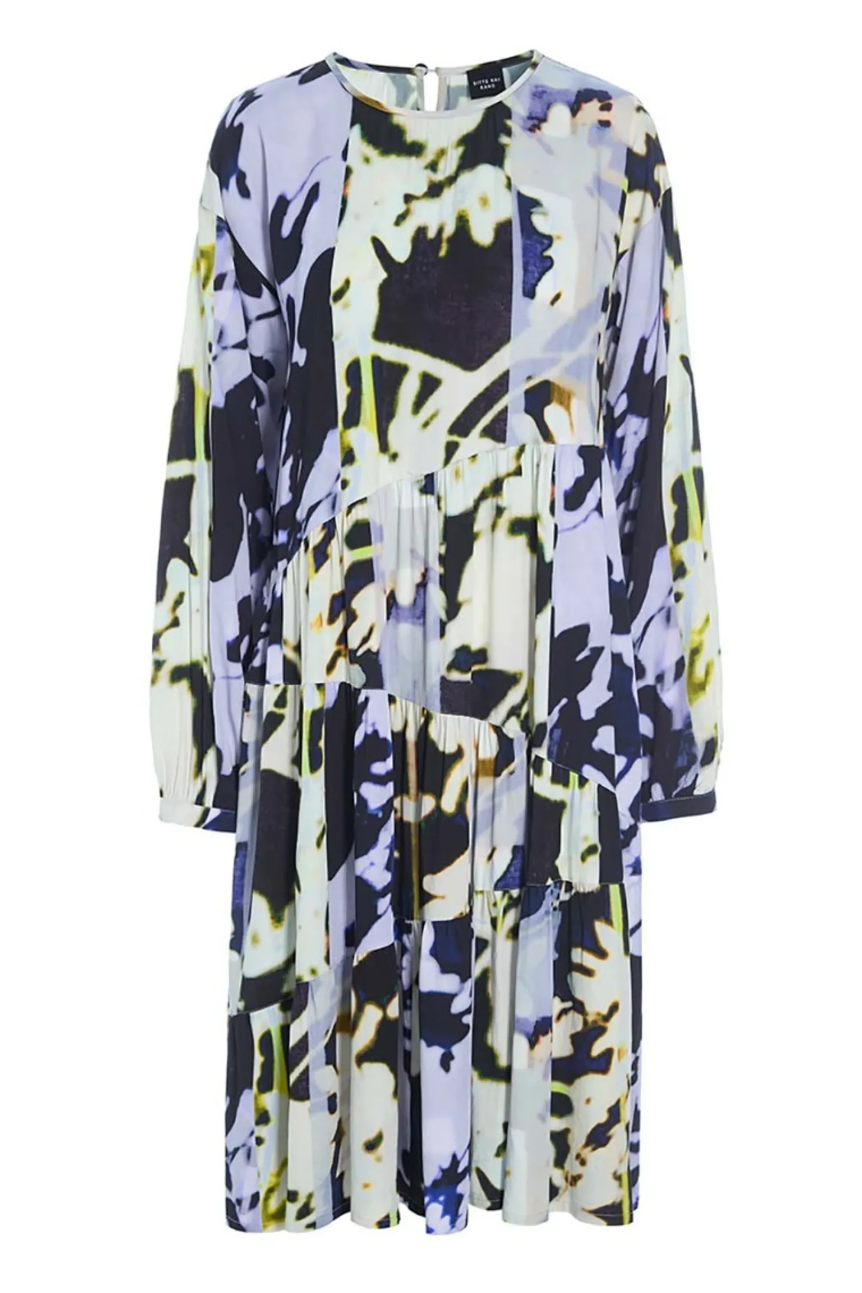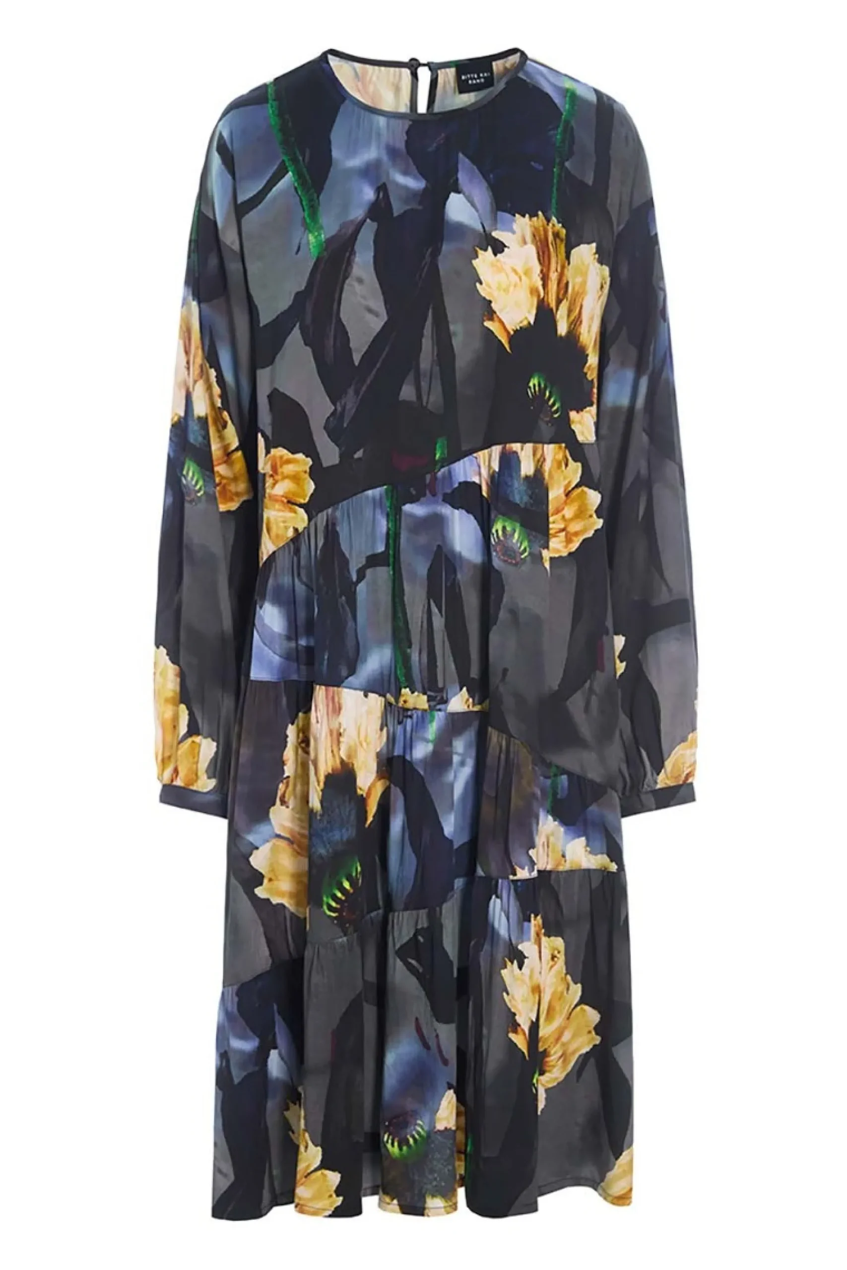 Kjole i FSC-certificeret viskose og med et enkelt snit og et blomstermønster i de smukkeste nuancer. Der er assymmetriske skæringer nedad kjolen, hvilket bryder det store print på en iøjnefaldende måde. Virkelig behagelig at have på.Modellen på billede er 180 cm og iført str. SFuld længde i str. S, ca. 109 cm.
