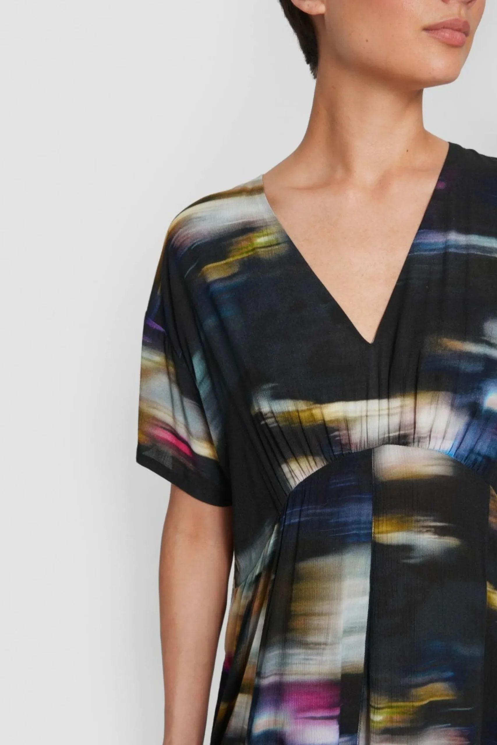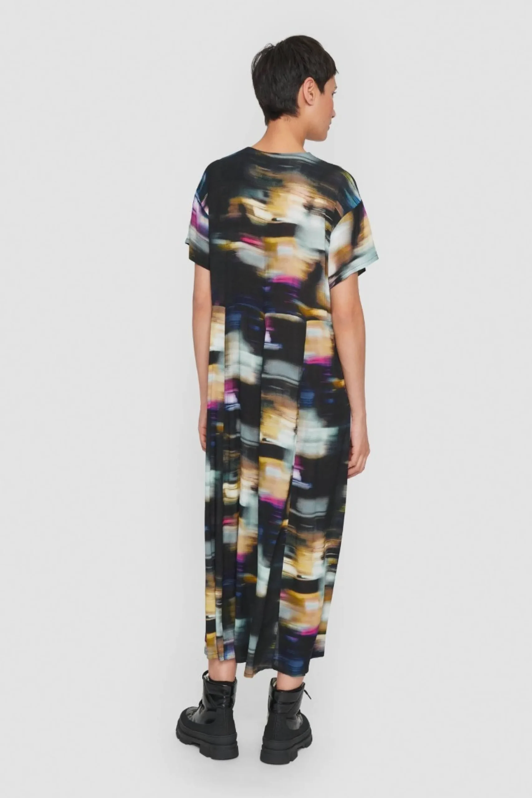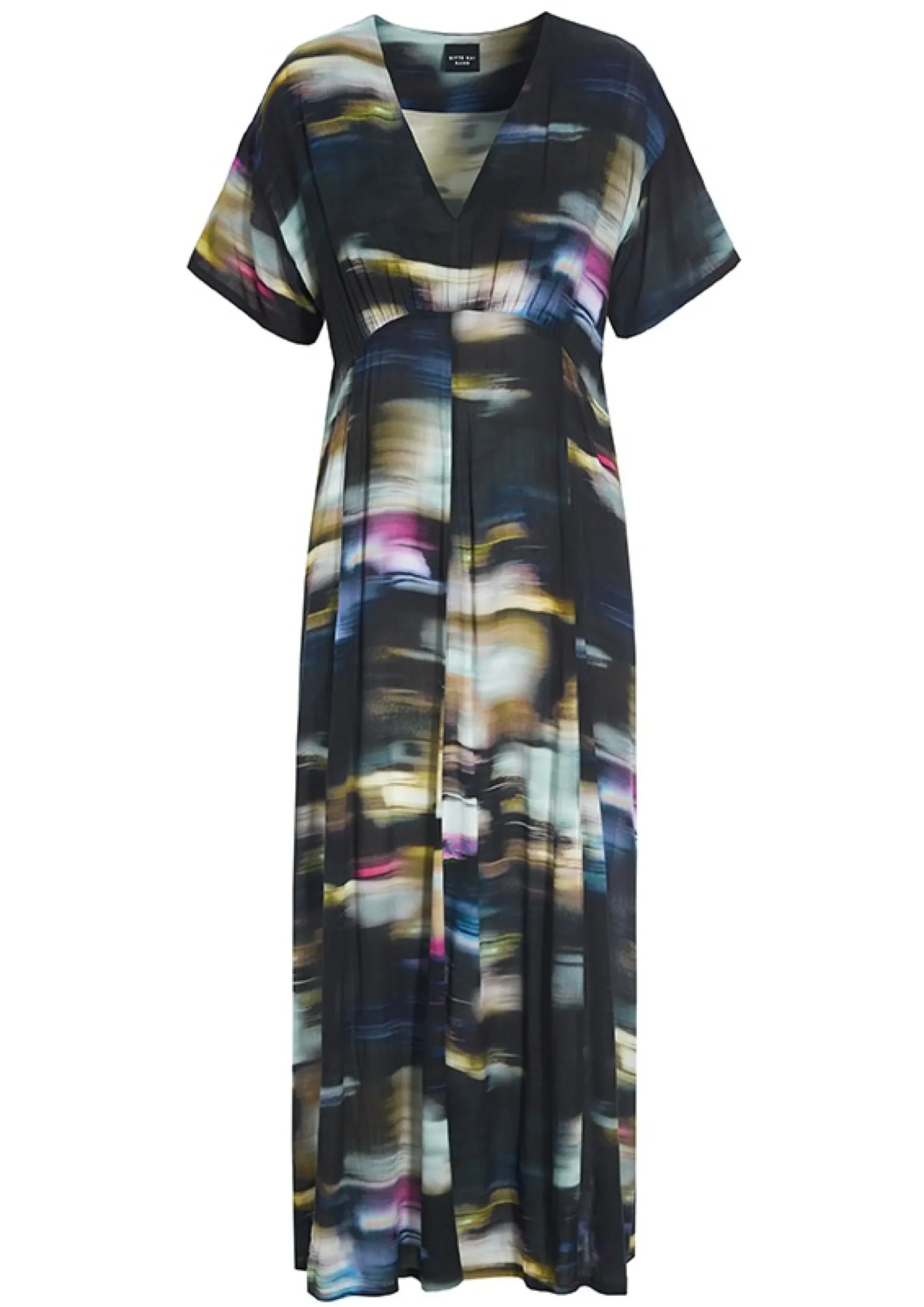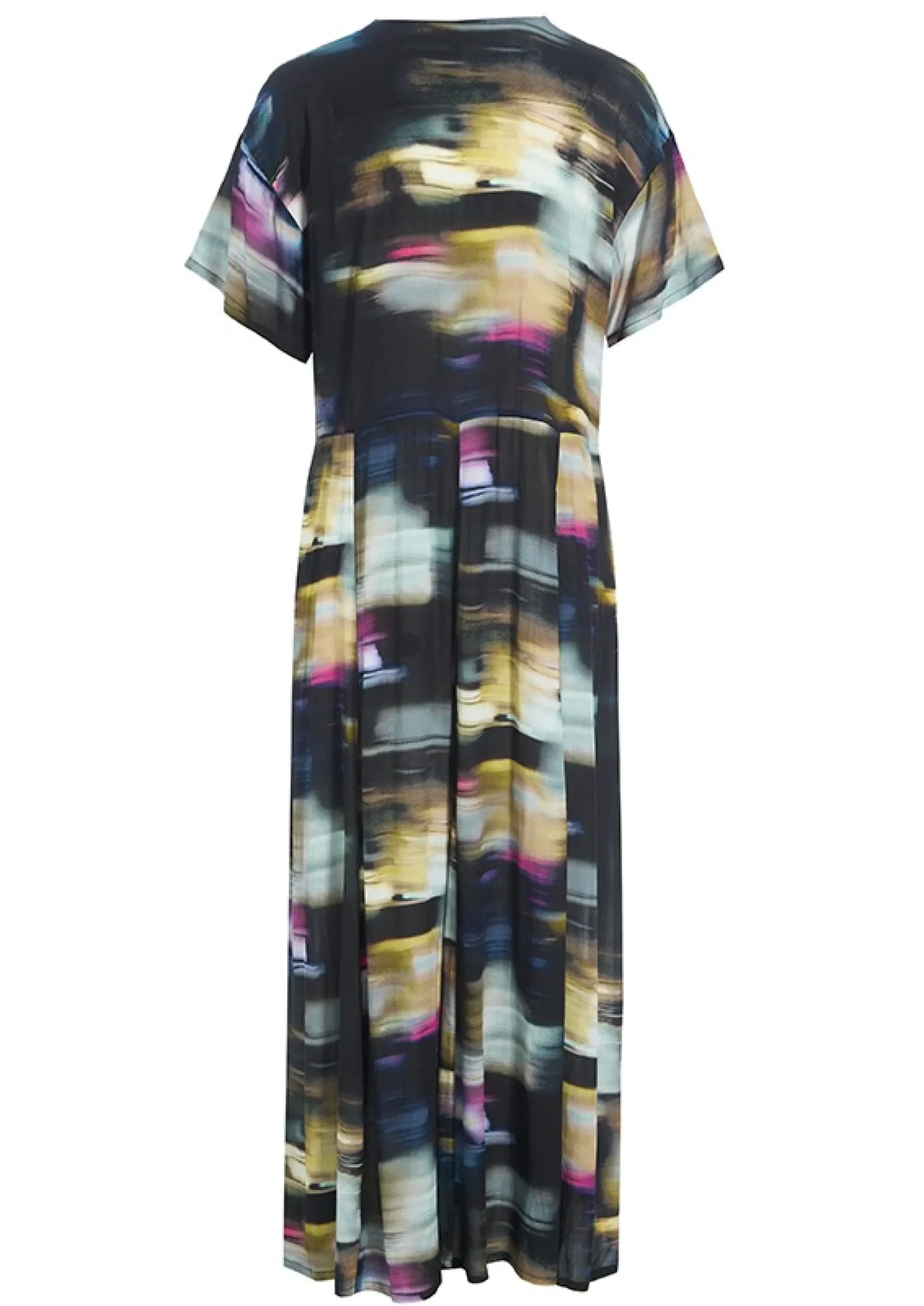 Med et print inspireret af byens lokkende lys er denne kjole et flot og farvestrålende indslag i garderoben. Det enkle snit gør, at kjolen kan bruges på mange måder. Sæt et par flade snøresko og en blazer eller bluse til. Eller brug kjolen om aftenen med høje hæle.Modellen på billede er 178 cm og iført str. SFuld længde i str. S, ca. 129 cm