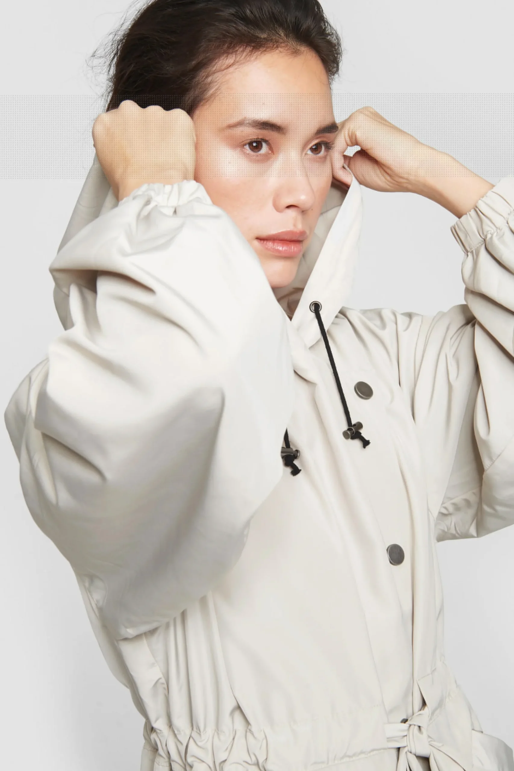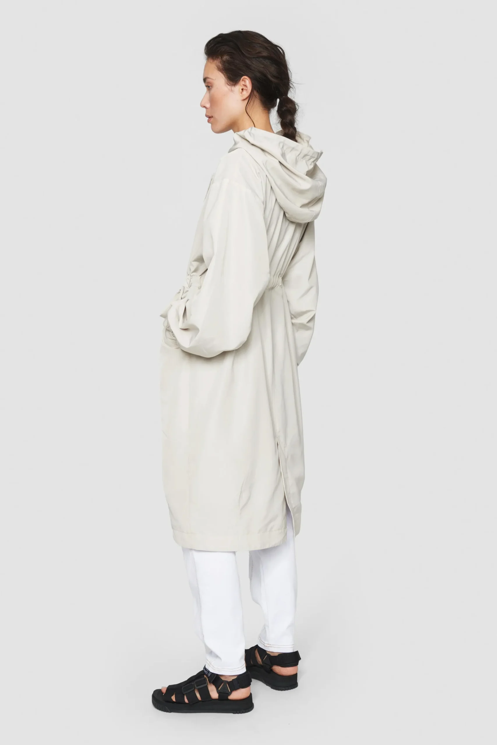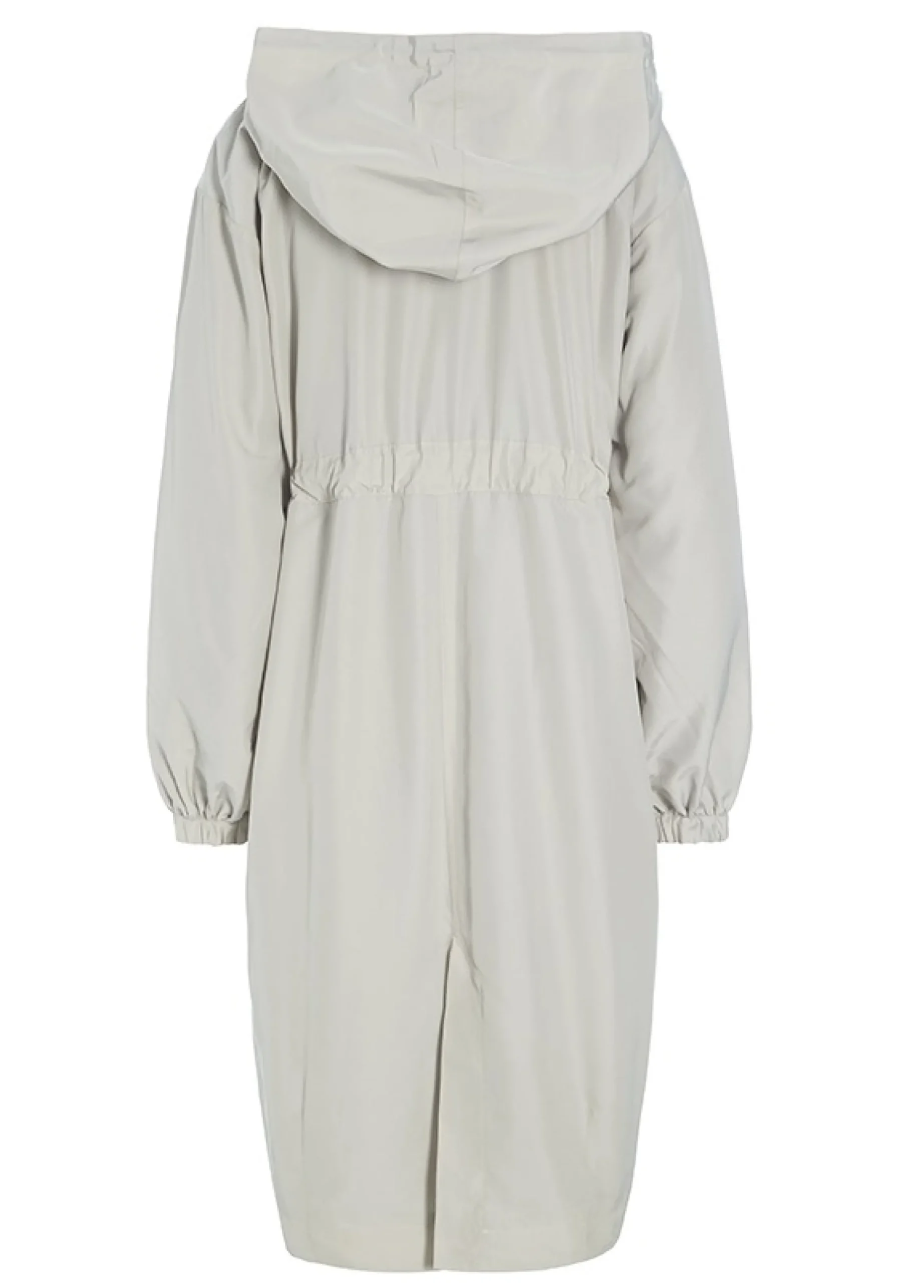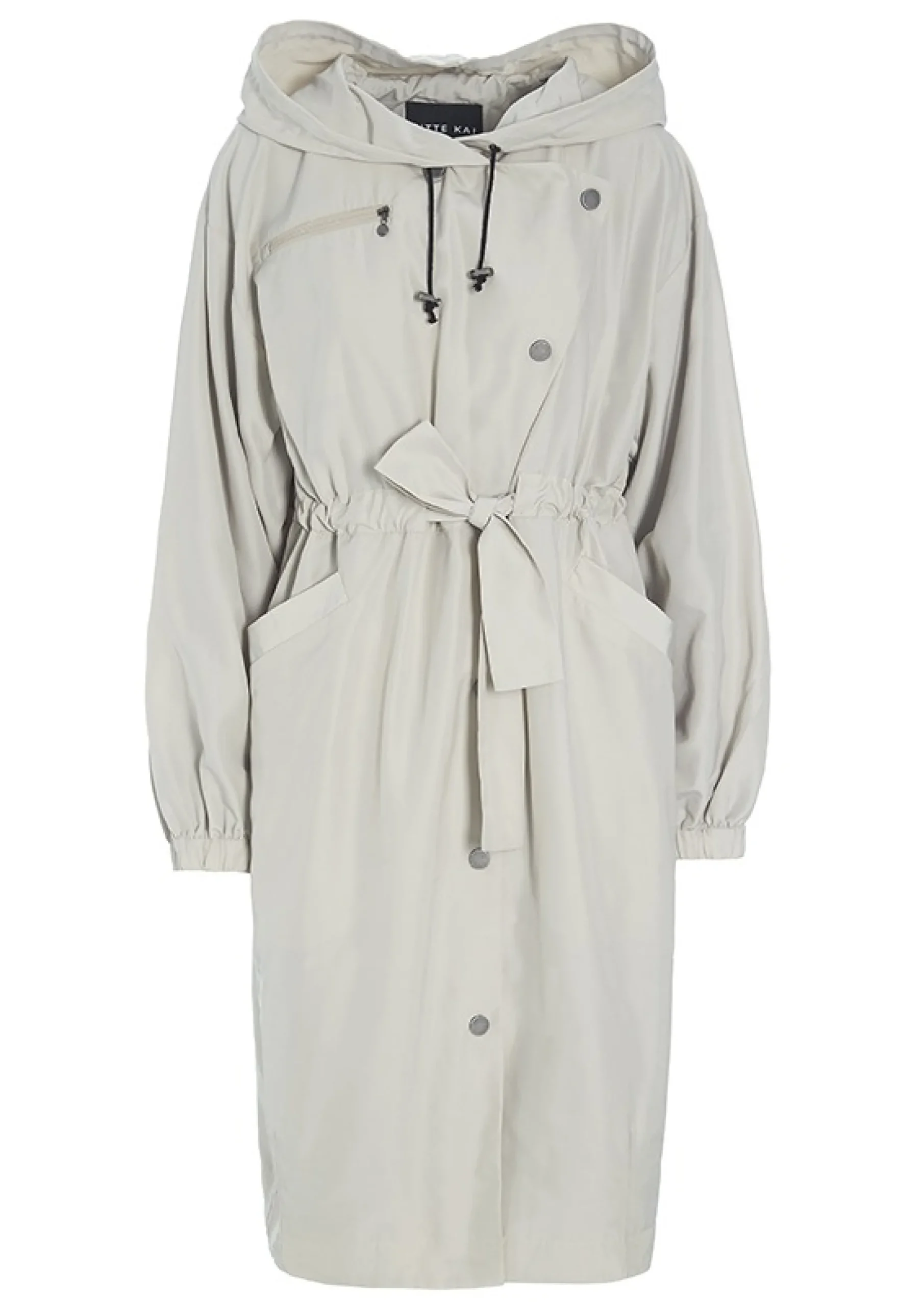 Denne frakke er et virkelig lækkert bud på overtøj til de kølige forårsdage. Du undgår kolde ører, for hætten slutter godt til. Det samme gør ærmerne – ingen kold vind slipper ind. Bæltet i taljen giver en flot og slank silhuet.Modellen på billede er 174 cm og iført str. SFuld længde i str. S, ca. 109 cm.