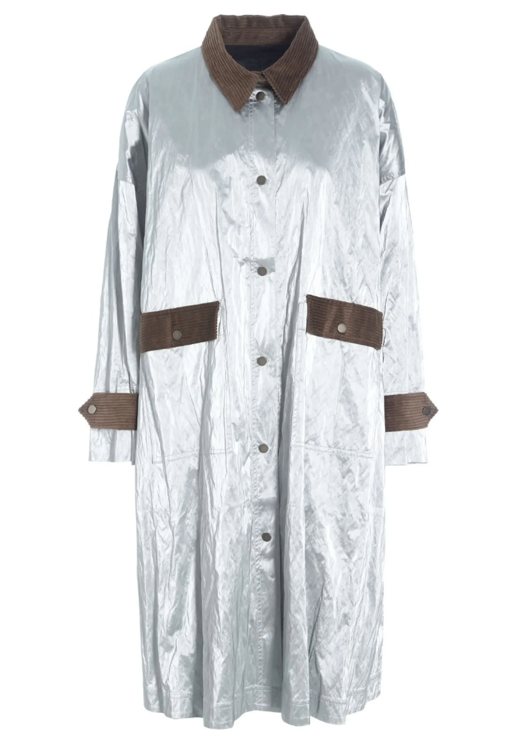 Spillet mellem den kølige sølvoverflade og den bløde bredriflede fløjl giver en lækker kontrast, mens frakkens snit er helt klassisk. Store påsatte lommer med lommeklap i bredriflet fløjl.Modellen på billede er 178 cm og iført str. SFuld længde i str. S, ca. 108 cm.