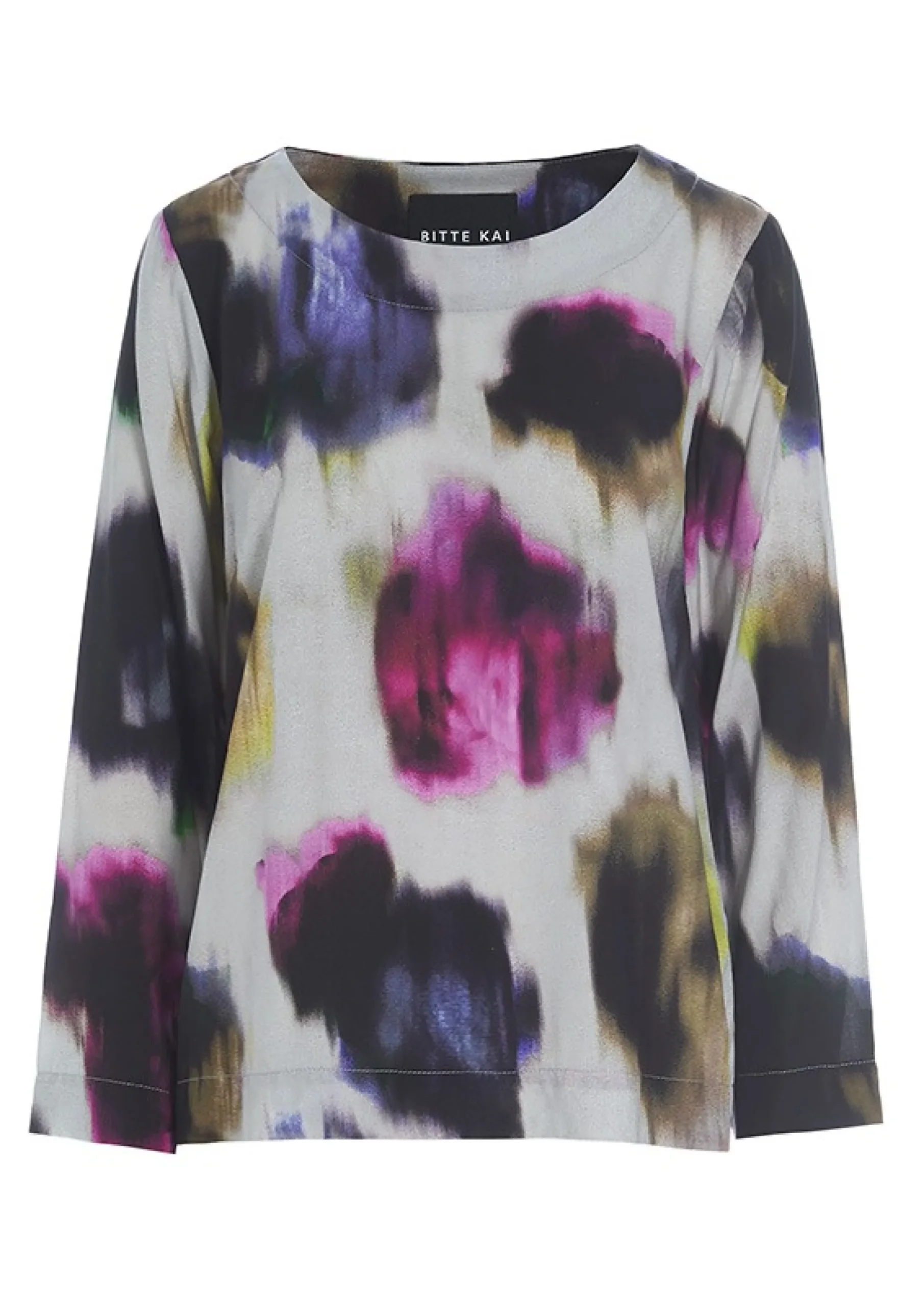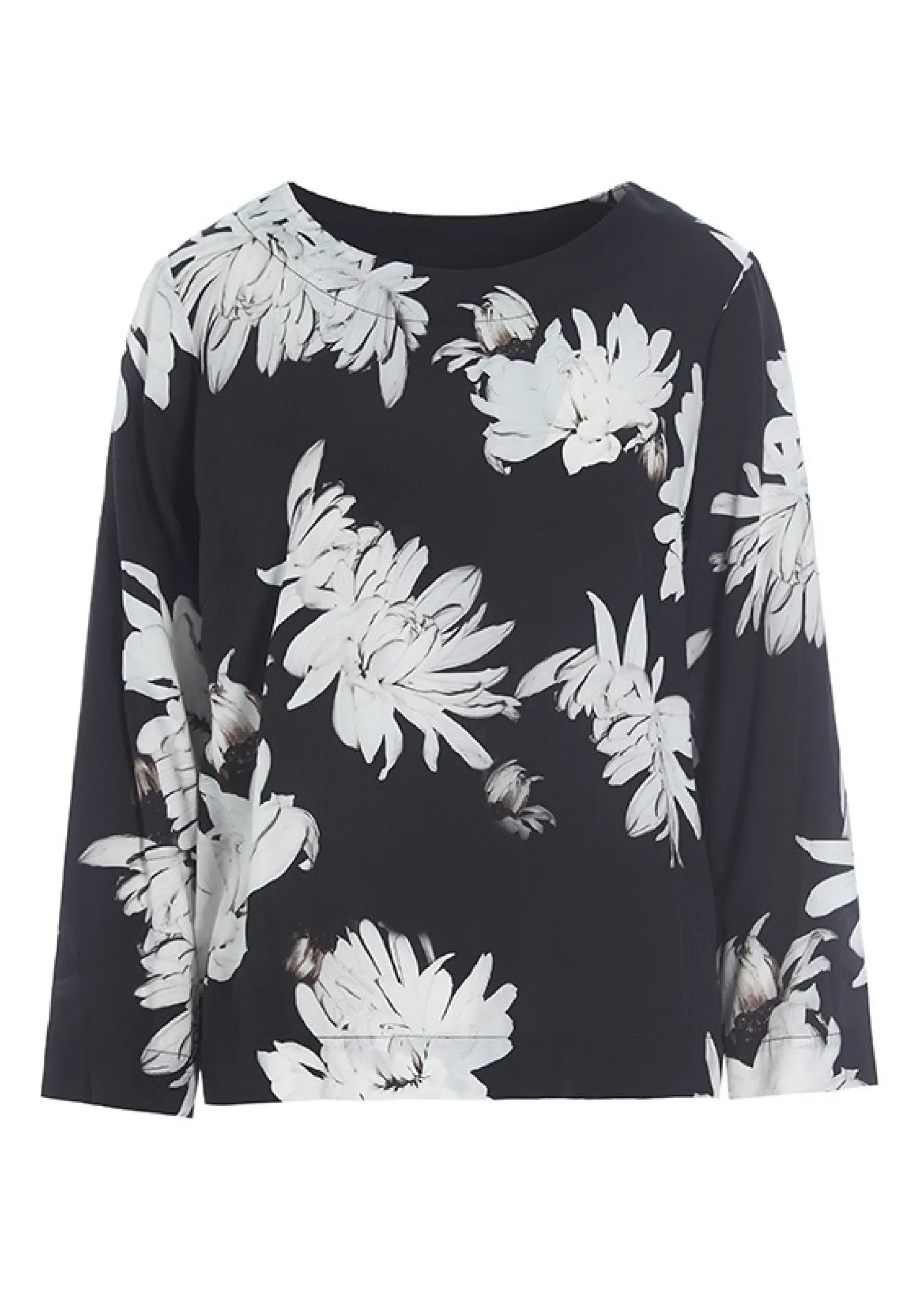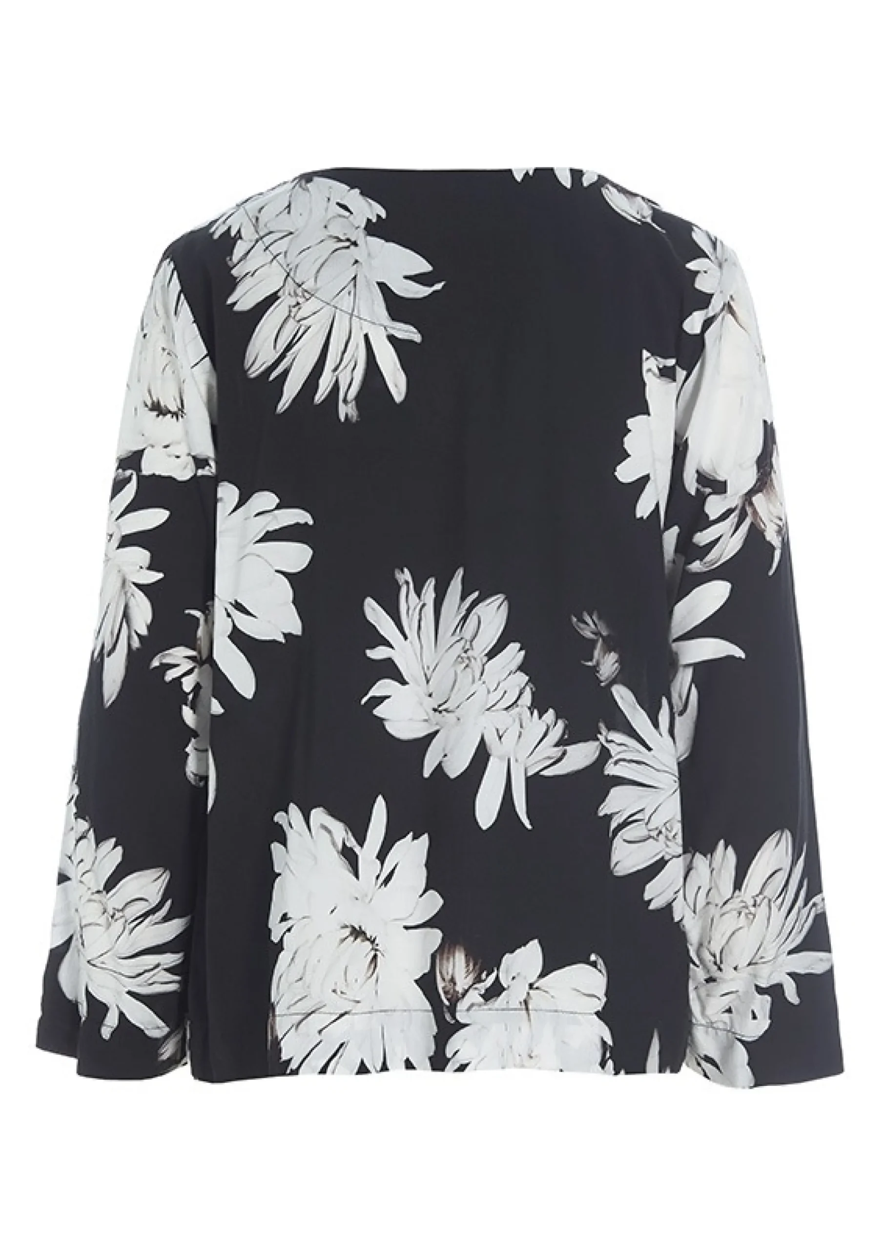 Helt enkel bluse med det smukkeste blomsterprint, der har et enkelt og grafisk islæt. Blusen kan bruges til enhver underdel. Du kan også sætte den sammen med andre mønstre, eller lade den være det eneste spraglede element i dit outfit.Modellen på billede er 178 cm og iført str. SFuld længde i str. S, ca. 62 cm