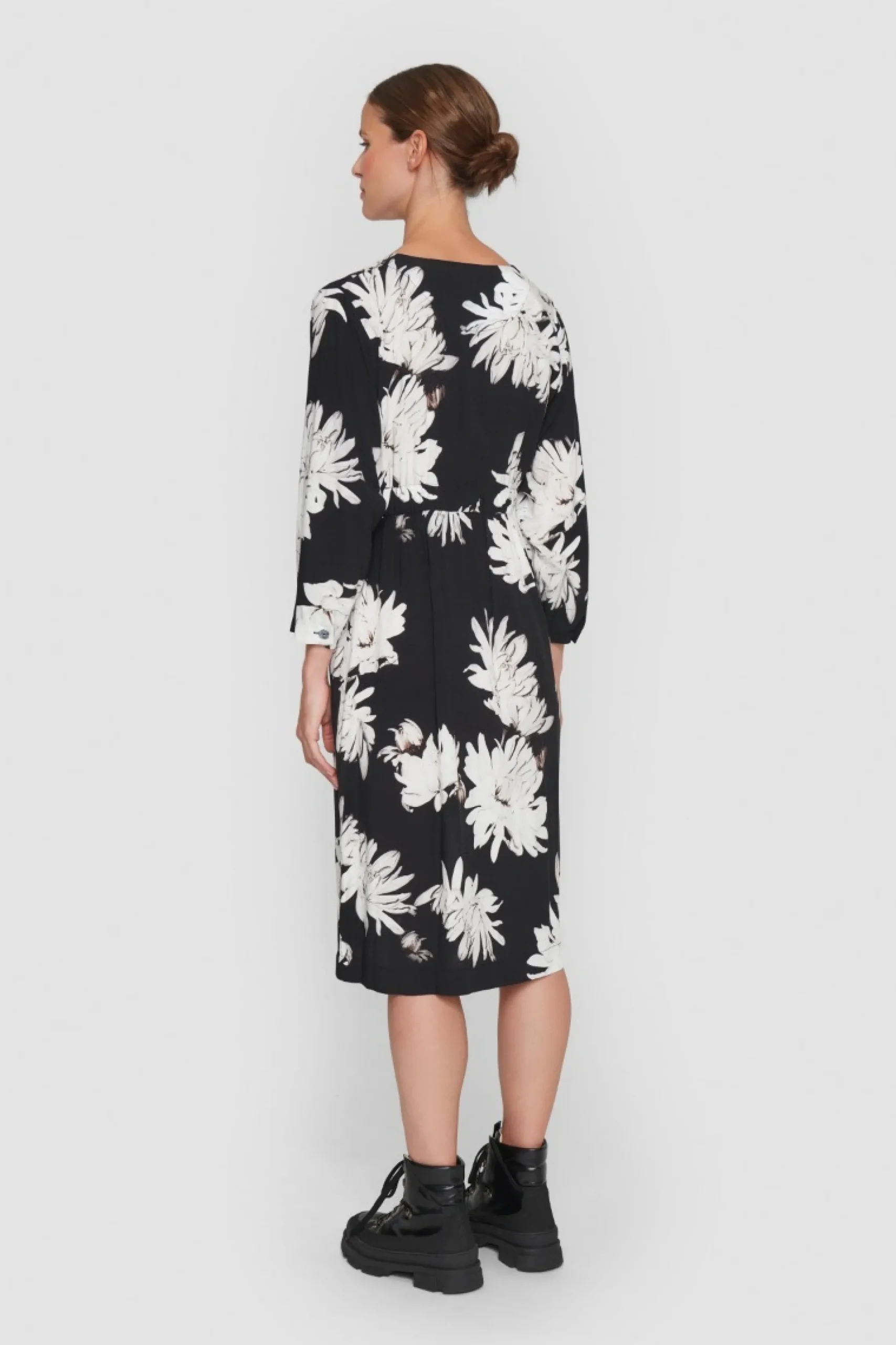 Enkel kjole, der sidder utrolig godt. Der er elastik ved taljen, hvilket giver en flot silhuet. Kjolen har det smukkeste blomsterprint, som er grafisk i sit udtryk. En kjole man altid vil føle sig godt tilpas i – både til hverdag og til en middag i byen.Modellen på billede er 178 cm og iført str. SFuld længde i str. S, ca. 109 cm