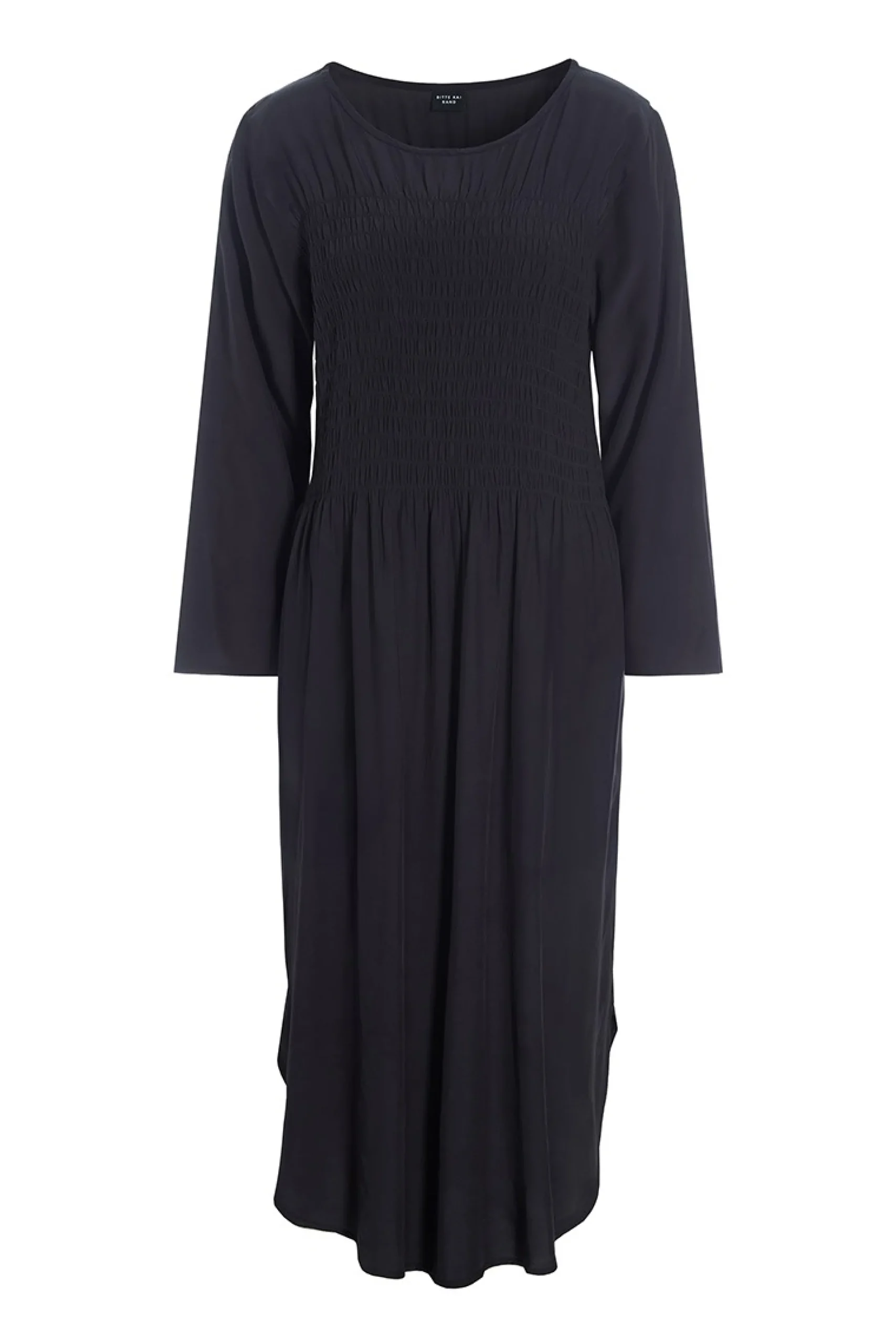 Kjole i en blød og lækker FSC-certificeret viskosekvalitet. Kjolen har smocksyning på overdelen og en mere løstsiddende underdel, hvilket skaber en smuk og feminin silhuet. ærmerne er 3/4-lange, og der er et afrundet for- og bagstykke. Det giver en lethed til designet.Modellen på billede er 180 cm og iført str. SFuld længde i str. S, ca. 120 cm.