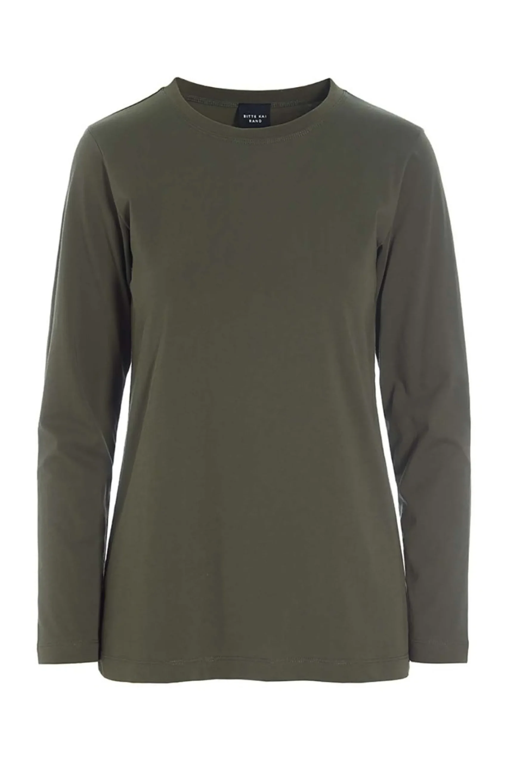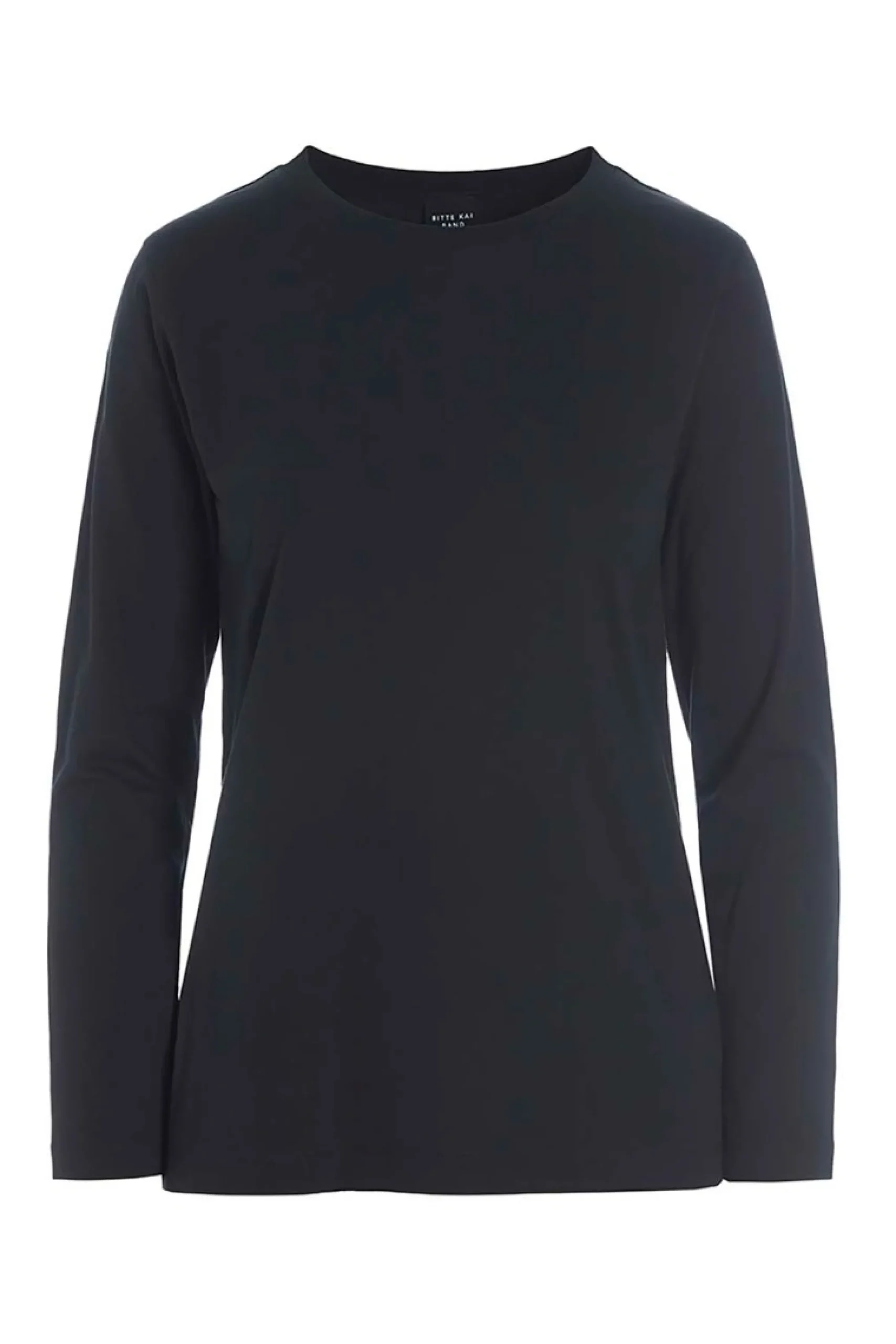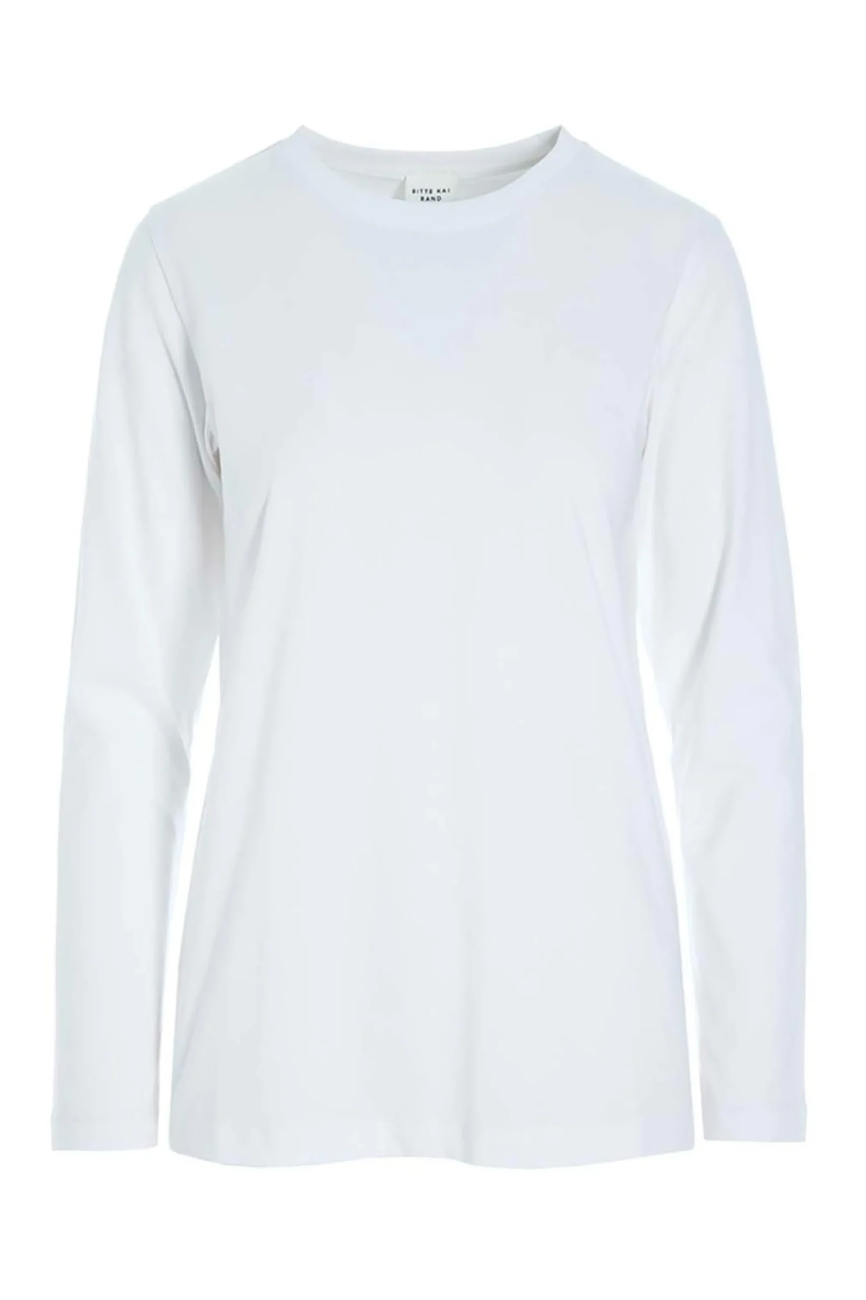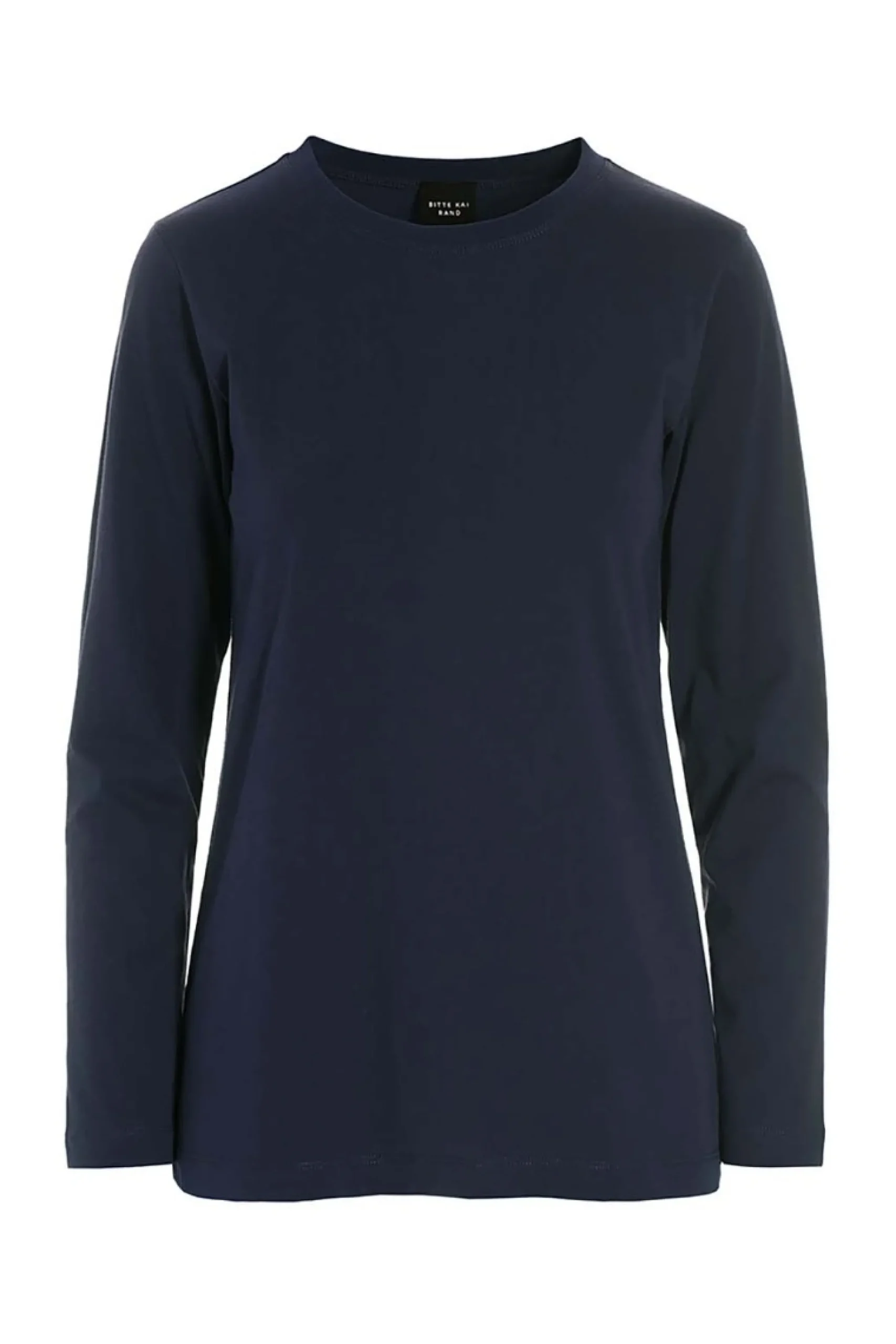 Enkel og lækker basisbluse med lange ærmer. Den er produceret i ren økologisk bomuld af høj kvalitet, hvilket gør, at den sidder godt og holder formen.Modellen på billede er 180 cm og iført str. SFuld længde i str. S, ca. 66 cm.