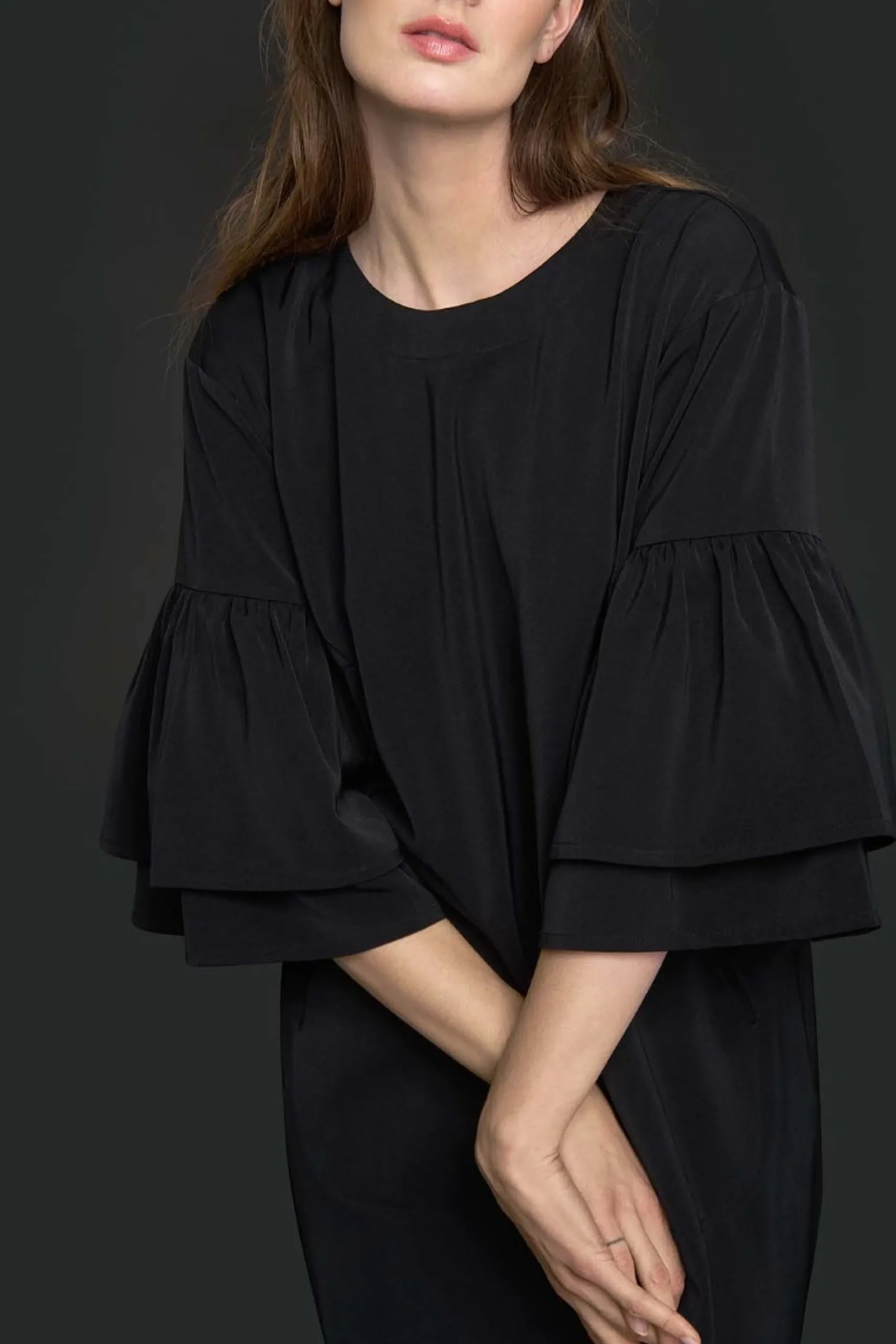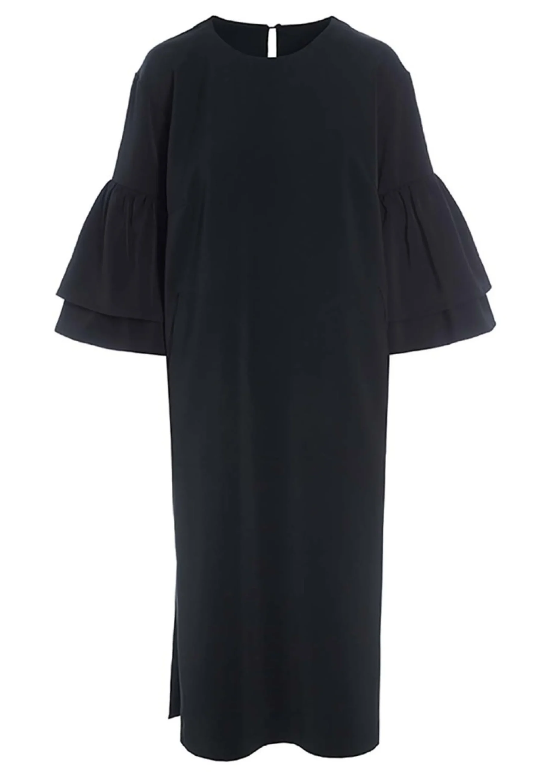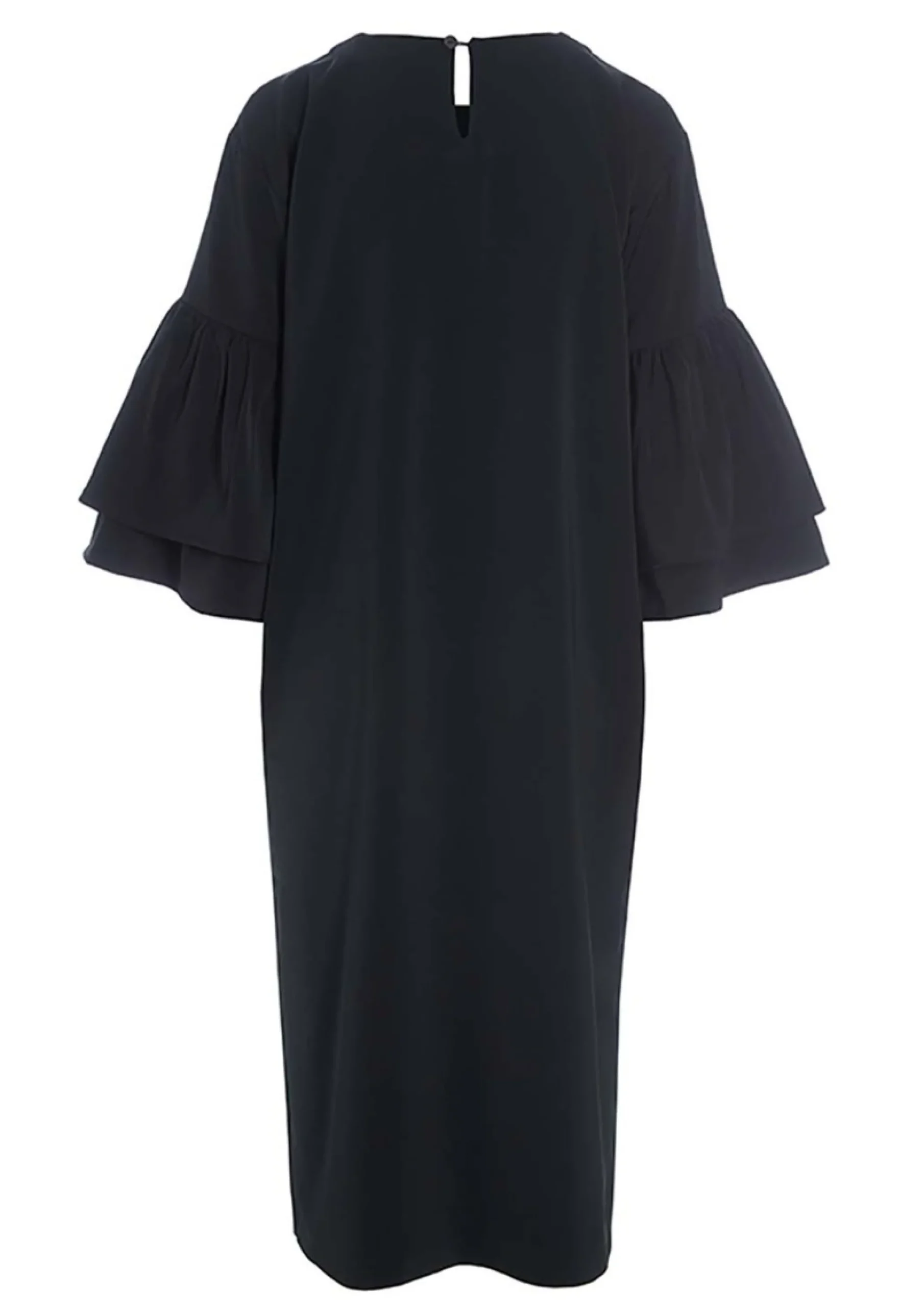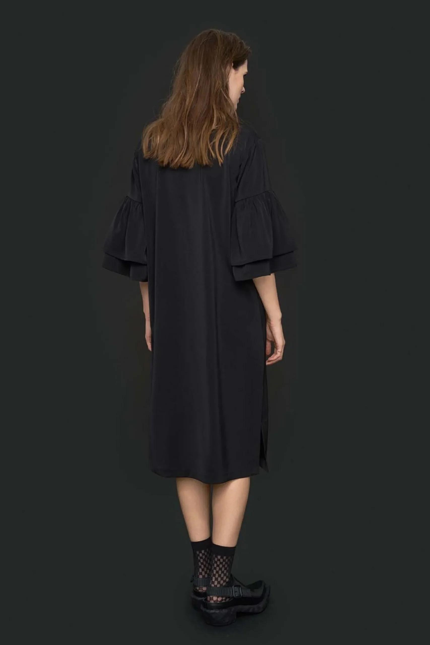 Kjole med et superenkelt snit, dog med dobbelt lag brede flæser på ærmerne, som giver en flot og festlig effekt. Lad den smukke kjole tale for sig selv, og tilsæt blot sko og strømper efter humør.Modellen på billede er 180 cm og iført str. SFuld længde i str. S, ca. 116 cm.