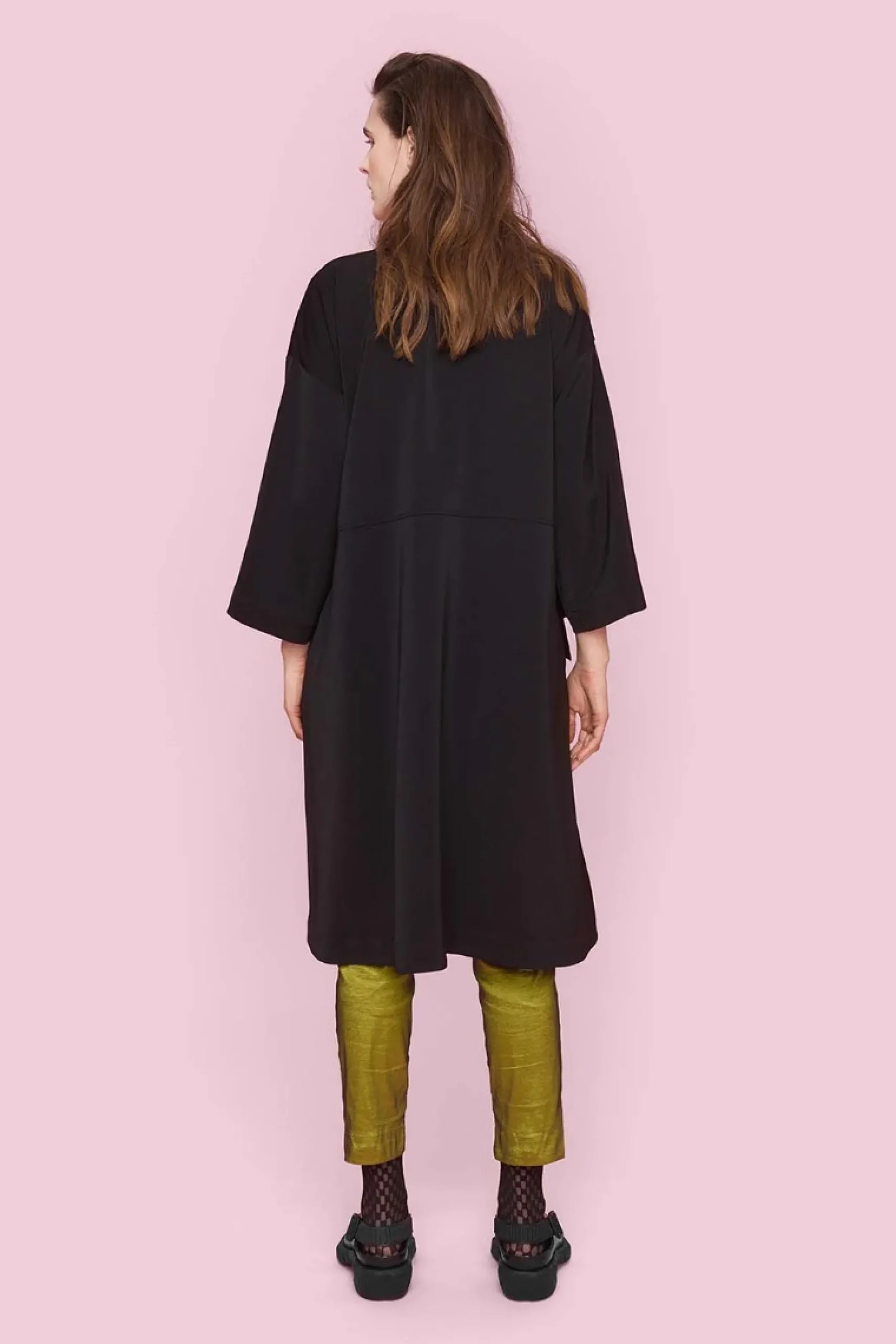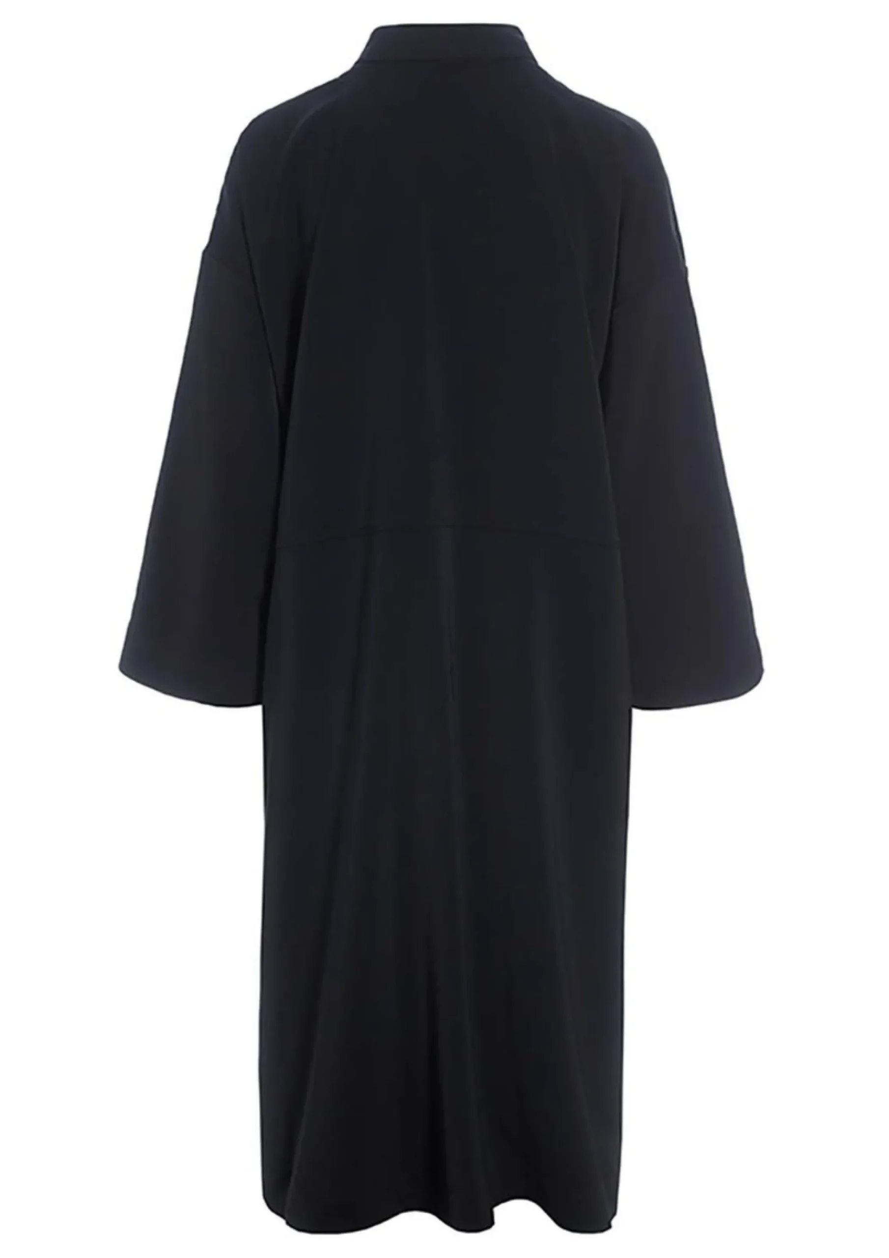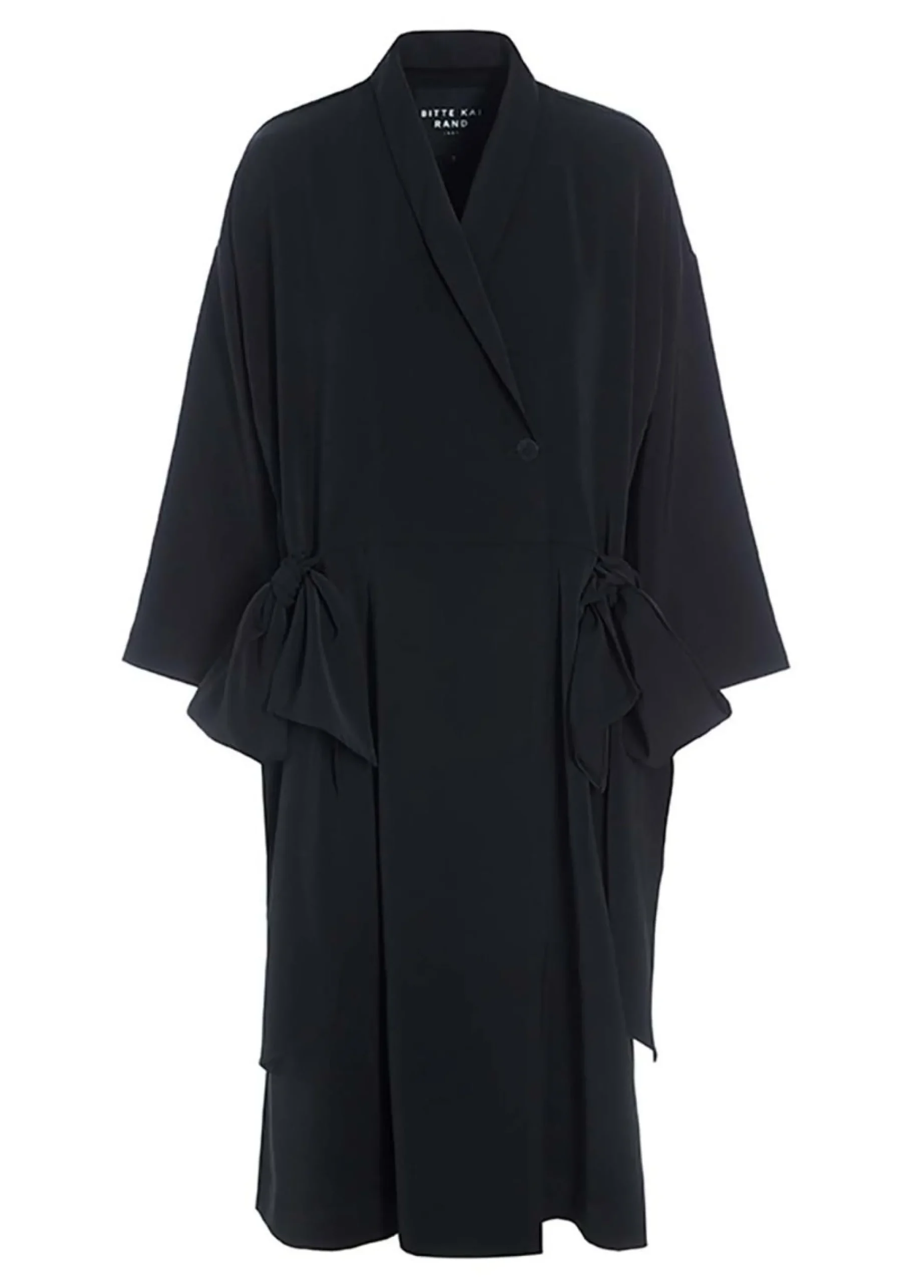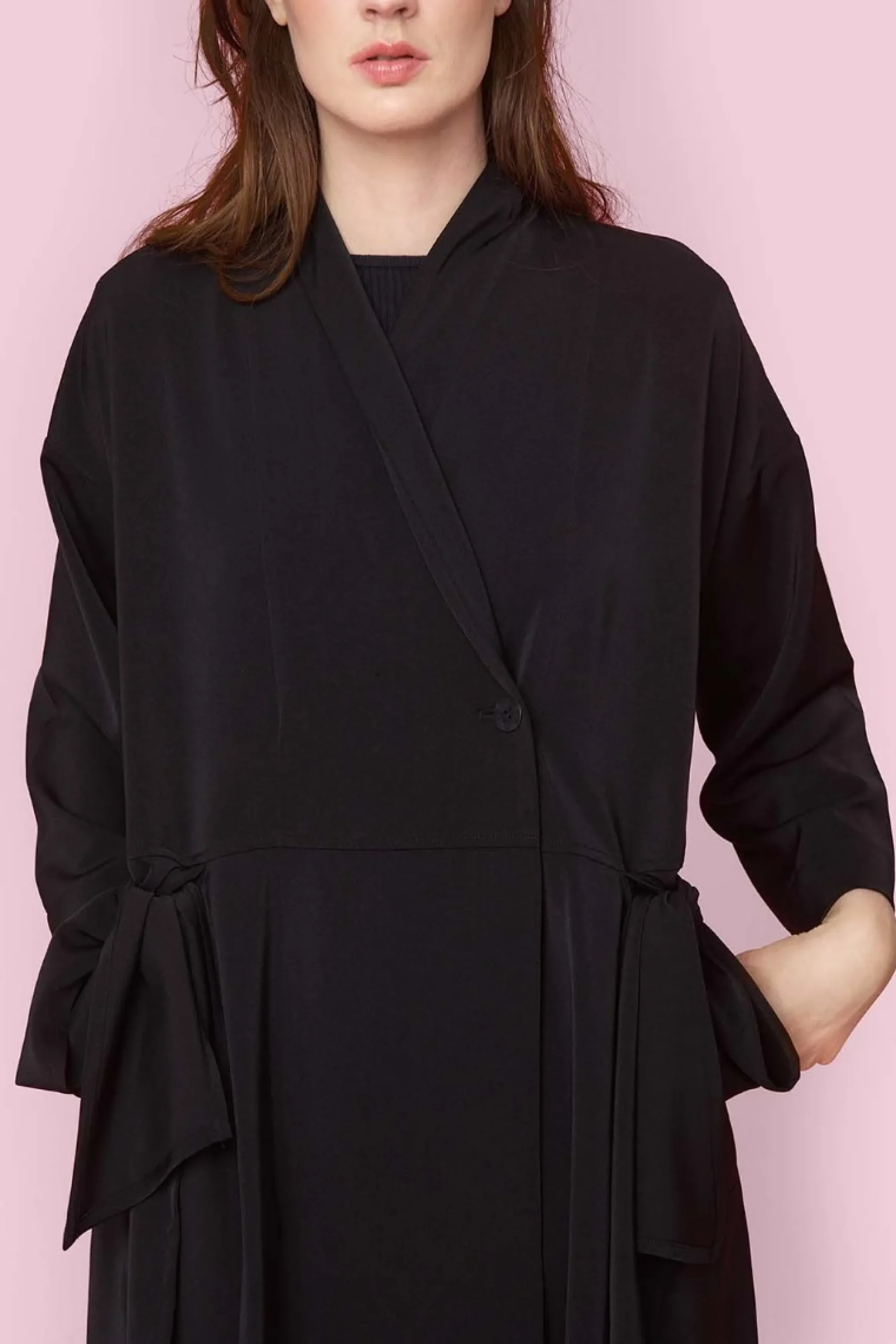 Smuk frakkekjole, der giver mange stylingmuligheder. Frakkekjolen er lukket med en enkelt knap og har store dekorative sløjfer i siderne. Brug den som en kjole over et par tætsiddende bukser, eller bær den åbentstående som en frakke med fx en kjole under.Modellen på billede er 180 cm og iført str. 1Fuld længde i str. 1, ca. 108 cm. Fit: Oversize