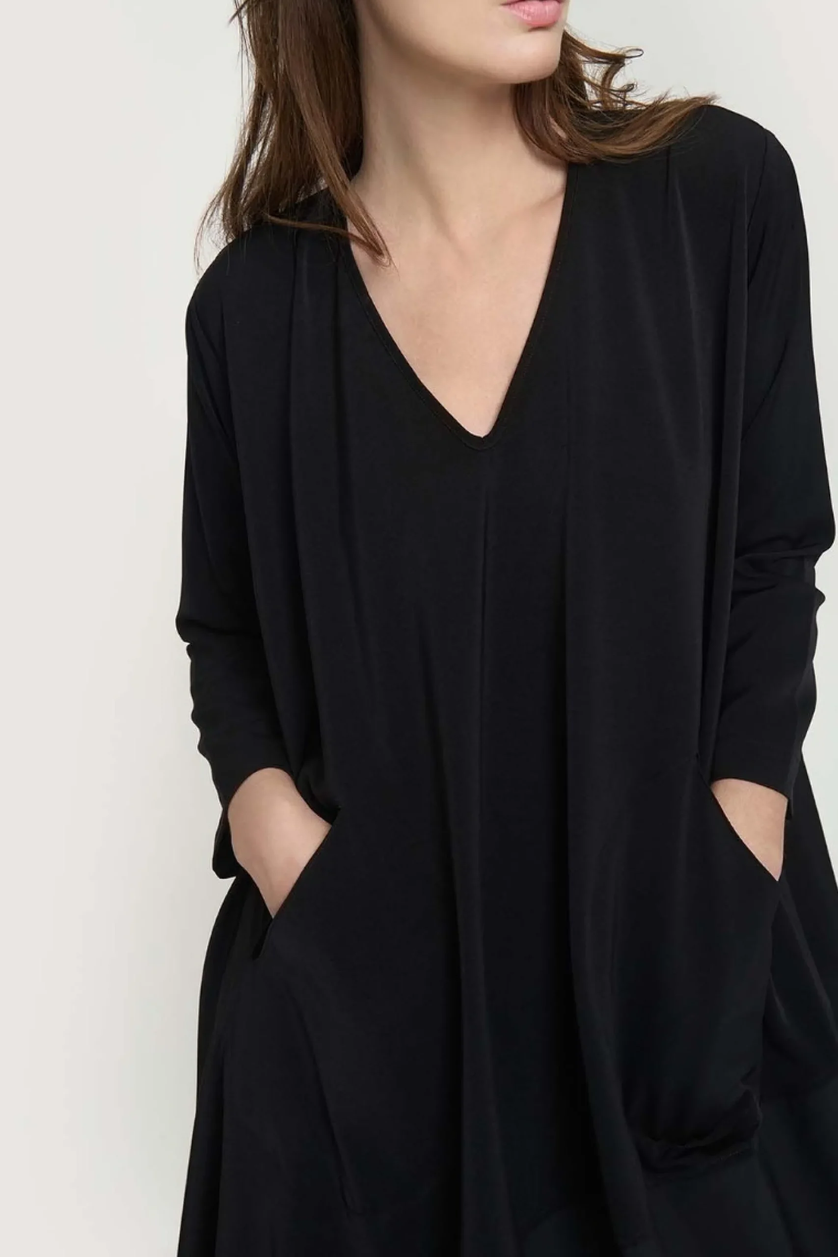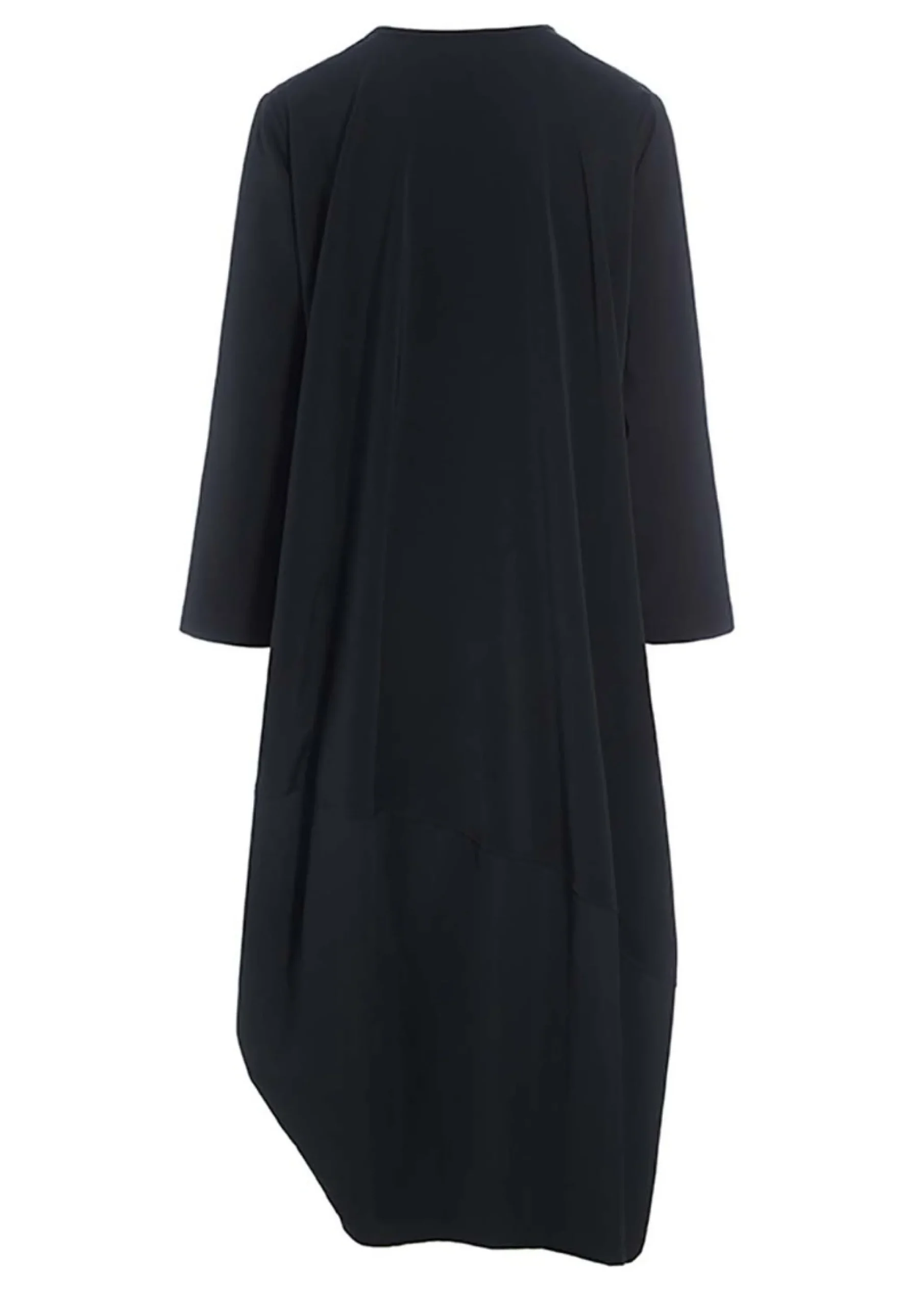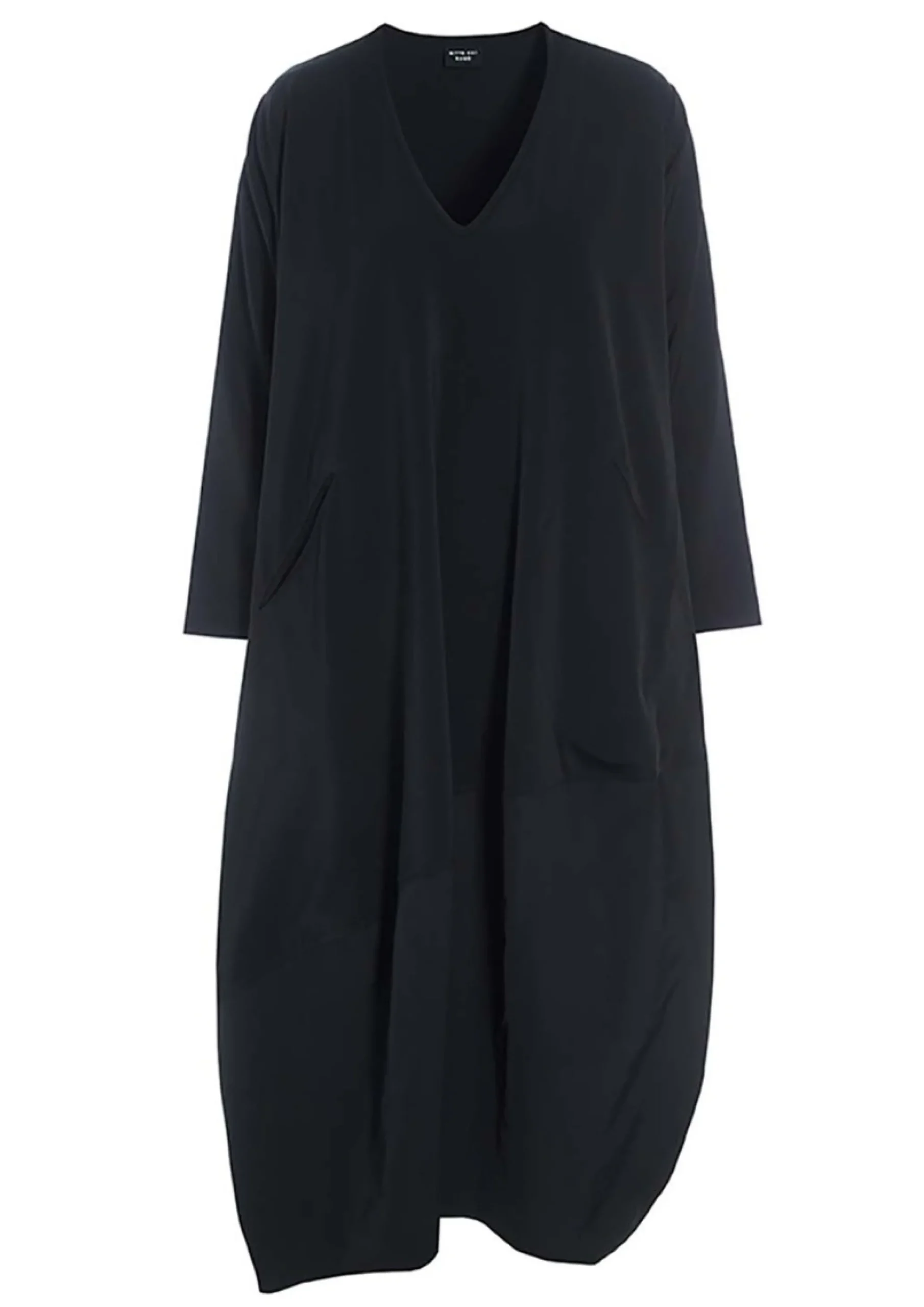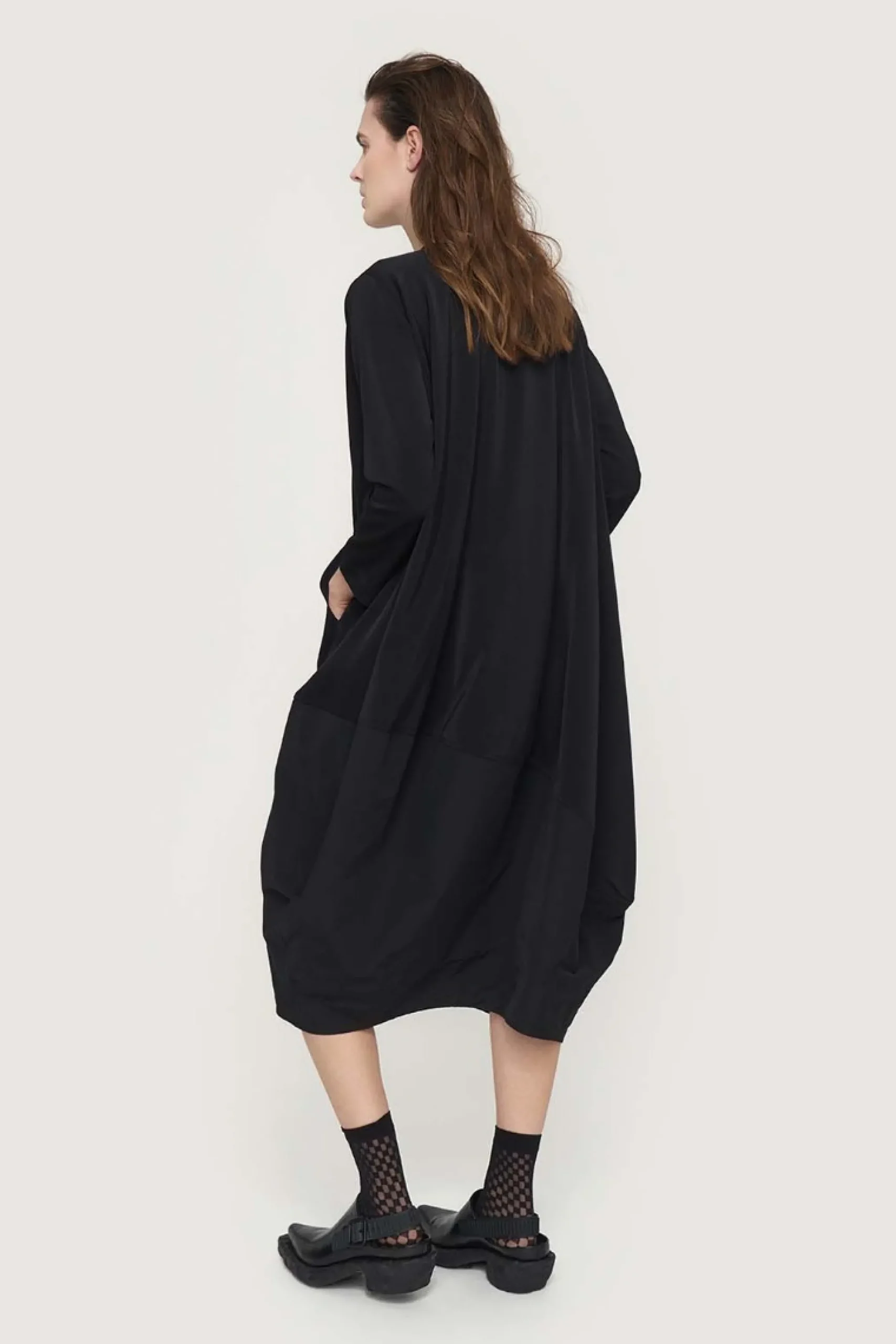 Oversize kjole med et anderledes, asymmetrisk snit på skørtet, der snævrer lidt ind forneden, hvilket får det bløde stof til at falde smukt om kroppen. Den asymmetriske form giver kjolen et næsten skulpturelt udtryk. Forneden er kjolen kombineretmed et stykke taft, der giver et spil mellem de to sorte kvaliteter. Det er oplagt at lade kjolen tale for sig selv og kun tilsætte sko og strømper efter humør. Modellen på billede er 180 cm og iført str. 1Fuld længde i str. 1, ca. 123 cm. Fit: Oversize