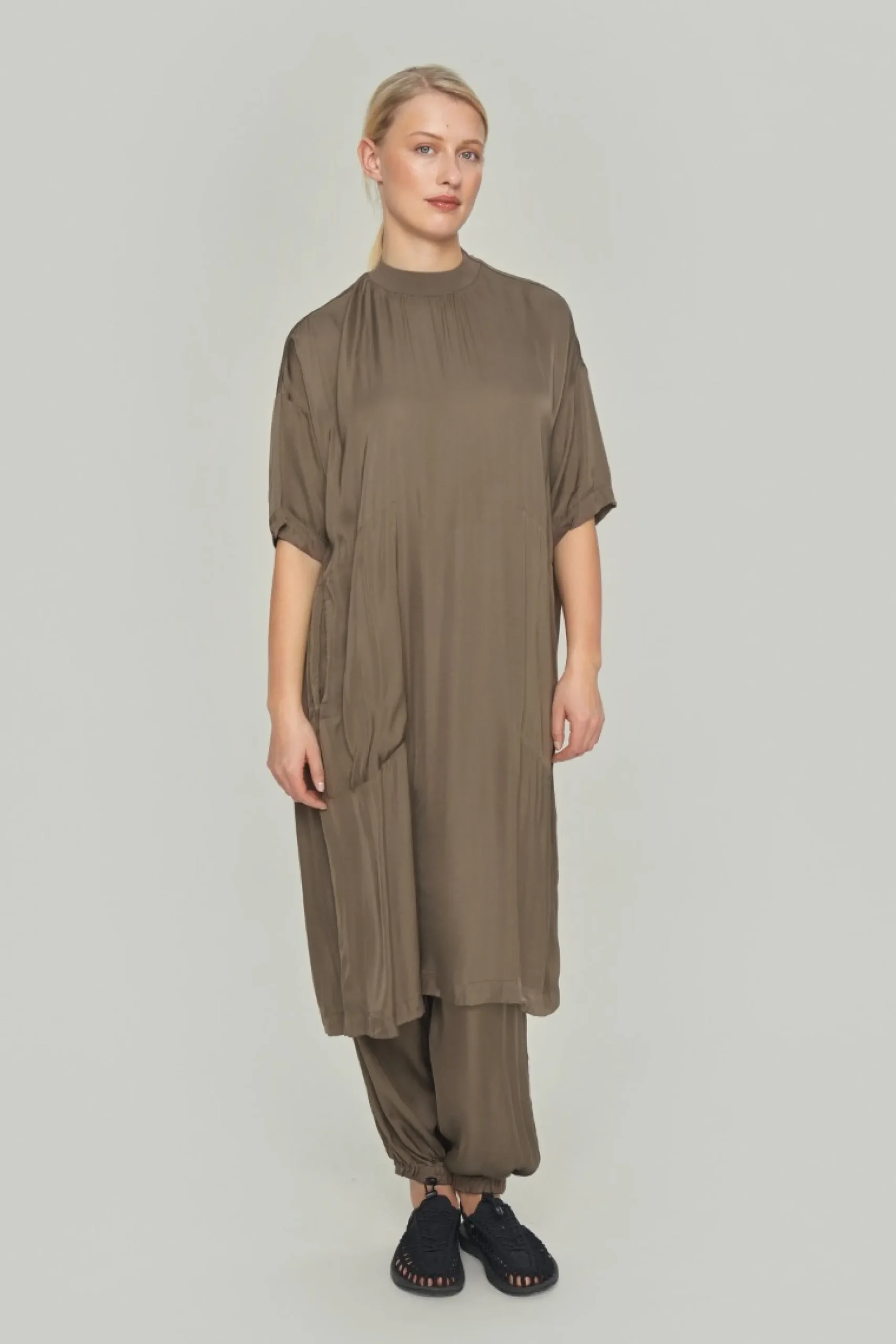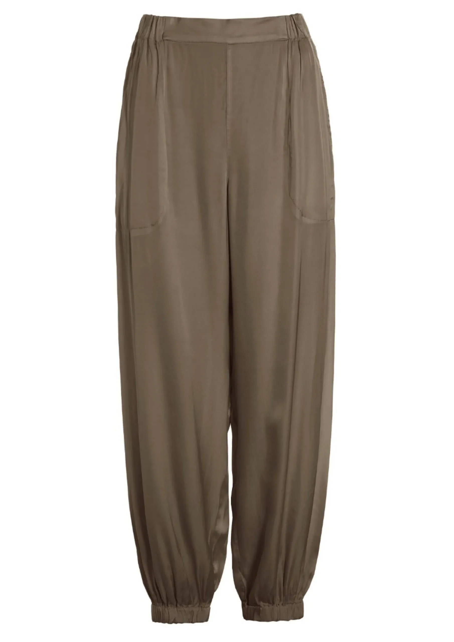 Rummelige bukser i en lækker, blød kvalitet. De sidder godt til italjen og har elastik ved anklerne, hvilket giver en flot poset effekt og gør bukserne meget klædelige.Modellen på billede er 178 cm og iført str. SLængde målt fra taljen i str. S: ca. 99 cm.
