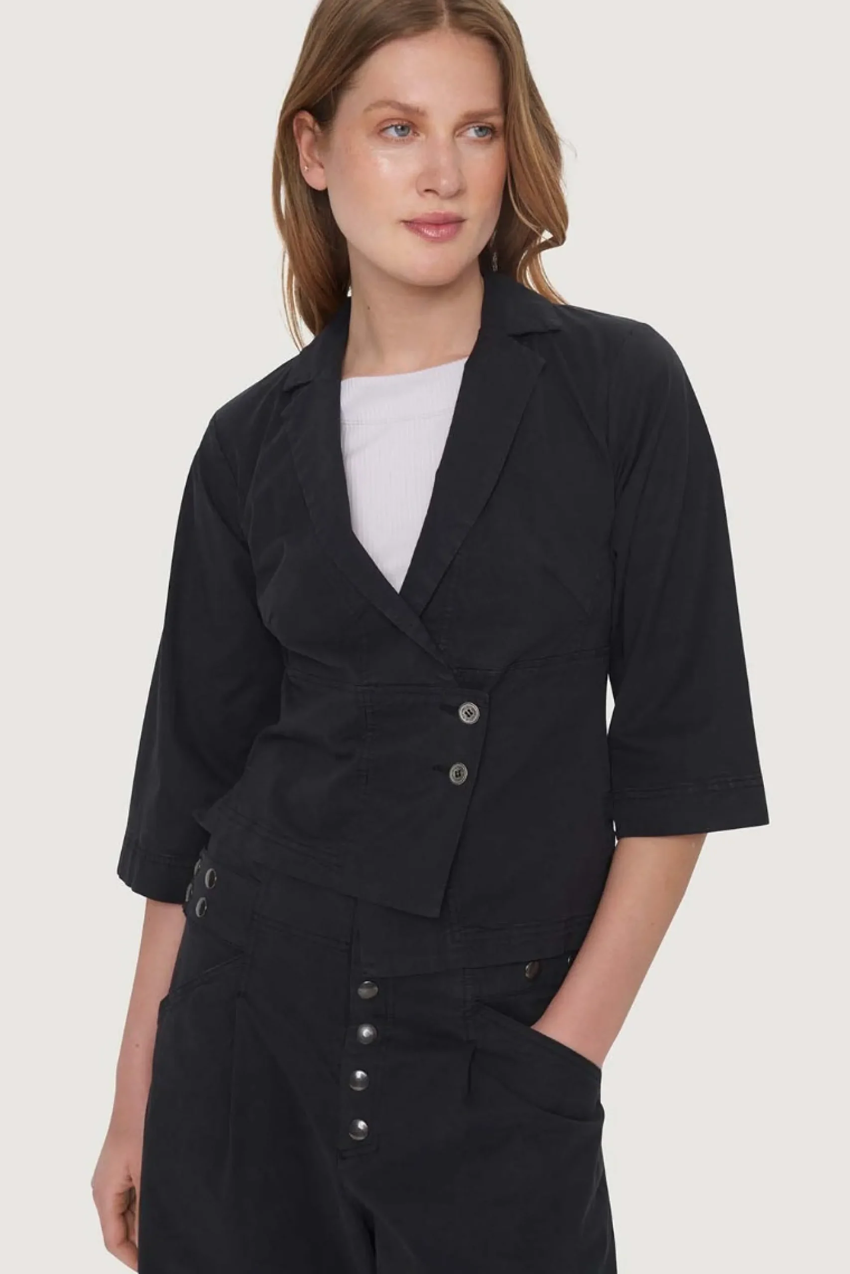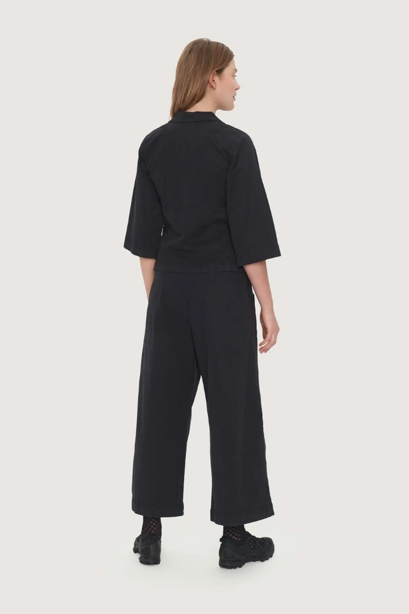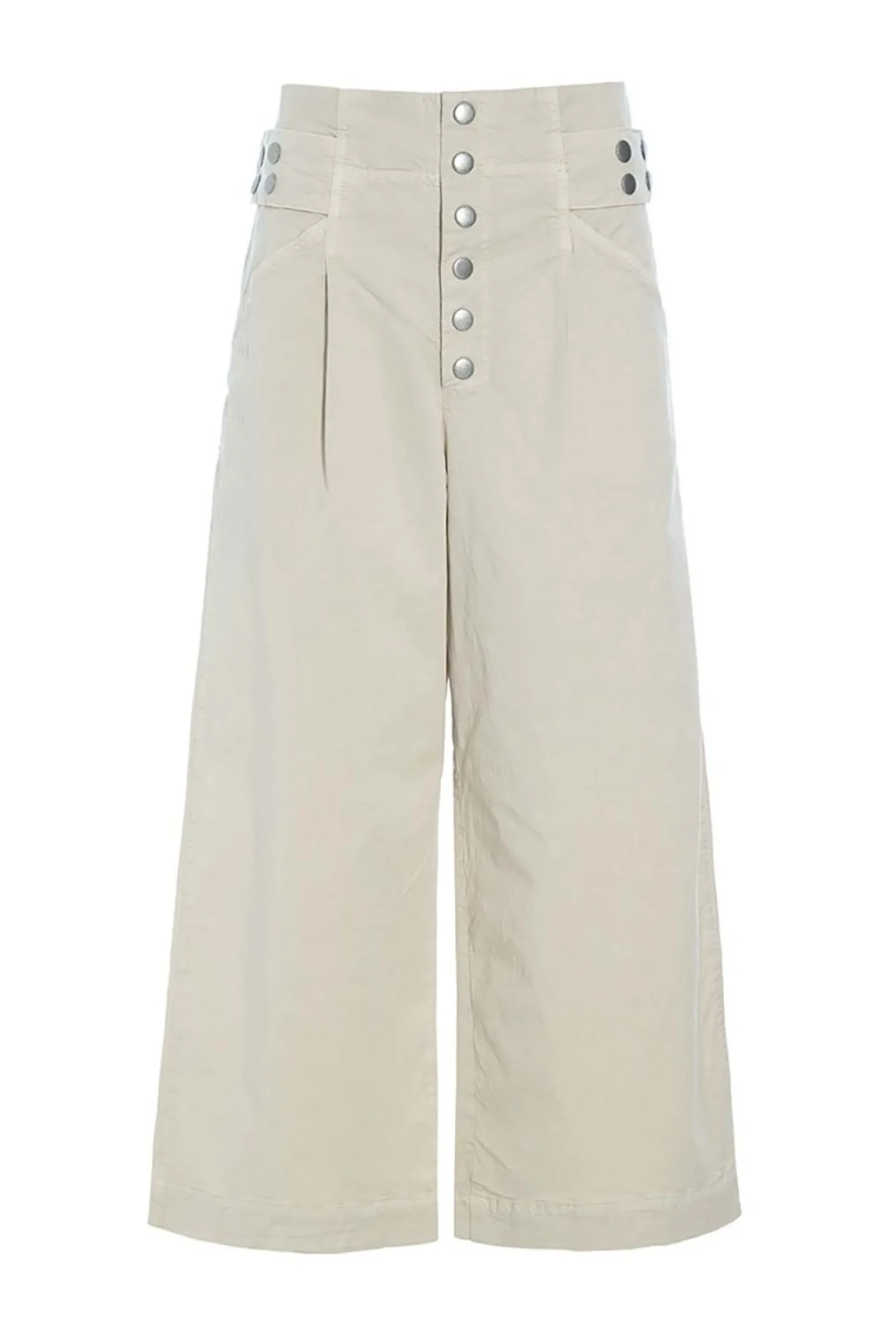 Ved hjælp af knapperne i taljen justeres den lave cool talje til en høj stilren paperbag talje. Bukserne er 3/4-lange, hvilket giver en lethed til designet. Brug bukserne med en knitrende hvid skjorte, sæt en lækker sweater til, eller skab et smukt sæt ved at kombinere bukserne med Wabi jakken med bindebånd.Modellen på billede er 180 cm og iført str. SLængde målt fra taljen i str. S: ca. 94 cm.