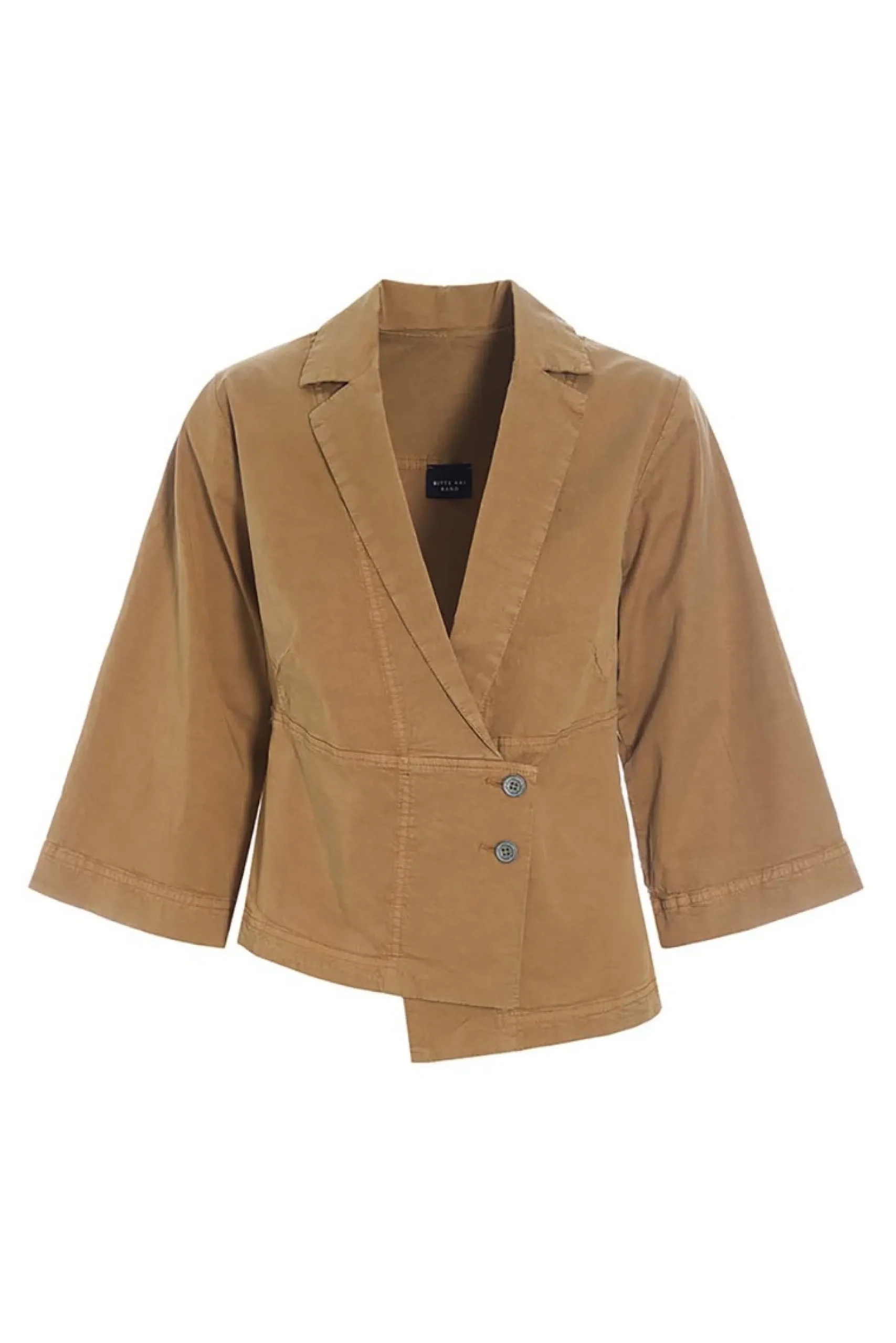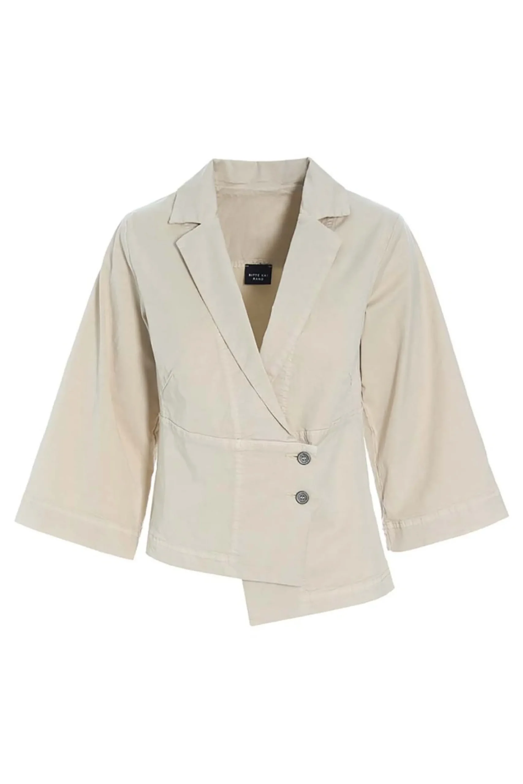 Den asymmetriske lukning giver denne jakke en næsten skulpturel facon, der sammen med det taljerede snit er meget flatterende. Jakken kan tilføre et personligt touch til enhver underdel. Og sætter du den til de matchende Wabi-bukser, får du et meget personligt og klædeligt outfit.Modellen på billede er 180 cm og iført str. SFuld længde i str. S, ca. 64 cm på det længeste sted.